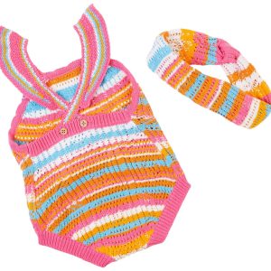 This baby girl 2-piece romper set is made from 100% cotton with delicate crochet detailing for a soft and elegant look. The sleeveless romper features a henley-style front and is paired with a matching headband to complete the outfit. Perfect for warm days, photo shoots, or special occasions, this set blends comfort and charm for your little one.