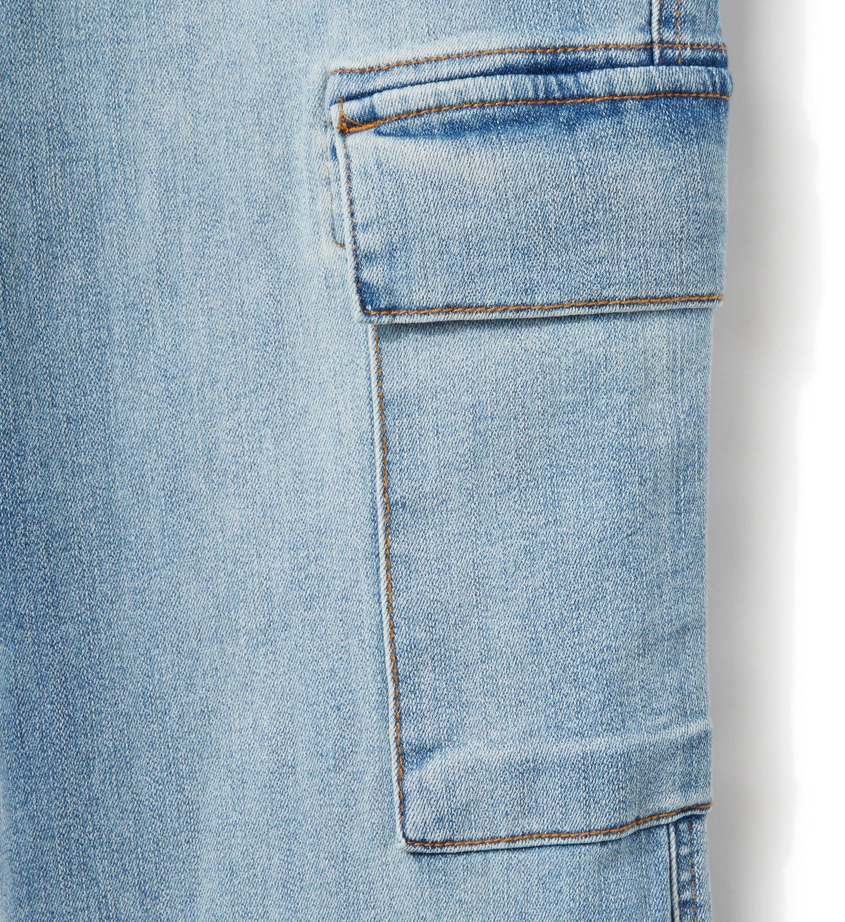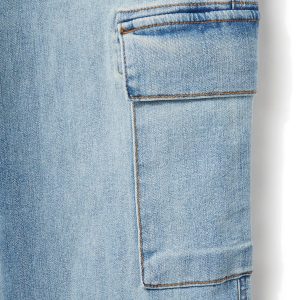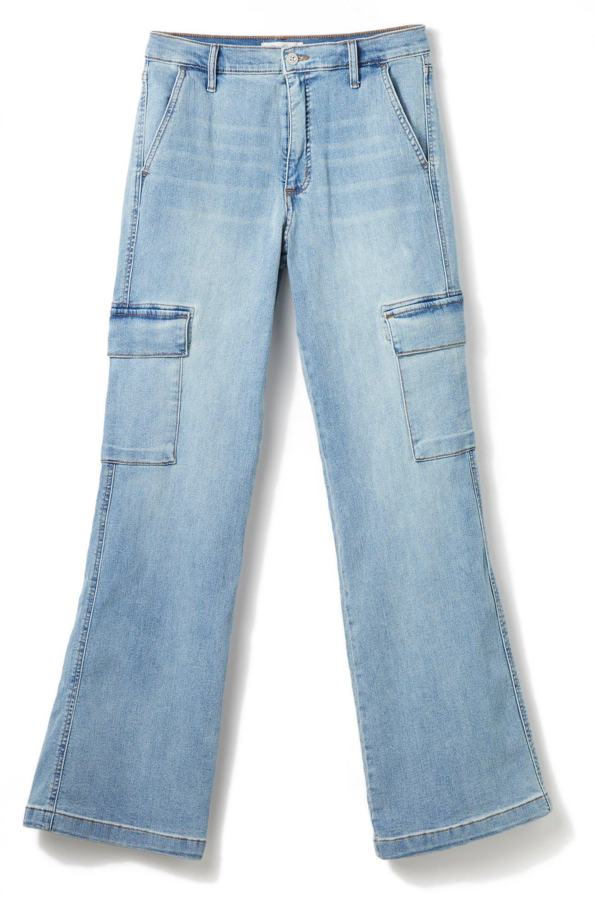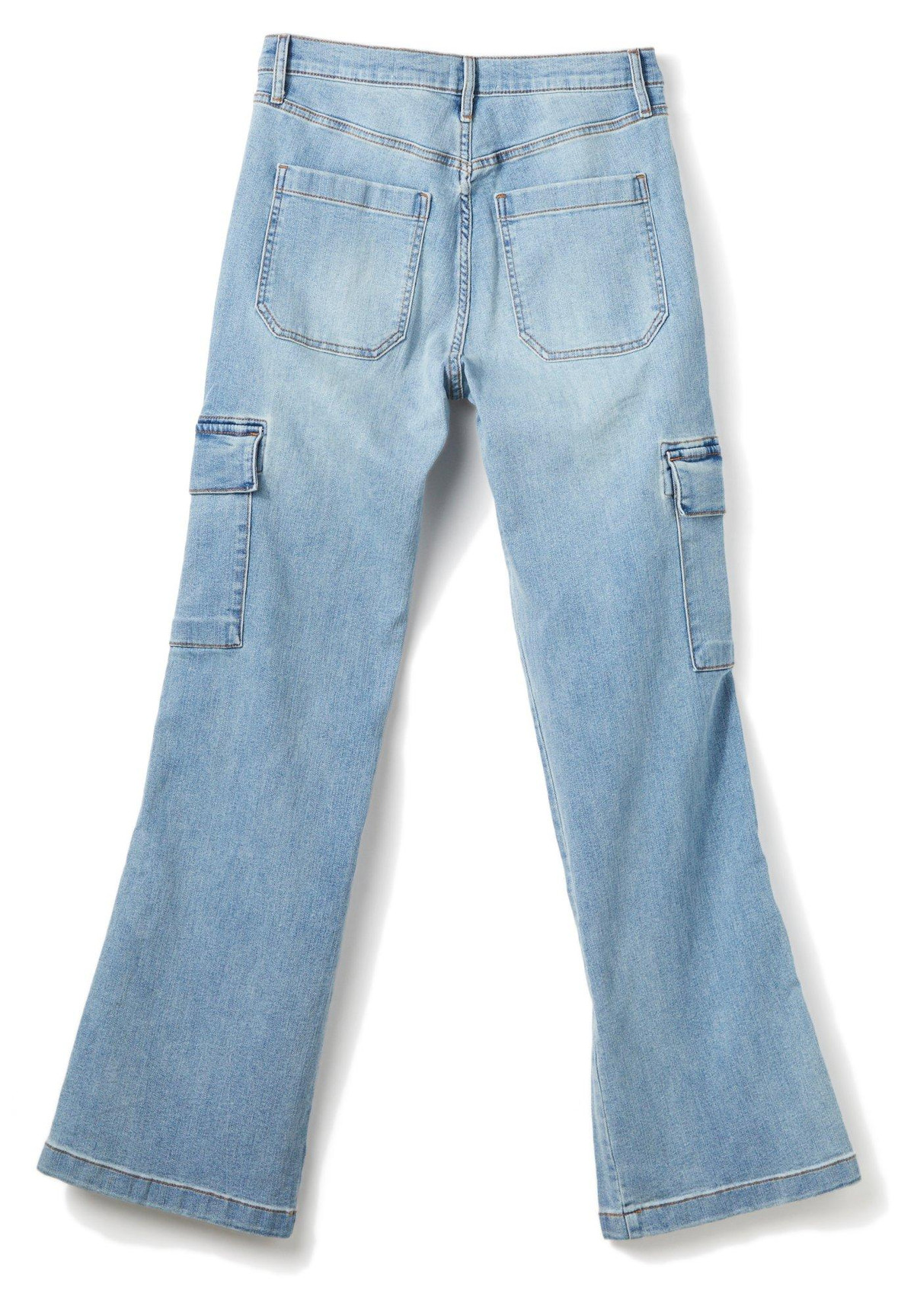 These juniors bootcut denim jeans feature cargo pockets for utility and style. Designed for comfort with a relaxed fit perfect for everyday wear and casual looks. Fabrication is 79% cotton, 20% polyester, and 1% spandex.