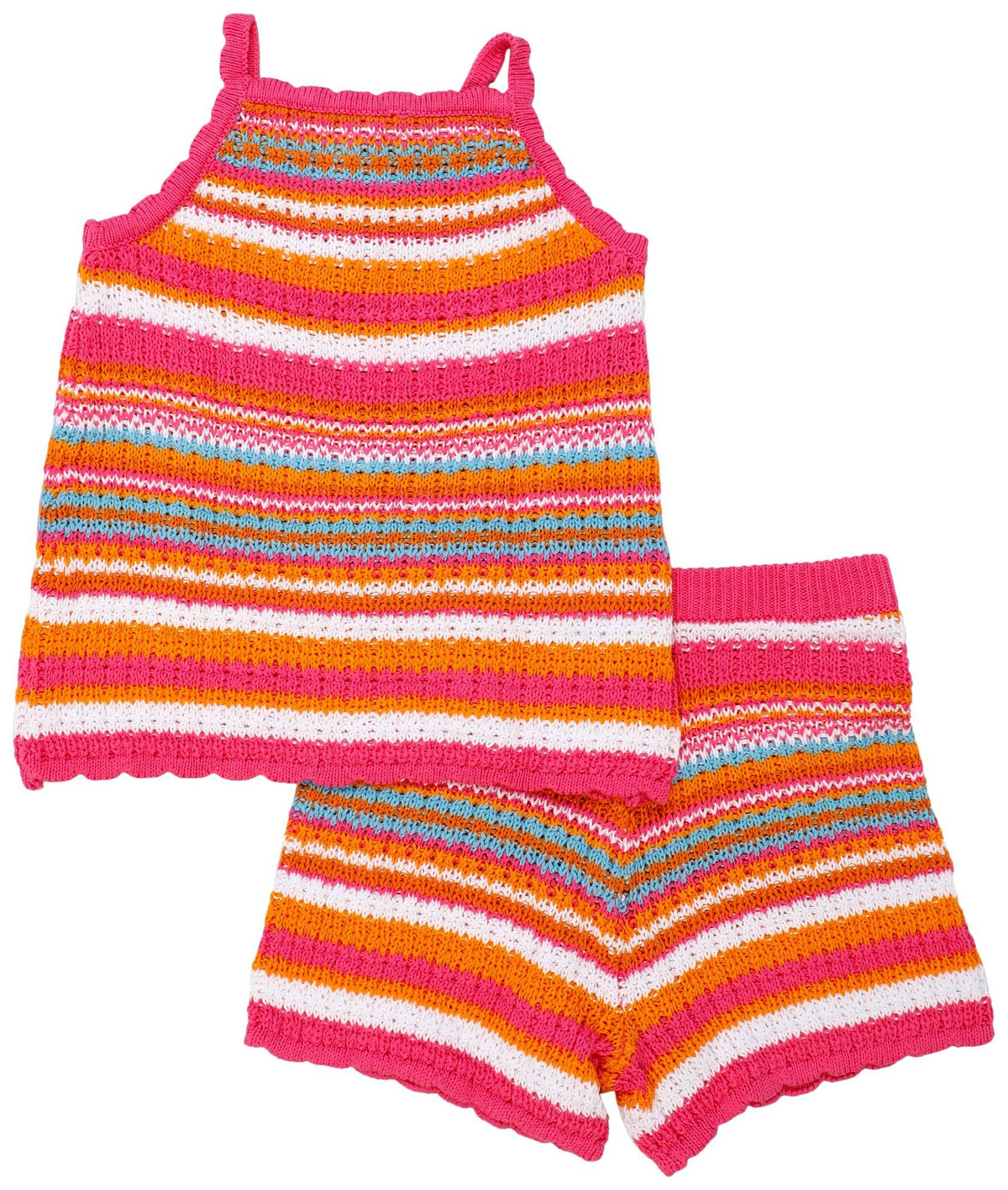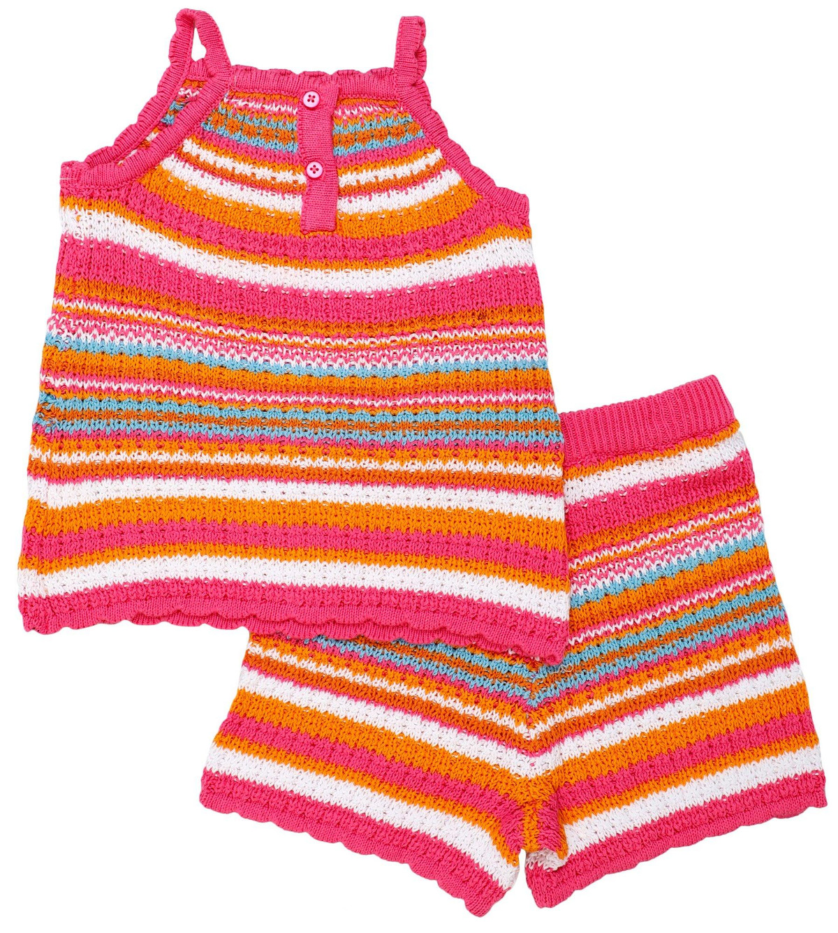 Elevate your child’s summer wardrobe with this chic 2 pc shorts set. Crafted from delicate crochet fabric, this set includes a sleeveless henley front top and matching shorts, offering a perfect blend of style and comfort. The intricate crochet design adds a touch of elegance, while the henley front top provides a customizable fit. Fabrication is: 100% cotton.