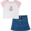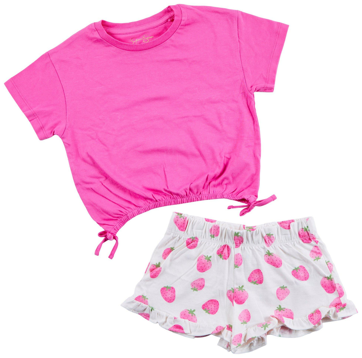 Introducing the Toddler Girls 2 Pc Strawberry Shorts Set, made from a soft blend of cotton and polyester for all-day comfort. This charming set features a solid short sleeve top paired with strawberry print shorts that have an elastic waistband for easy wear. Perfect for playtime or casual outings, this adorable outfit combines style and practicality, making it a delightful addition to your toddler’s wardrobe.