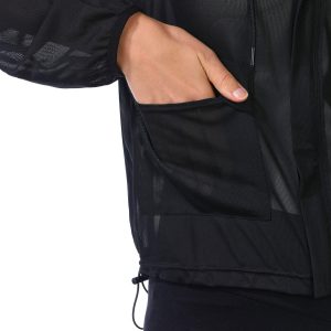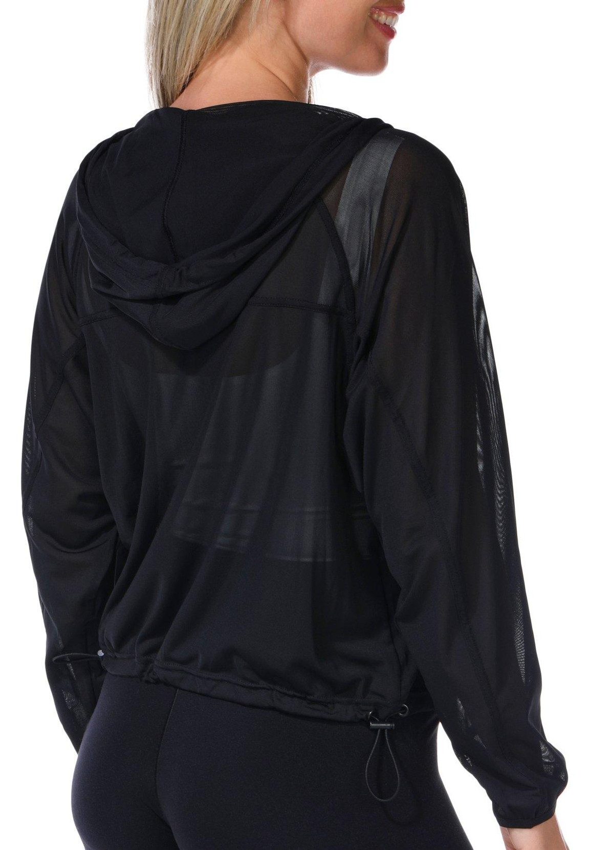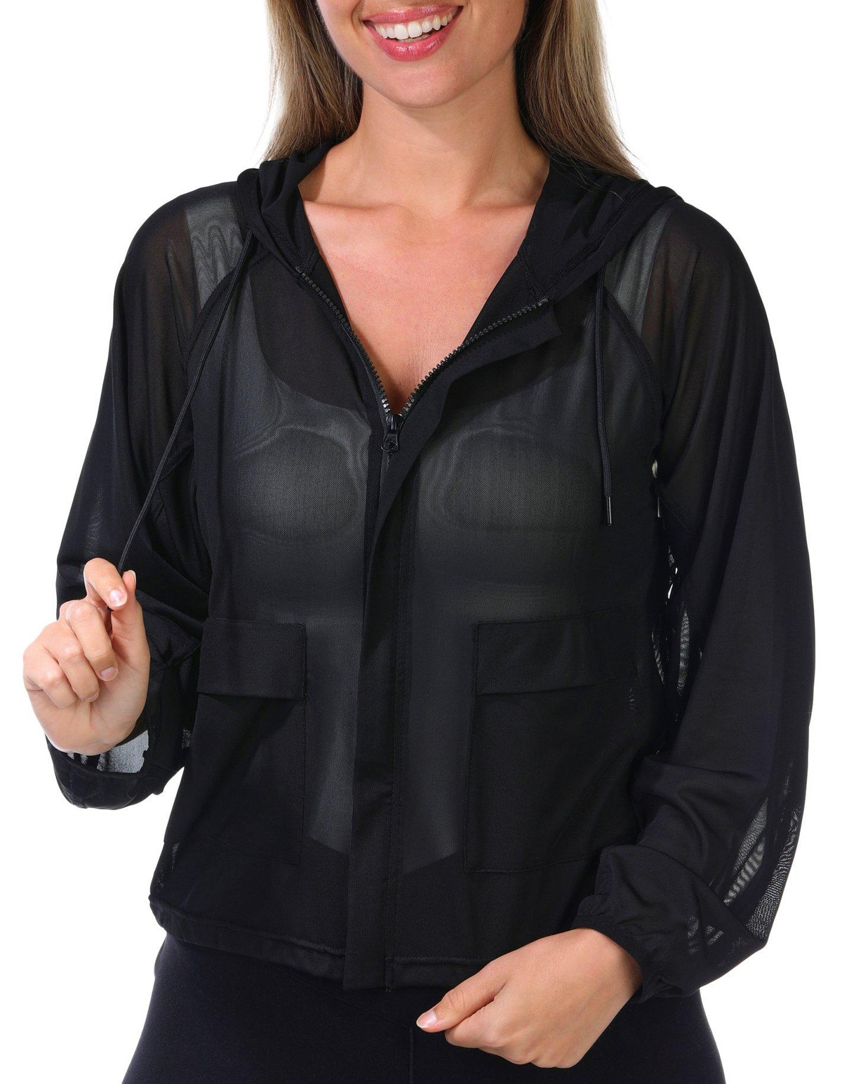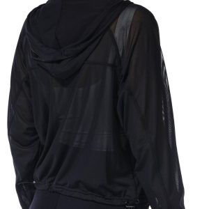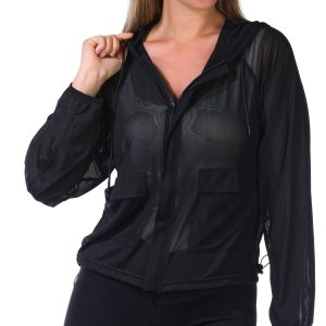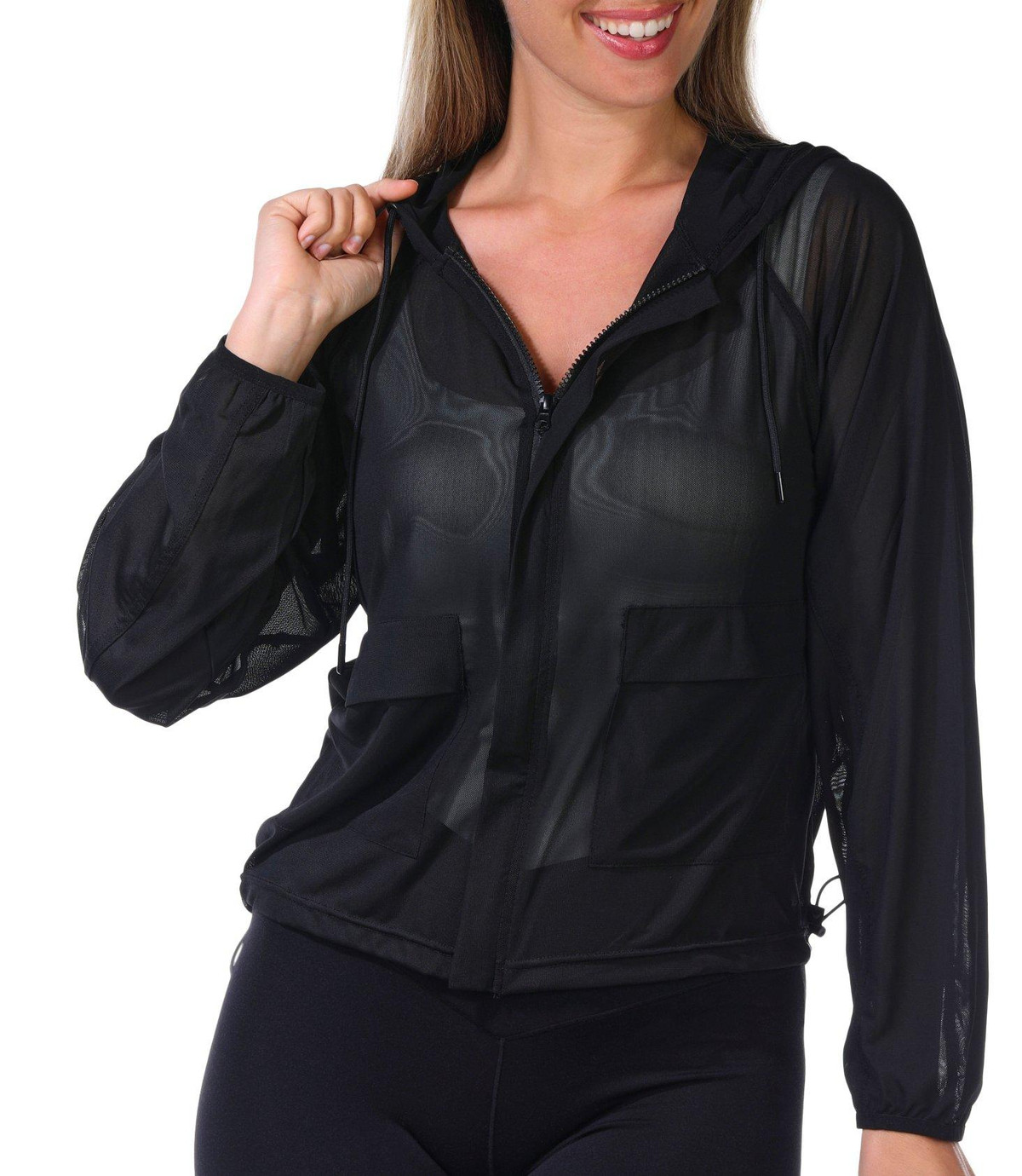 This women’s active mesh windbreaker features a solid color, long sleeves, and a hooded neckline. Made with breezy mesh fabric and a full front zip closure, it offers lightweight coverage and breathable comfort for active days. Fabrication 90% polyester, 10% spandex