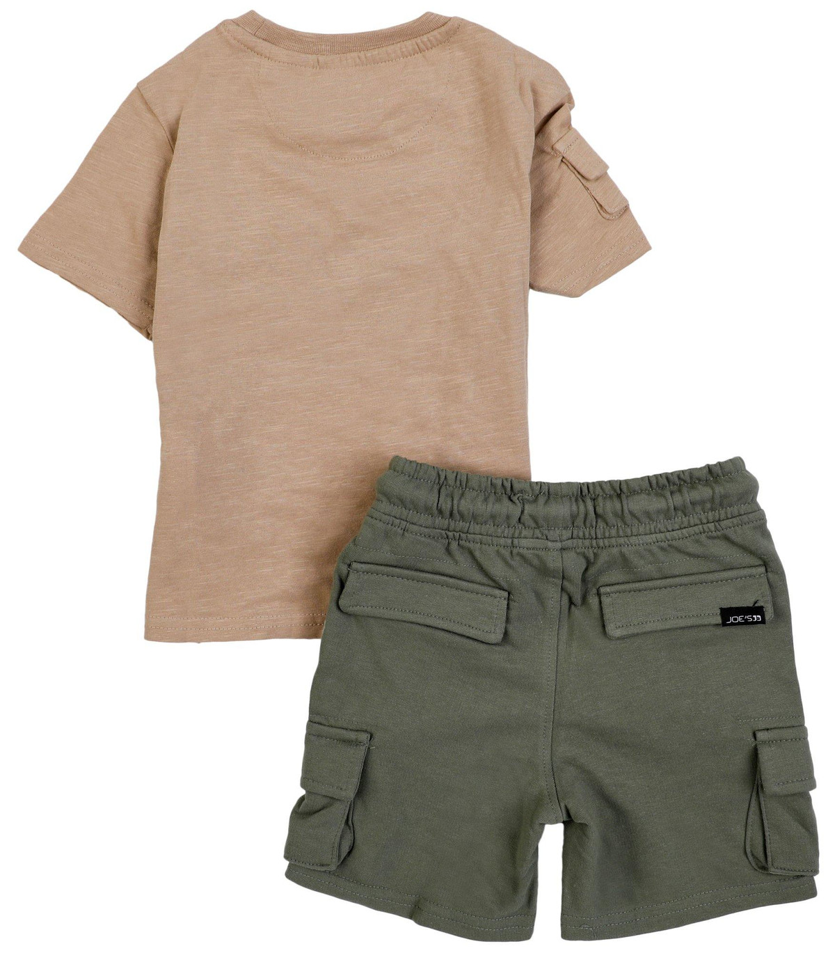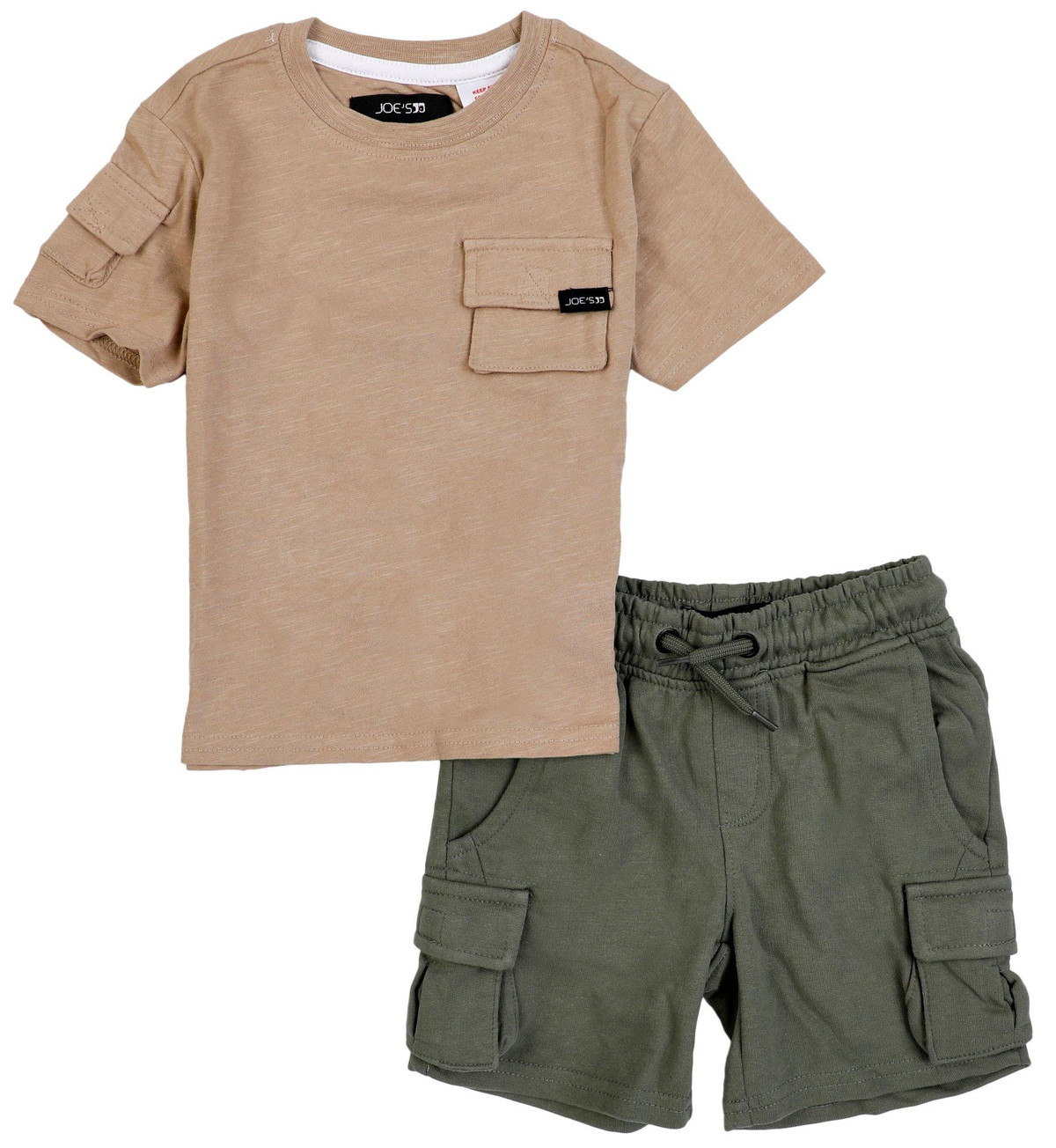 Bringing that classic summer vibe, this 2 pc shorts set features a solid tee with two pockets, which pairs perfectly with these cargo shorts, making it an easy go-to for summer playdates, BBQs, or holiday celebrations. Crafted from lightweight, breathable fabric, it keeps your little one cool and comfortable all day long. A spirited combo that’s as fun as it is functional! Fabrication is: Shirt 100% cotton, Shorts 60% cotton, 40% polyester..