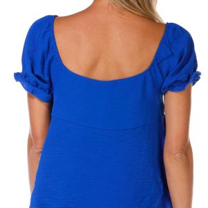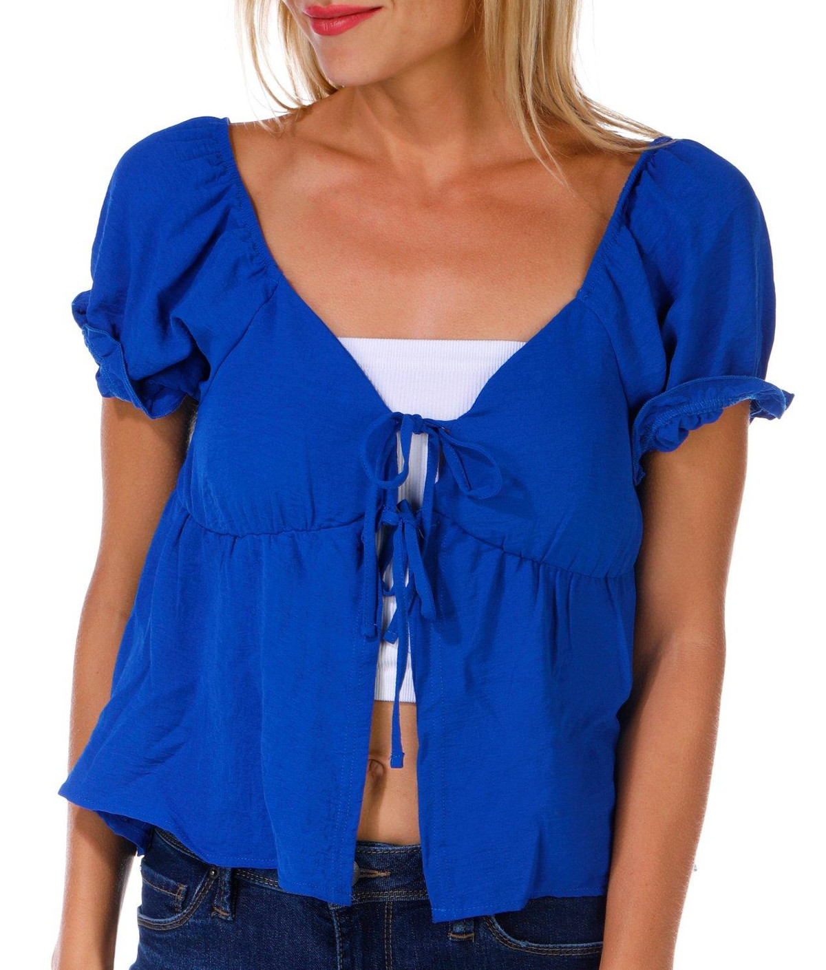 This juniors top adds a playful twist with short puff sleeves and a double tie front. The solid color keeps it versatile while padded cups offer light support. Crafted from woven fabric, it blends structure with softness for a flattering fit. Fabrication 100% polyester