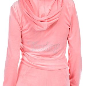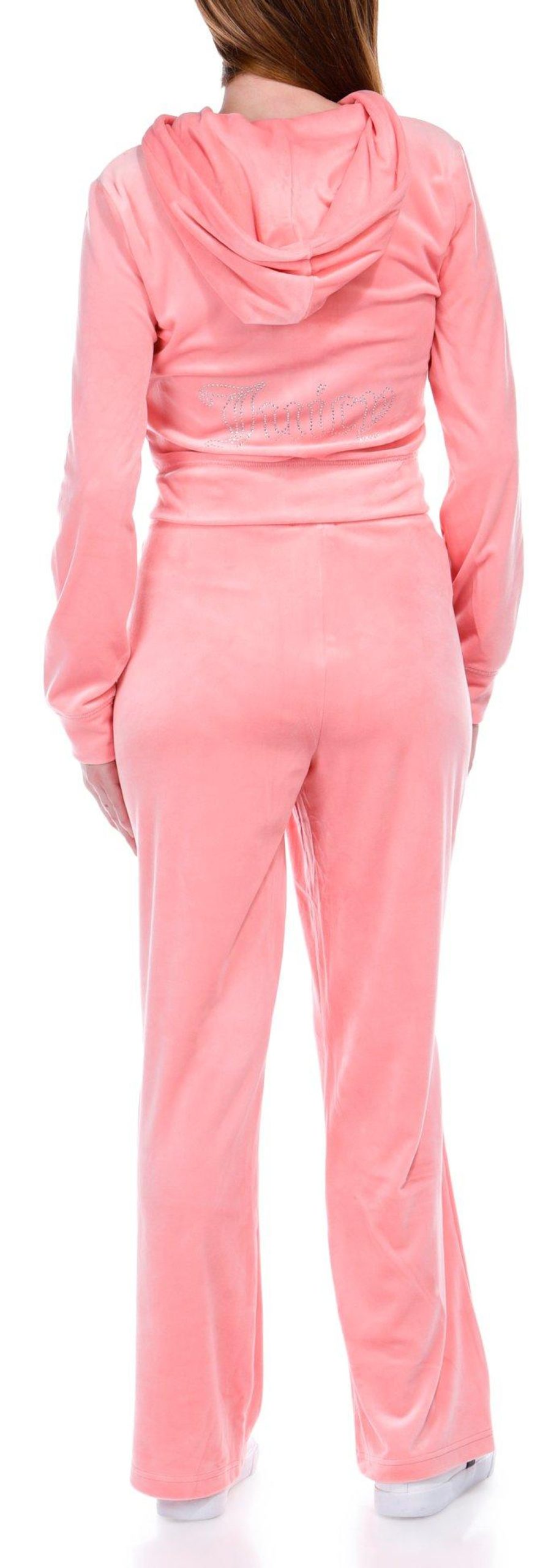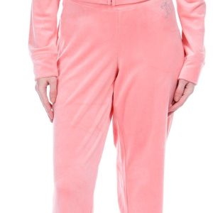 Introducing the Juniors Velour Zip Up Jacket, crafted from a blend of polyester and spandex for a comfortable and stylish fit. This jacket features a solid color, a hooded neckline, and convenient side pockets. The full front zip-up closure ensures ease of wear, while the rhinestone brand script on the back adds a touch of glamour. With a length of 19 inches, this jacket is perfect for layering and adding a chic element to your casual outfits.