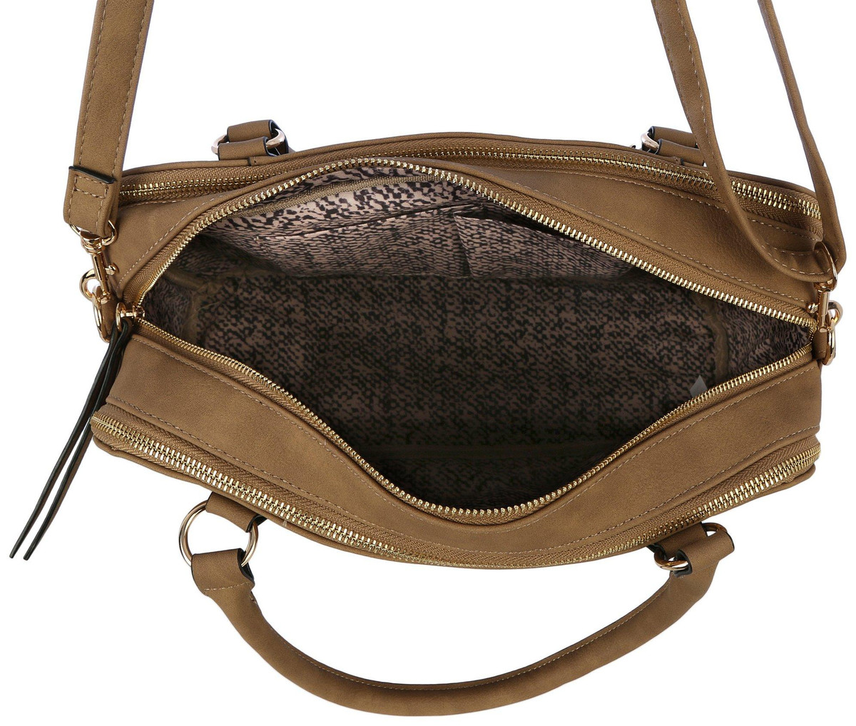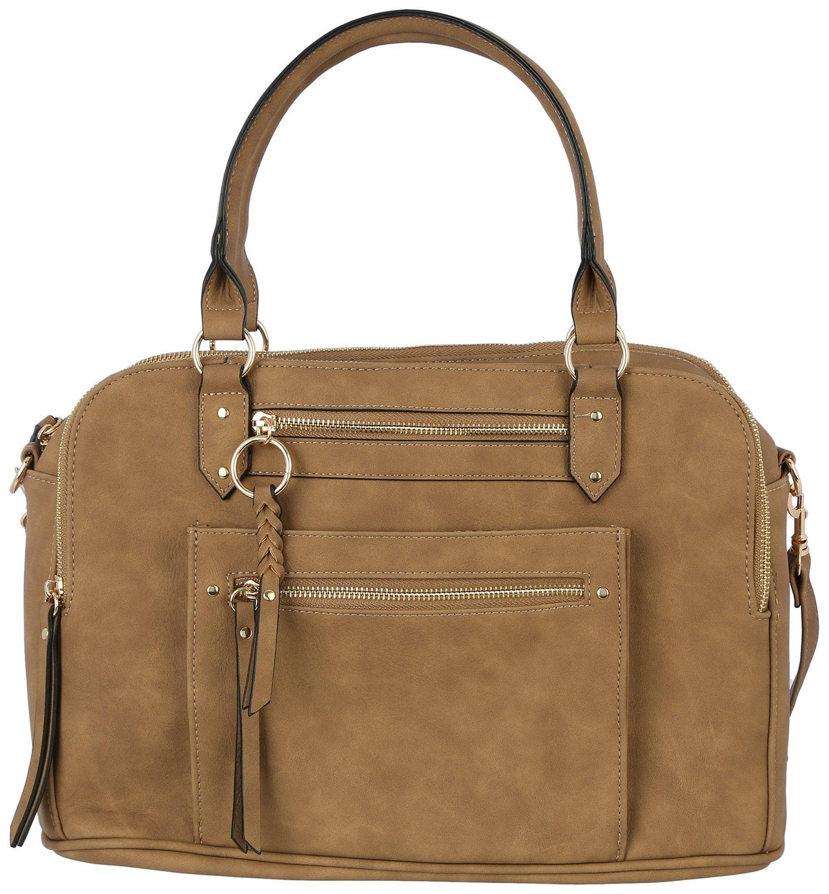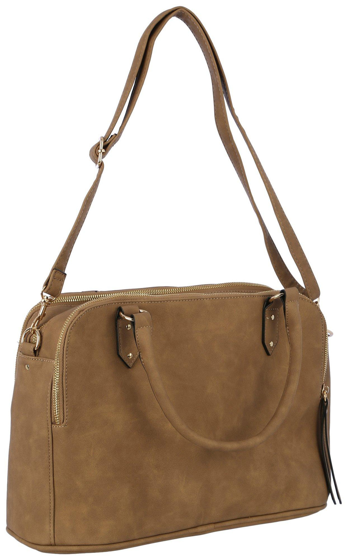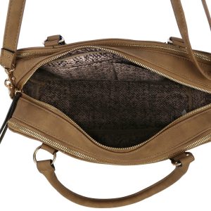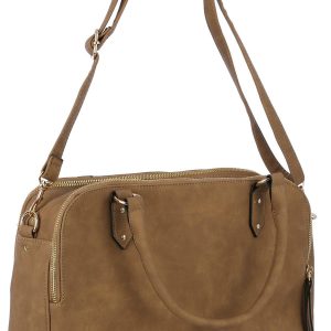 This bag features a stylish solid faux leather exterior, bronze tone hardware, an adjustable crossbody strap, two exterior zip pockets, and three zip compartments with inner slip and zip pockets. Measures 14.5 in. x 6 in. x 12 in.
