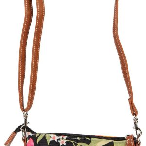 This bag features a stylish solid faux leather exterior, bronze tone hardware, an adjustable crossbody strap, two exterior zip pockets, and three zip compartments with inner slip and zip pockets. Measures 14.5 in. x 6 in. x 12 in.