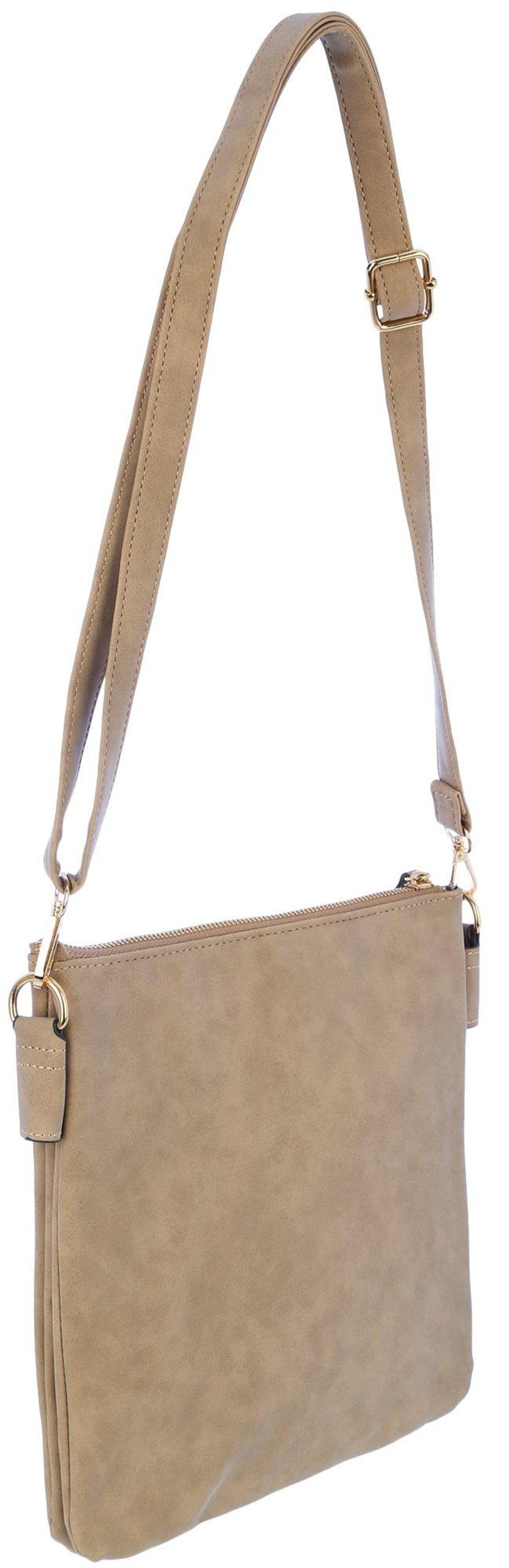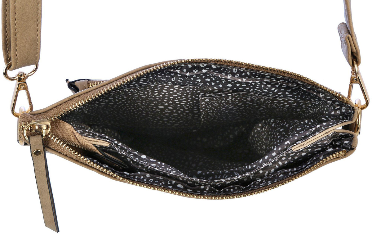 The Tammi crossbody bag features a stylish solid faux suede exterior, gold tone hardware, removable crossbody strap, three exterior zip compartments, a top zip compartment with two inner zip and slip pockets. Measures 10 in. x 10 in.