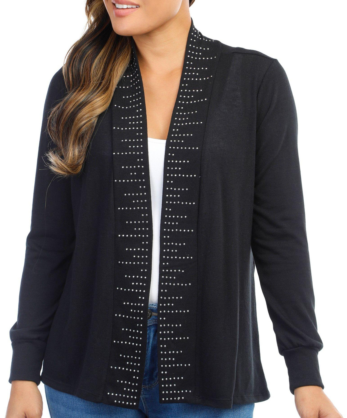 This long sleeve embellished cardigan features a solid color design on soft lightweight knit fabric, and open relaxed styling. The top length measures approximately 25 in. Fabrication 60% polyester, 27% rayon 5% spandex.