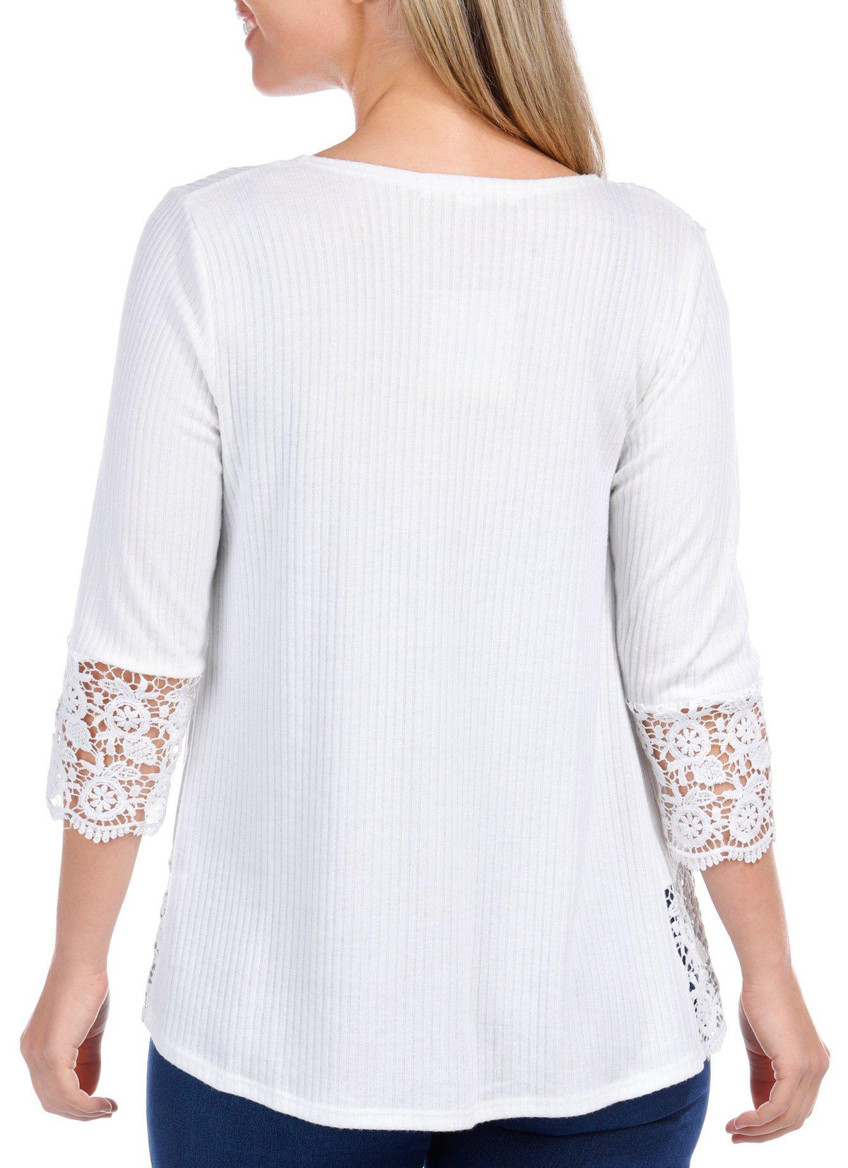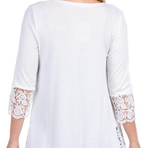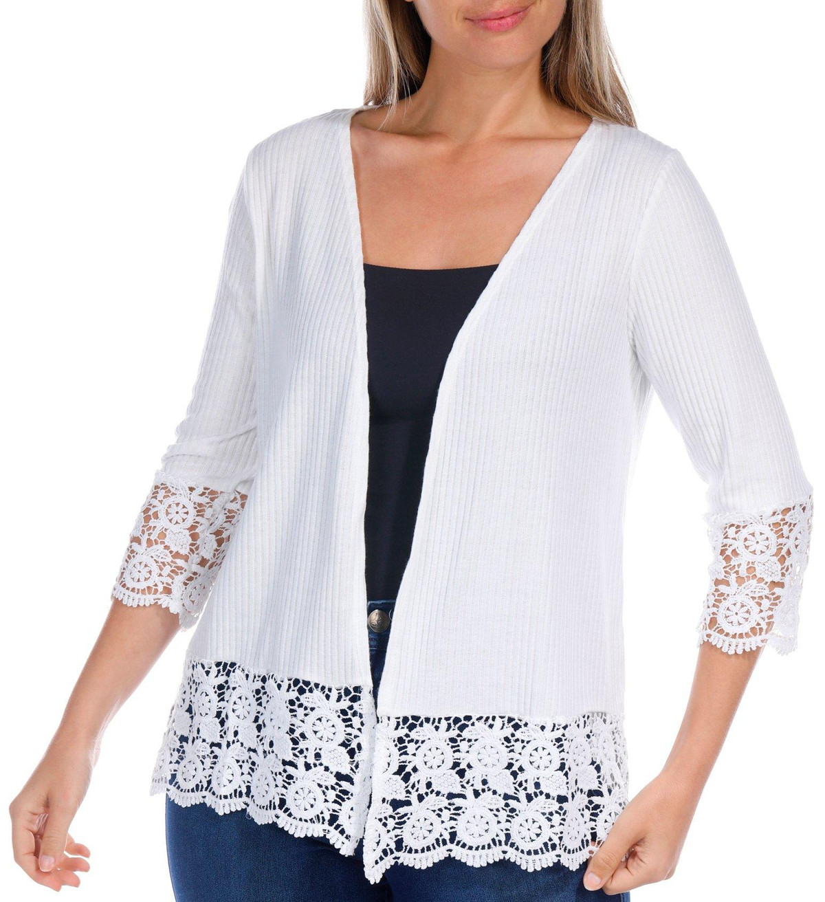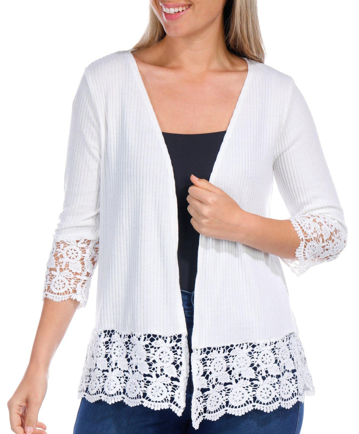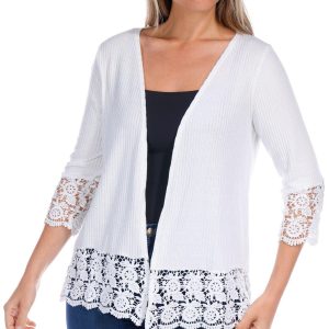 This cardigan features a solid color with a ribbed hacci texture and an open front design. The 3/4 sleeves are accented with delicate crochet trim along the sleeves and hem. Made from a soft blend of polyester, rayon and spandex it offers comfort and style for layering in any season.