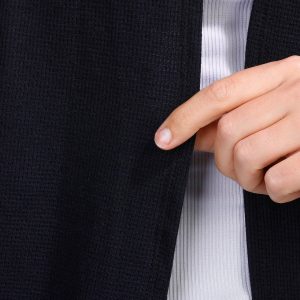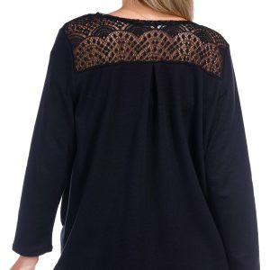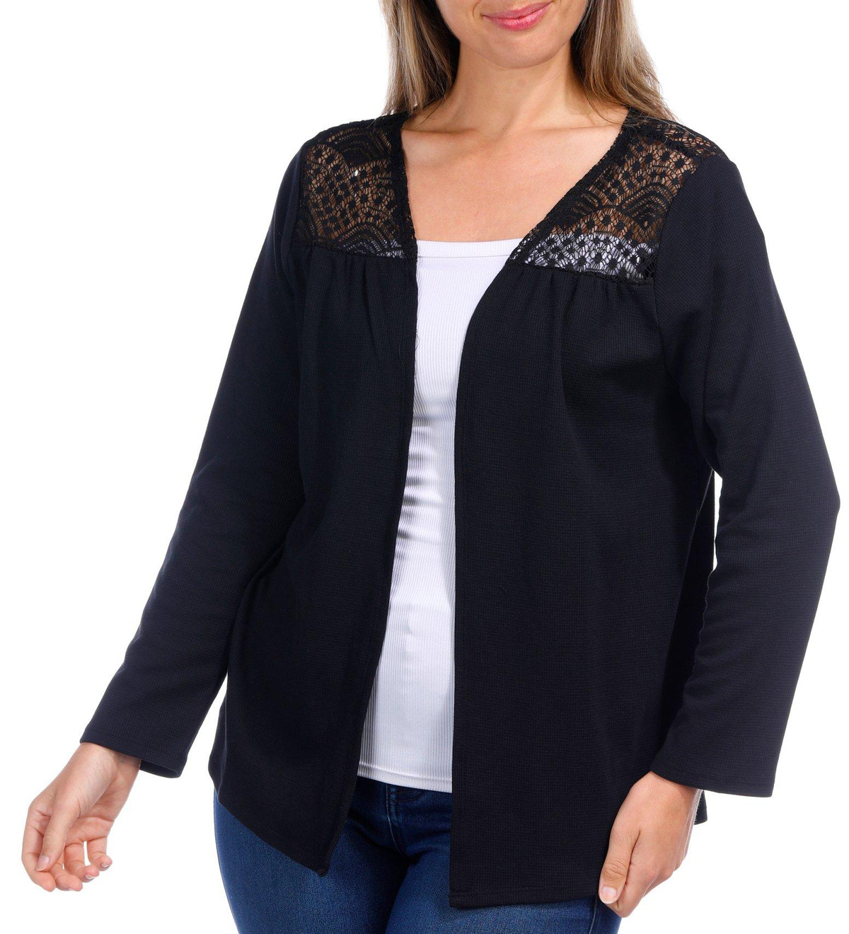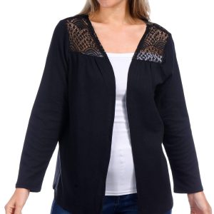 This womens cardigan features a solid color, opepn front design, and lace detail on the collar. Made from a soft blend of polyester, rayon and spandex it offers comfort and style for layering in any season.
