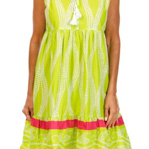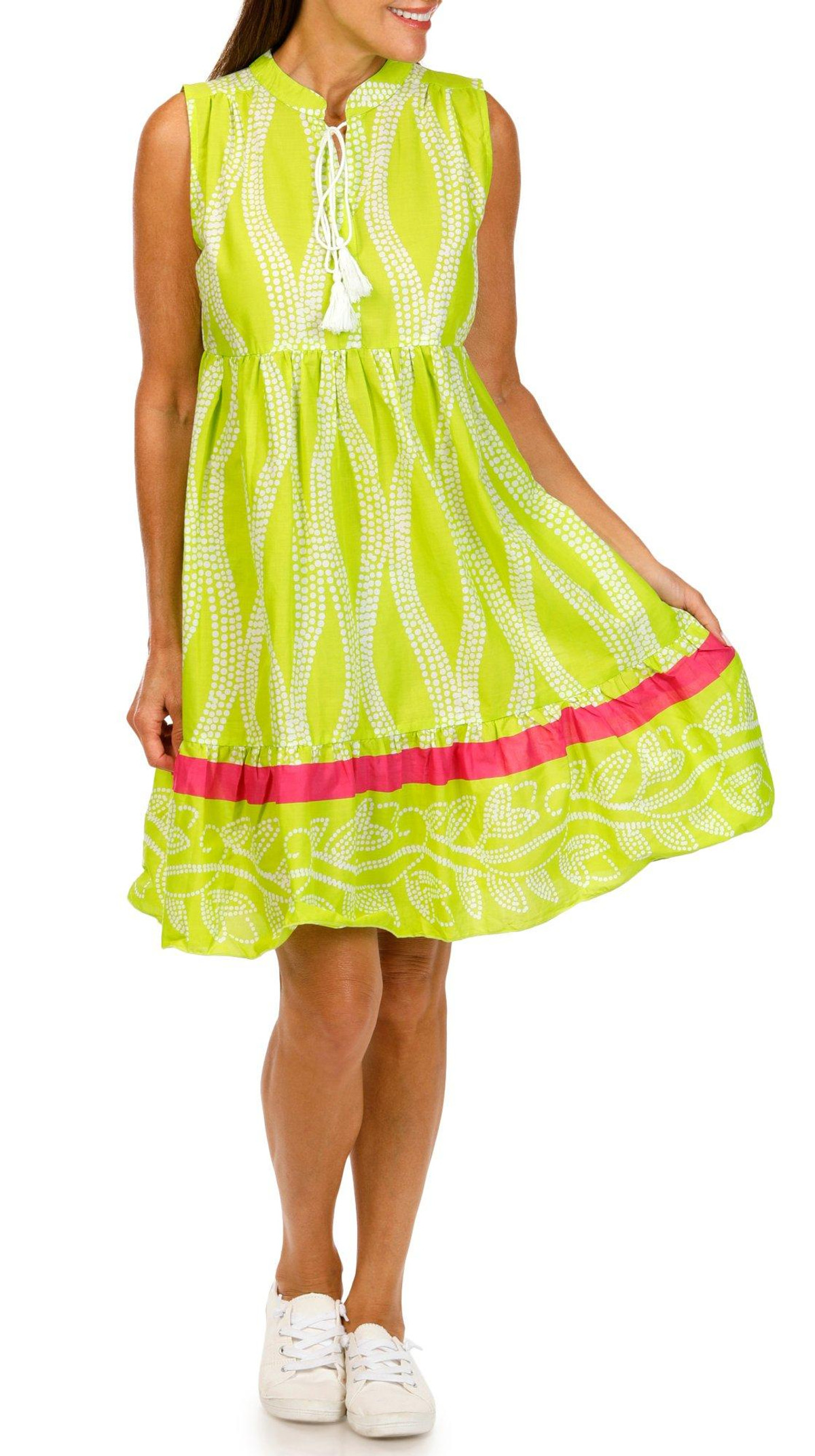 Step into effortless style with this women’s sleeveless tiered print tassel dress. Made from 100% cotton, it offers breathable comfort for warm days. The flowy silhouette and eye-catching print are enhanced by playful tassel accents and a flattering tiered design.