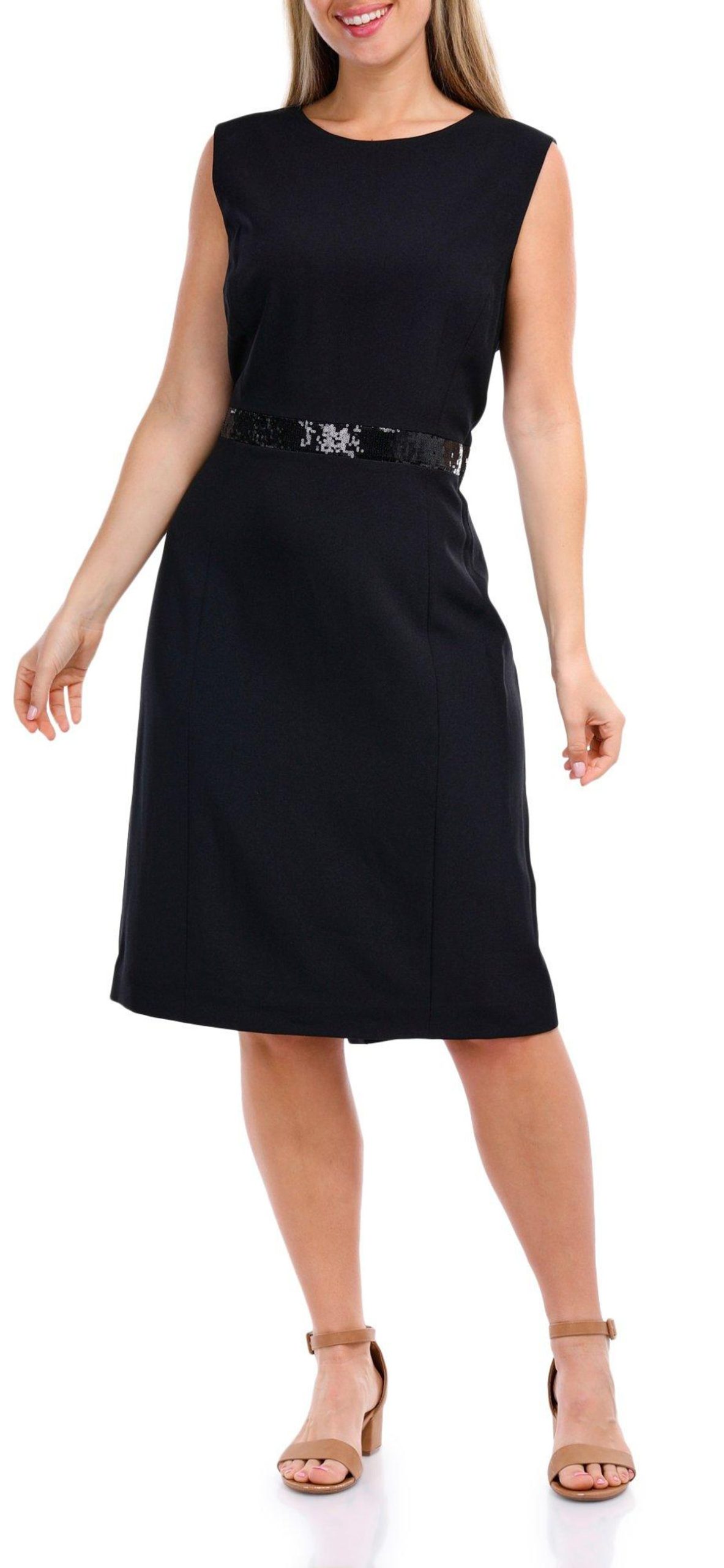 Shine with elegance in this Sleeveless Sheath Dress, featuring dazzling sequin details and a sleek zipped back. The knee-length design offers a sophisticated and flattering silhouette, perfect for both formal and semi-formal occasions. The sequin embellishments add a touch of glamour, ensuring you stand out with grace and confidence. Fabrication is 97% polyester, 3% elastane.