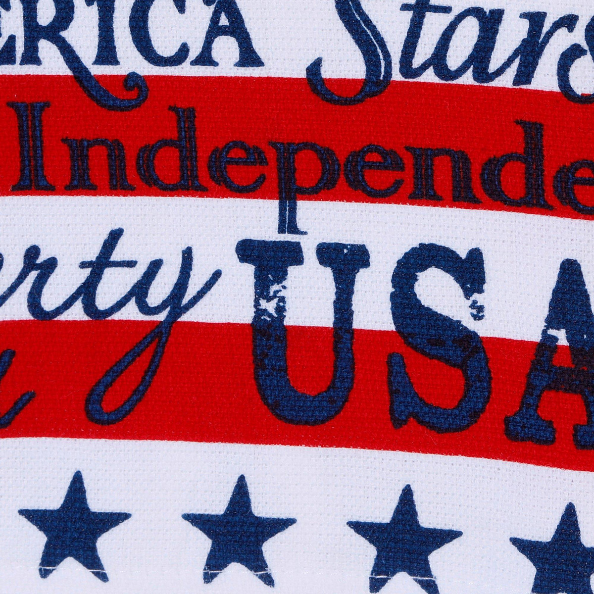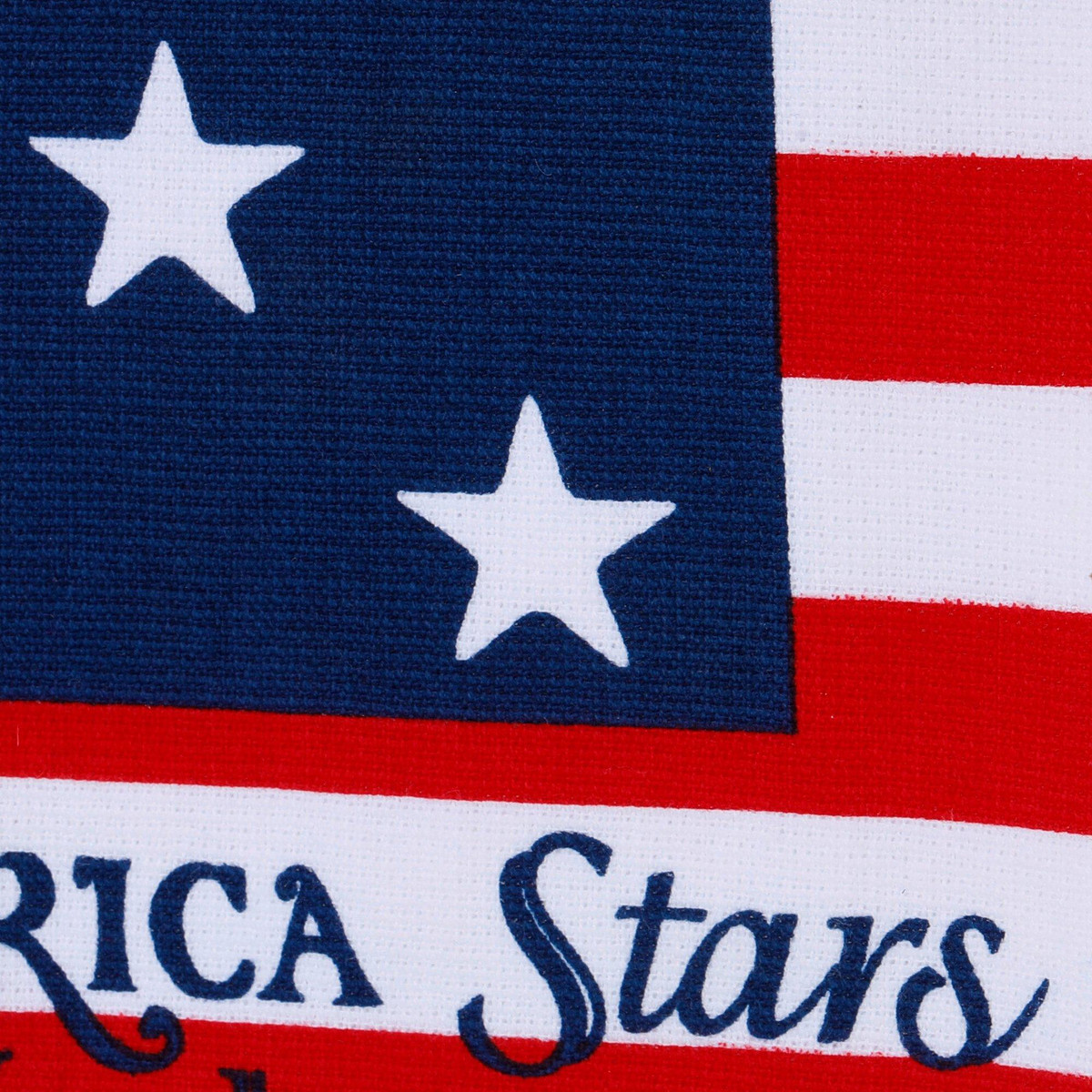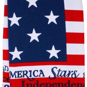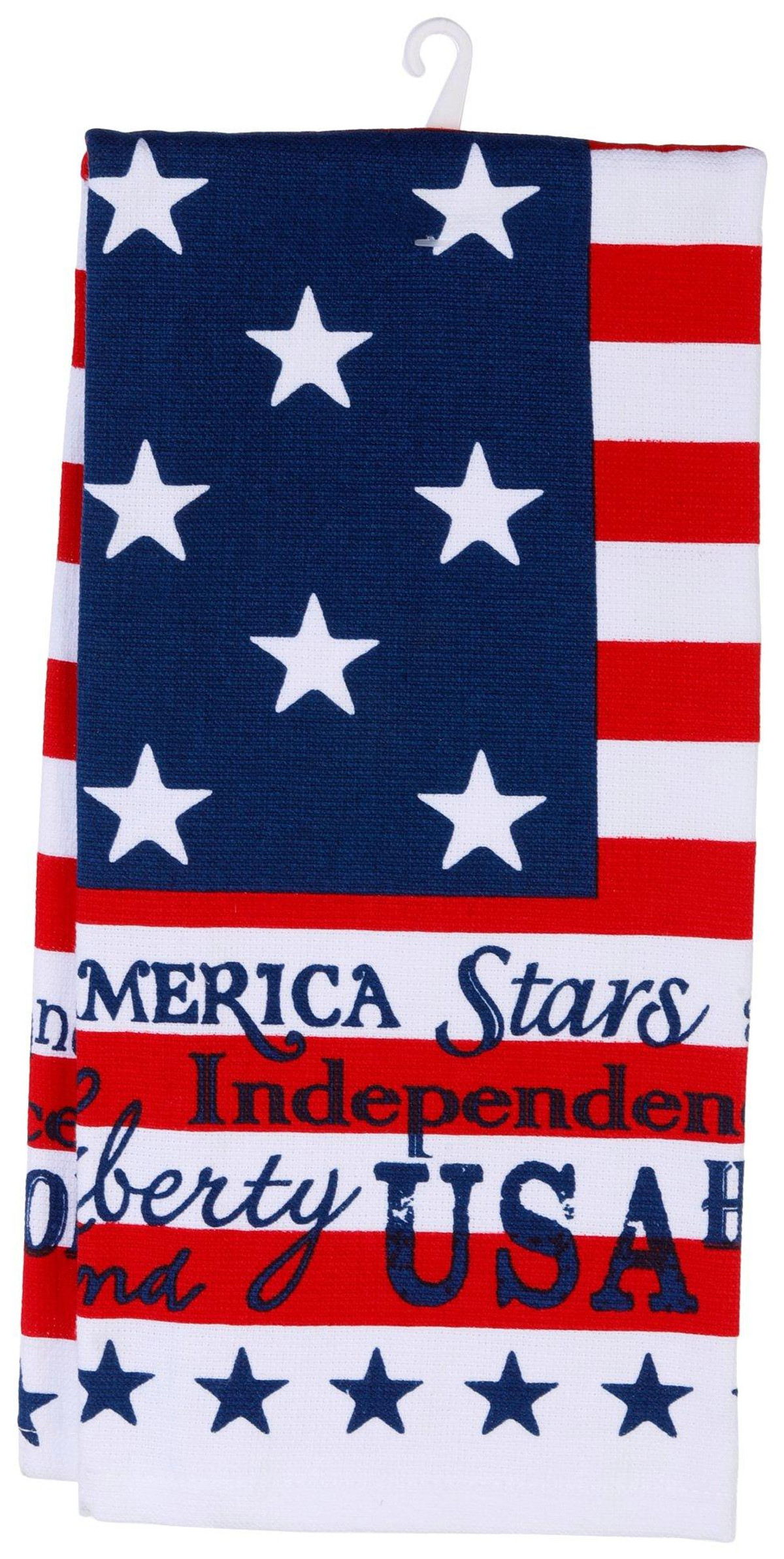 Add patriotic flair to your kitchen with the Americana Flag kitchen towel, featuring a bold stars and stripes design. Dual-purpose construction offers a smooth side for drying glassware and a terry cloth back for tackling everyday messes. Perfect for holiday entertaining or adding year-round Americana charm to your home. Fabrication is 100% cotton. Measures approximately 16 in x 26 in.