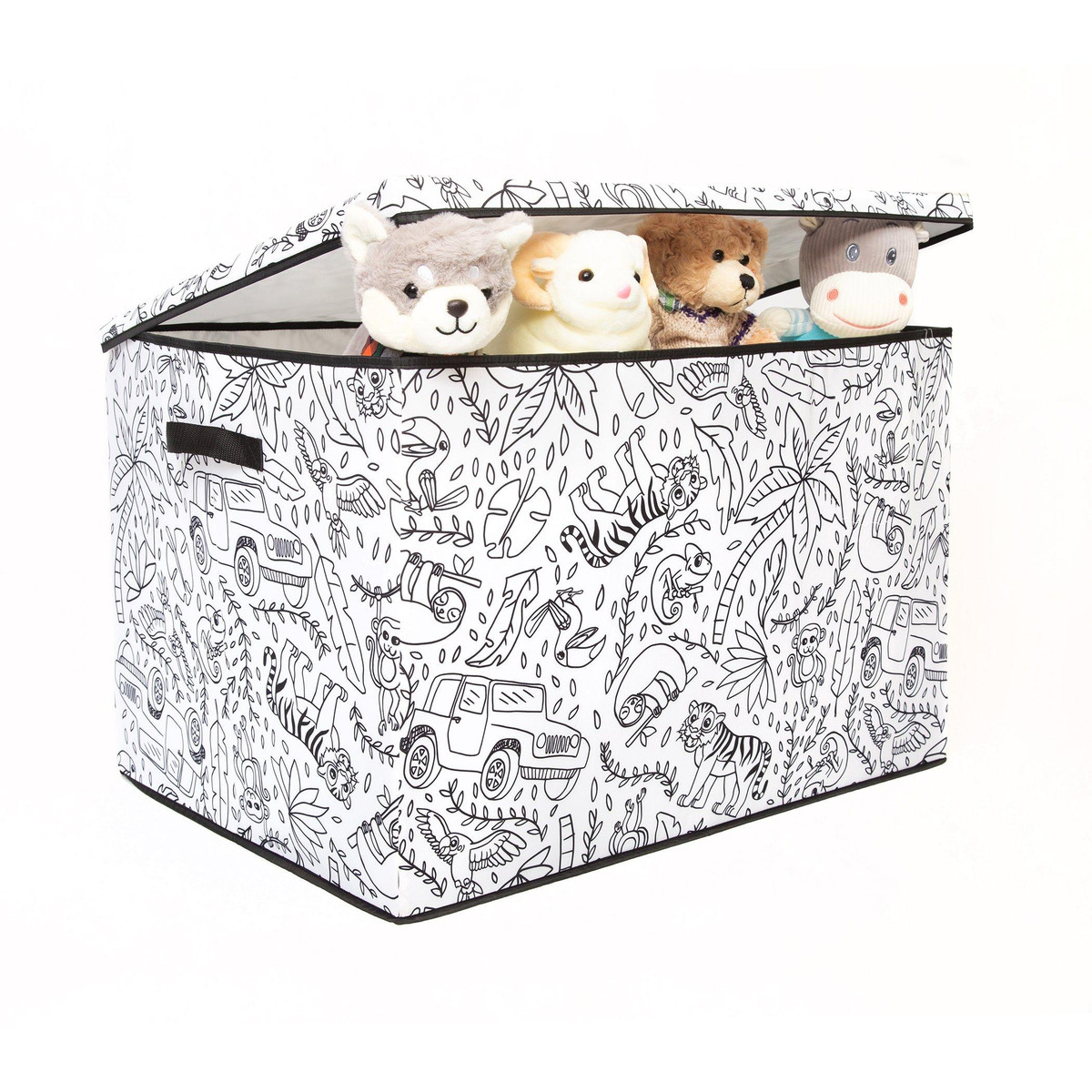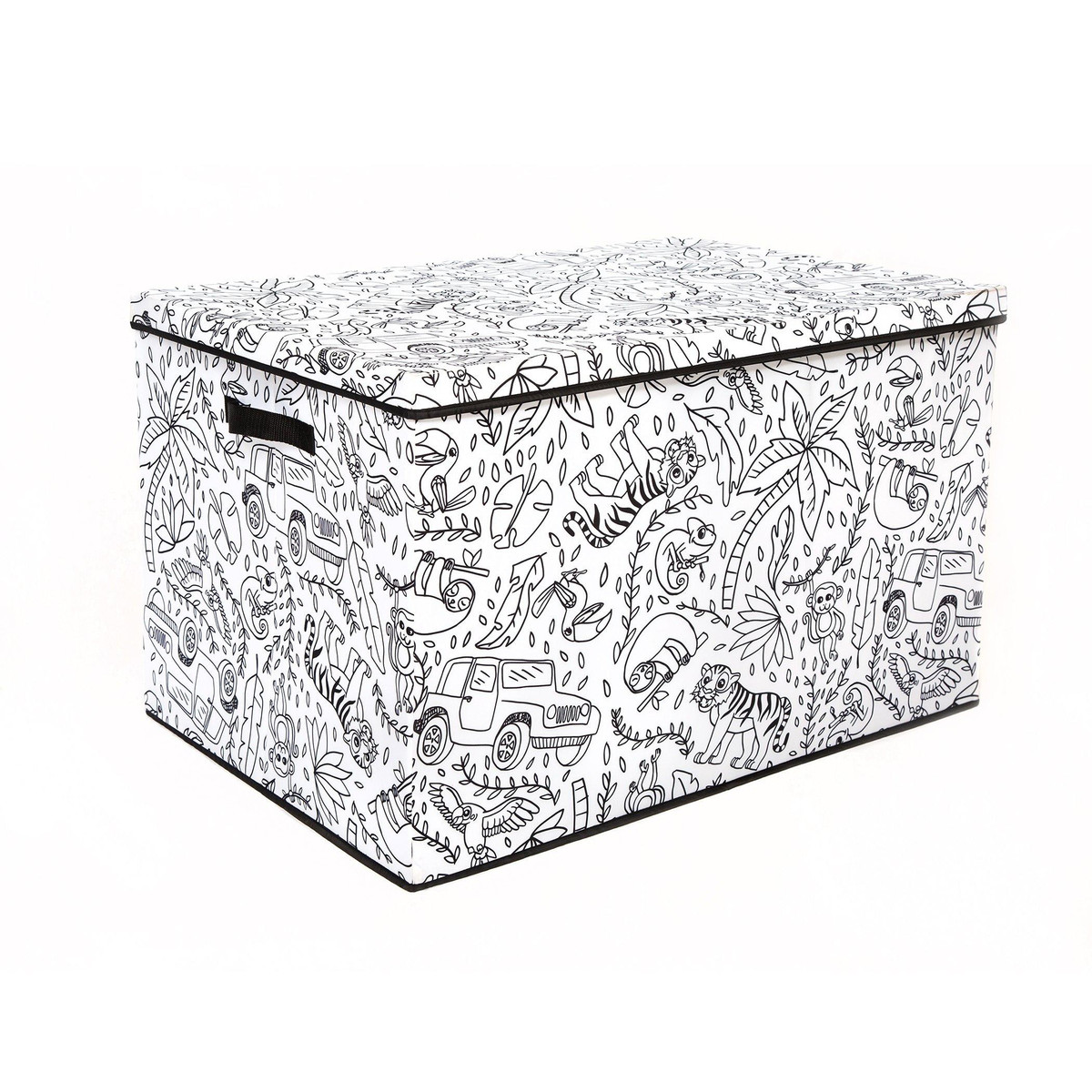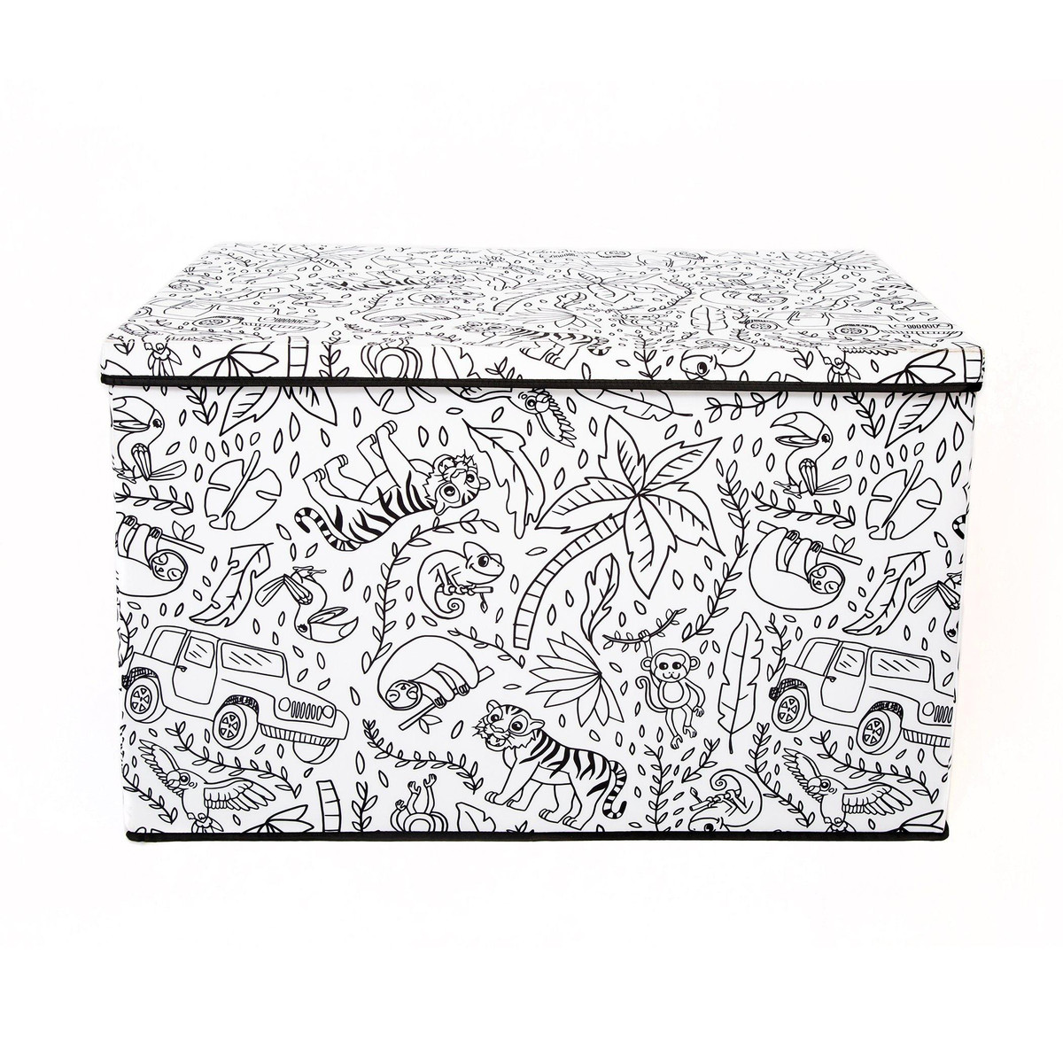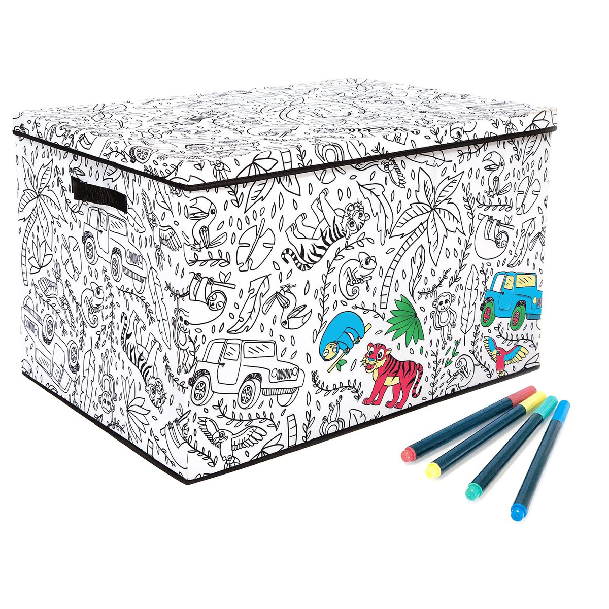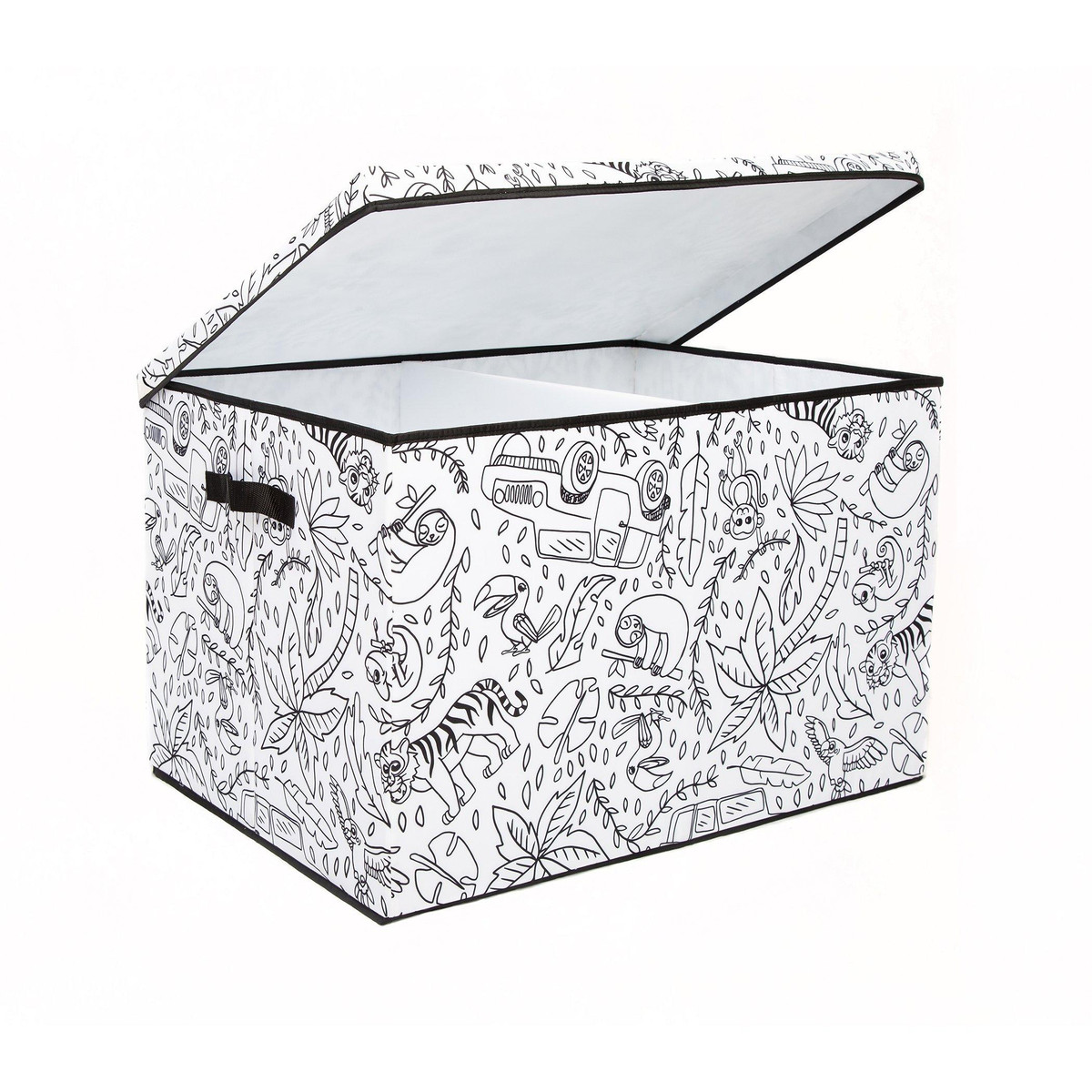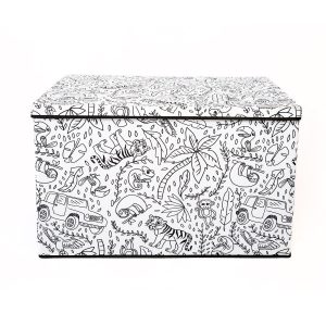 Take your childs creativity and love of coloring to the next level with the fun interactive design of this Childrens Coloring Large Trunk with Lid. This trunk is constructed of a strong durable fabric adorned with black and white prints just waiting to be explored. This multi-functional piece features a removable divider, a lid, durable reinforced handles and a convenient collapsible design for easy storage. Includes 4 washable markers. Measures 28 in. x 19.7 in. x 18.1 in.