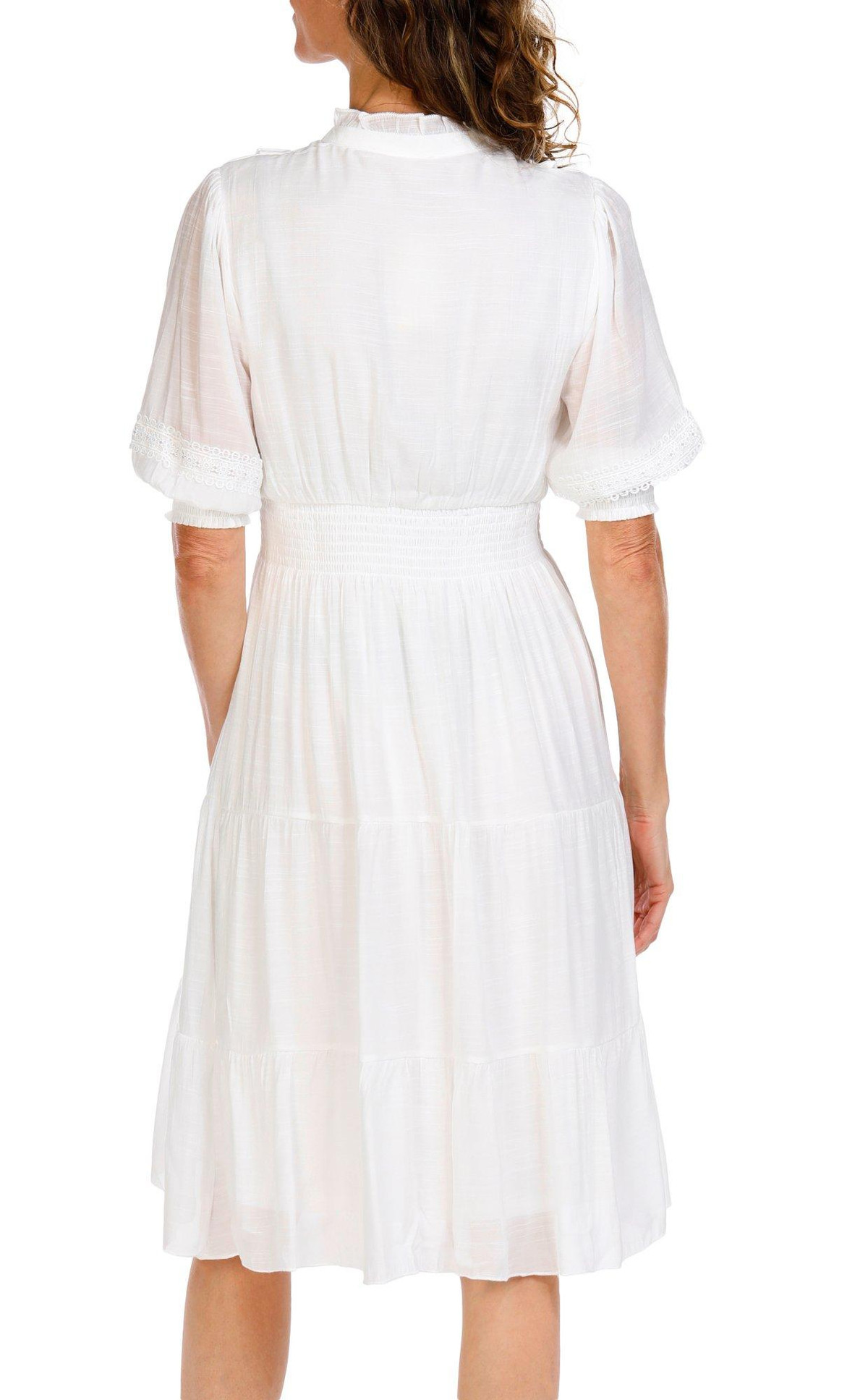 This short sleeve midi dress features a tiered design and delicate lace details for a soft romantic look. Flowy and flattering its perfect for everything from casual days to special occasions.
