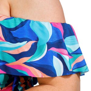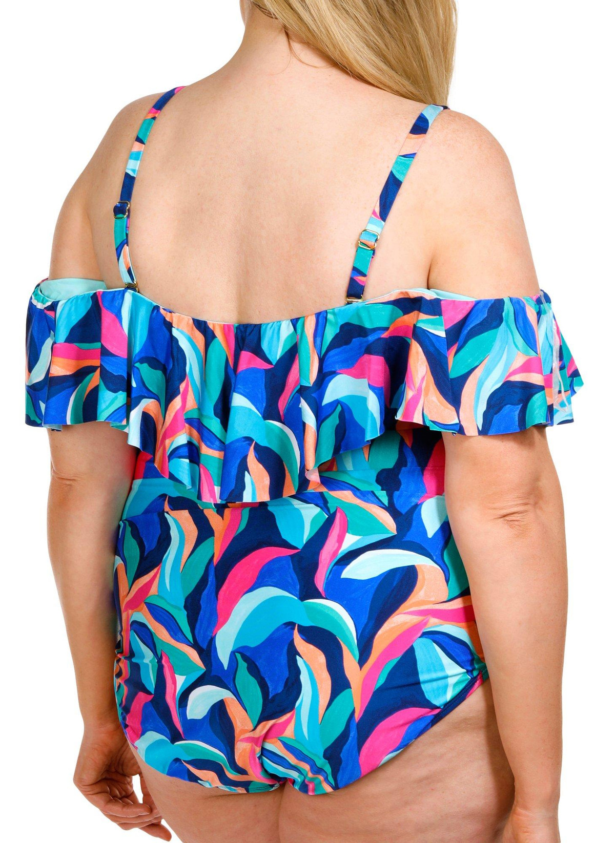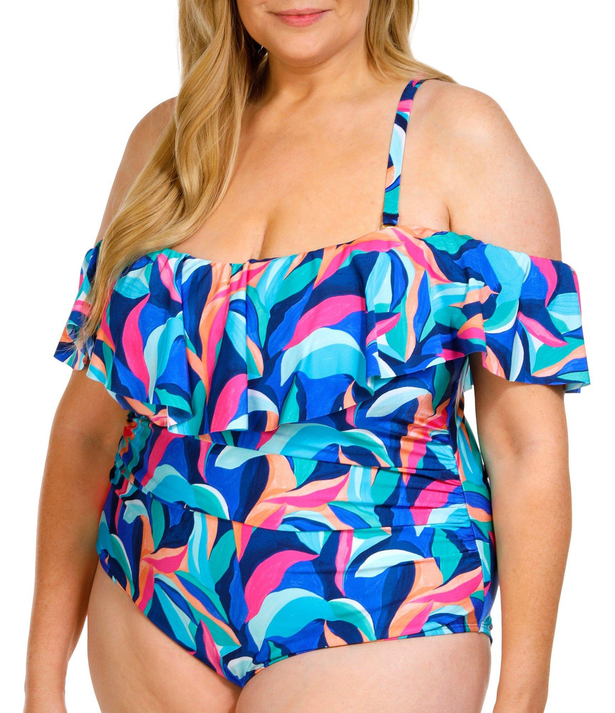 The Plus Printed Off The Shoulder One Piece Swimsuit with Ruffle combines elegance and playful flair. Featuring a flattering off-the-shoulder design and a feminine ruffled neckline, this swimsuit is adorned with a stylish print that adds a bold, eye-catching touch. Perfect for showcasing your curves, it provides full coverage while offering a chic, trendy look by the pool or at the beach.