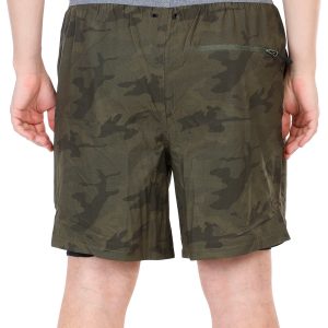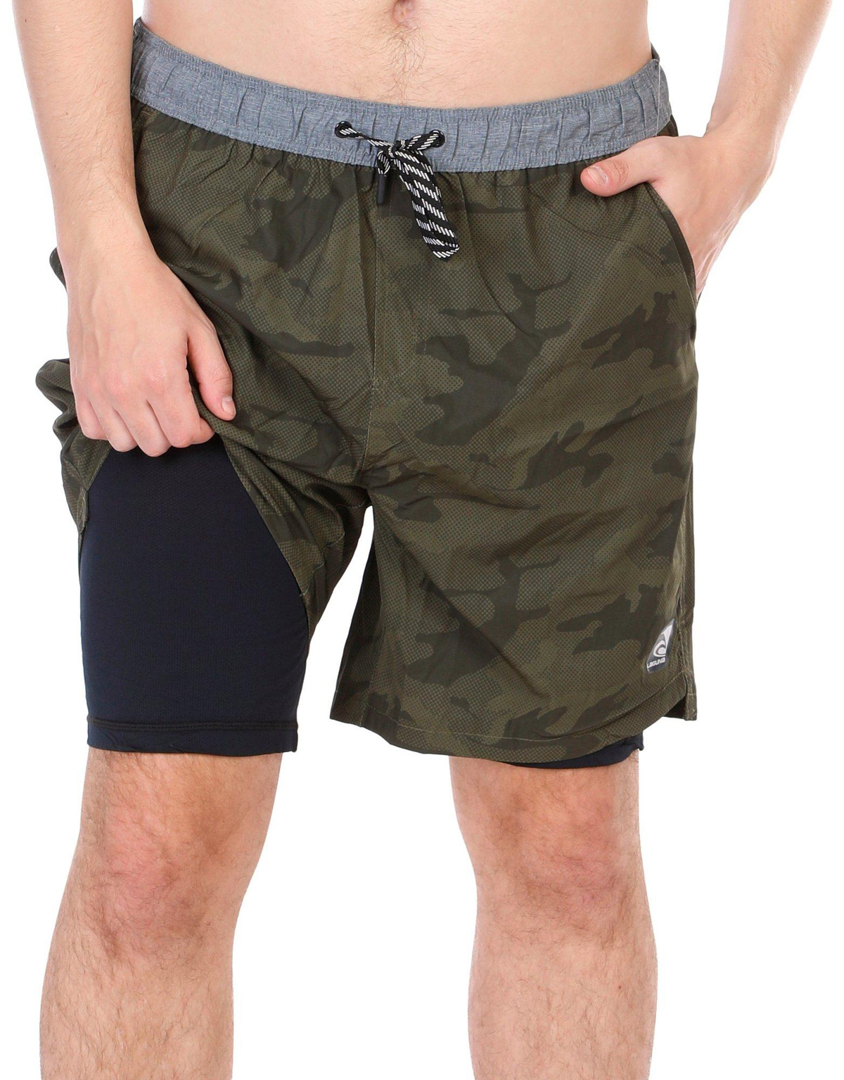 These swim shorts from Laguna feature a camo print design on lightweight durable stretch woven fabric, an elastic waistband with an outer drawstring, two side seam pockets, back zippered security pocket with hook and loop string, back grommet detail, a built-in mesh short, and a regular fit. The inseam measures approximately 7 in. Outseam measures approximately 20 inches from hip to hemline. Fabrication shell: 90% polyester, 10% spandex, and the lining: 88% polyester, 12% spandex.