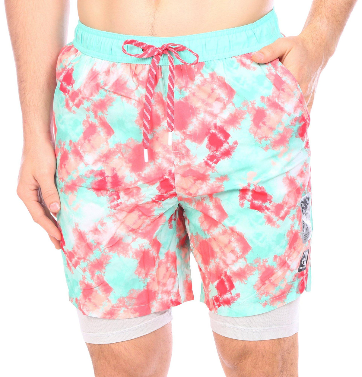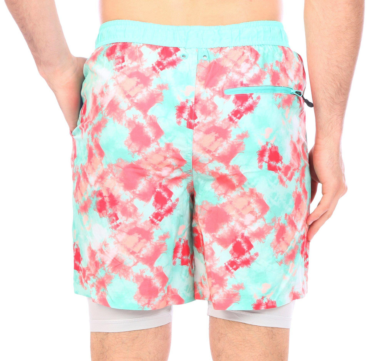 These swim shorts from Laguna feature a tie dye print design on lightweight durable stretch woven fabric, an elastic waistband with an outer drawstring, two side seam deep pockets, back zippered security pocket with hook and loop string, back grommet detail, a built-in mesh short, and a regular fit. The inseam measures approximately 7 in. Outseam measures approximately 18.5 inches from hip to hemline. Fabrication shell: 90% polyester, 10% spandex, and the lining: 92% polyester, 8% spandex.