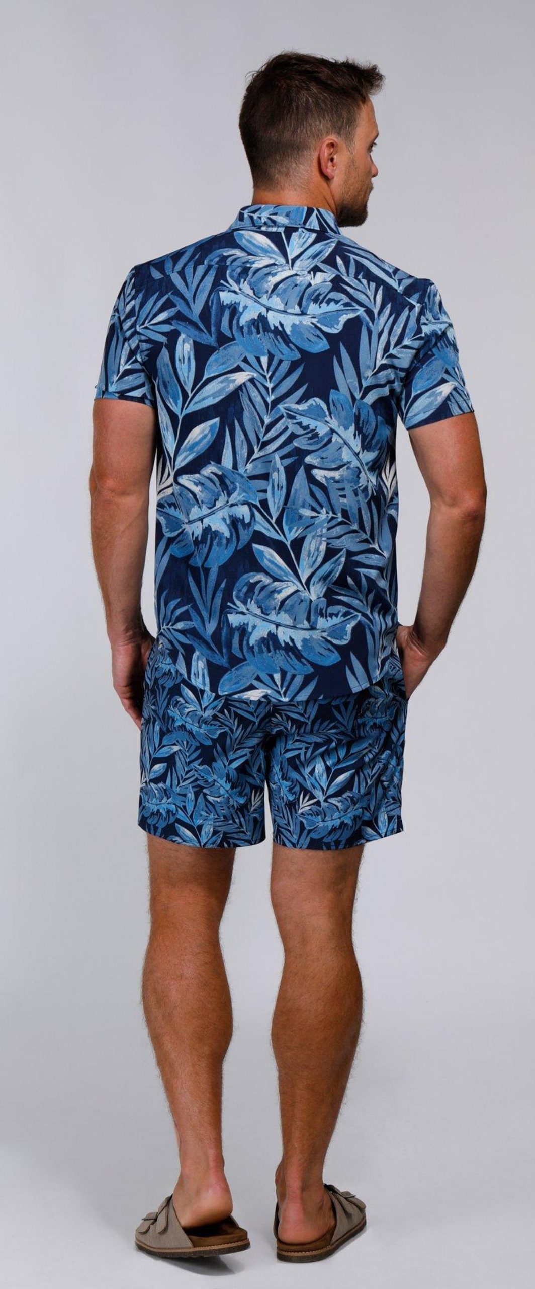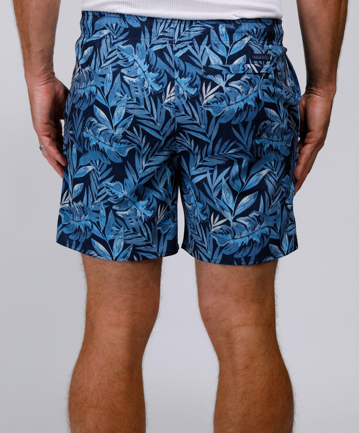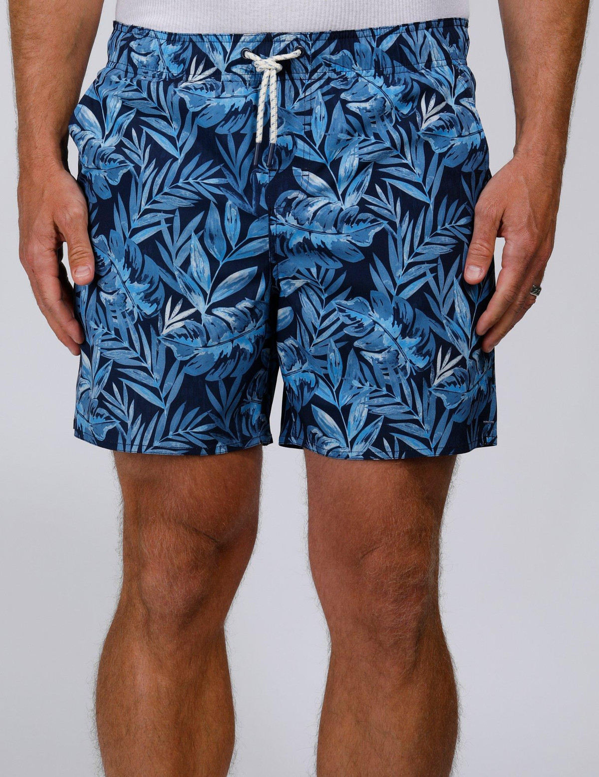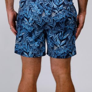 The Tailored Fern Print Swim Shorts are designed for both style and comfort. Made from a blend of 90% polyester and 10% spandex, these shorts offer a flexible, water-friendly fit. Featuring a drawstring waistband, side slip pockets, and one back pocket, theyre perfect for your next beach day or poolside relaxation.. 6 Inches inseam sits at the thigh. UPF 50+ 4-way stretch.