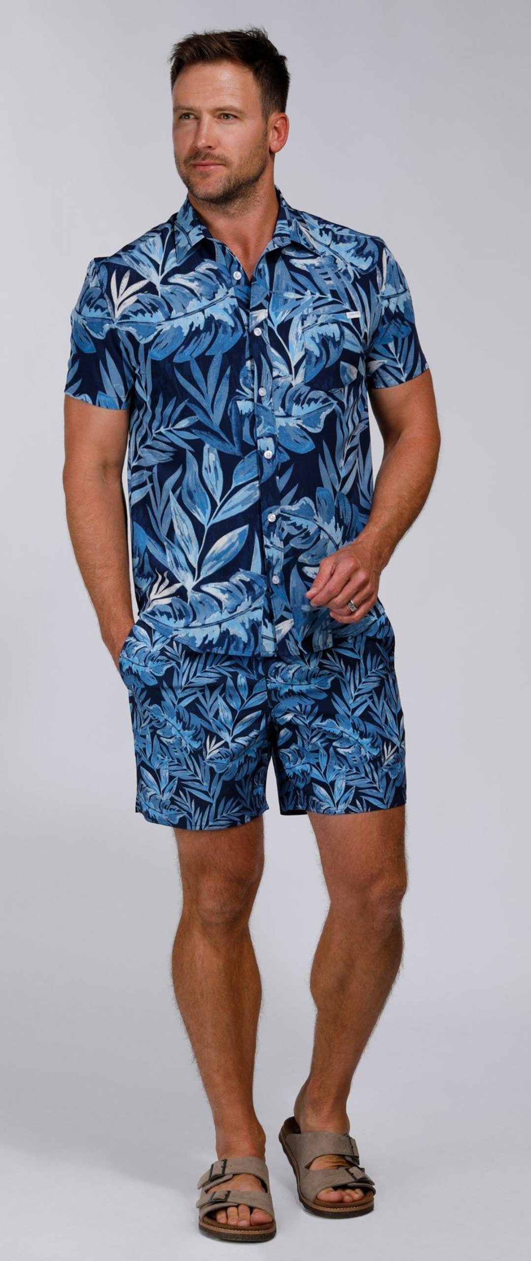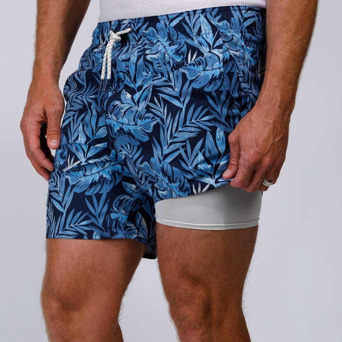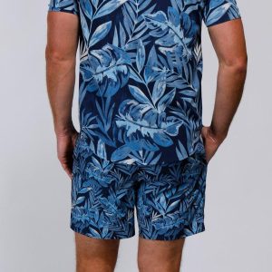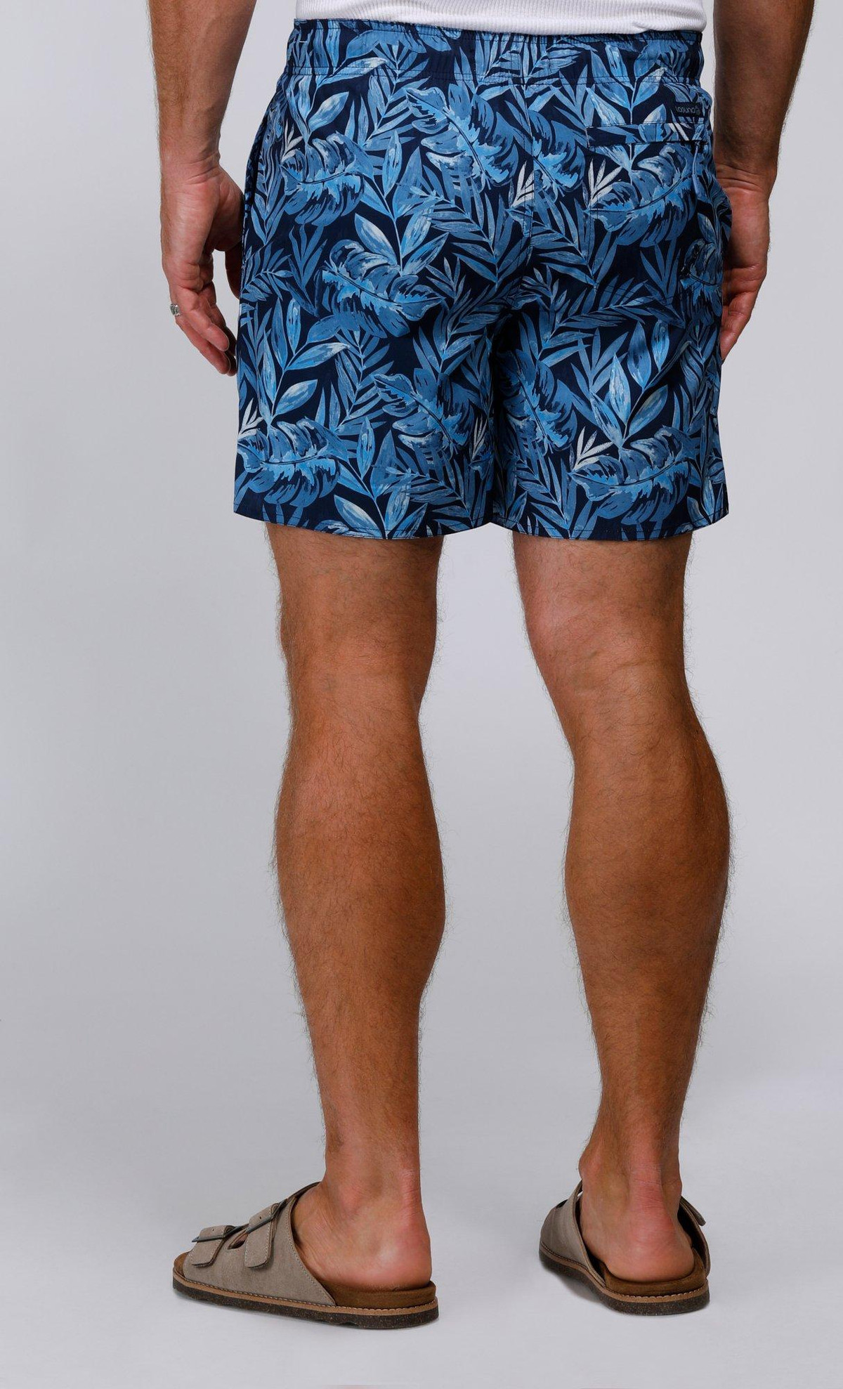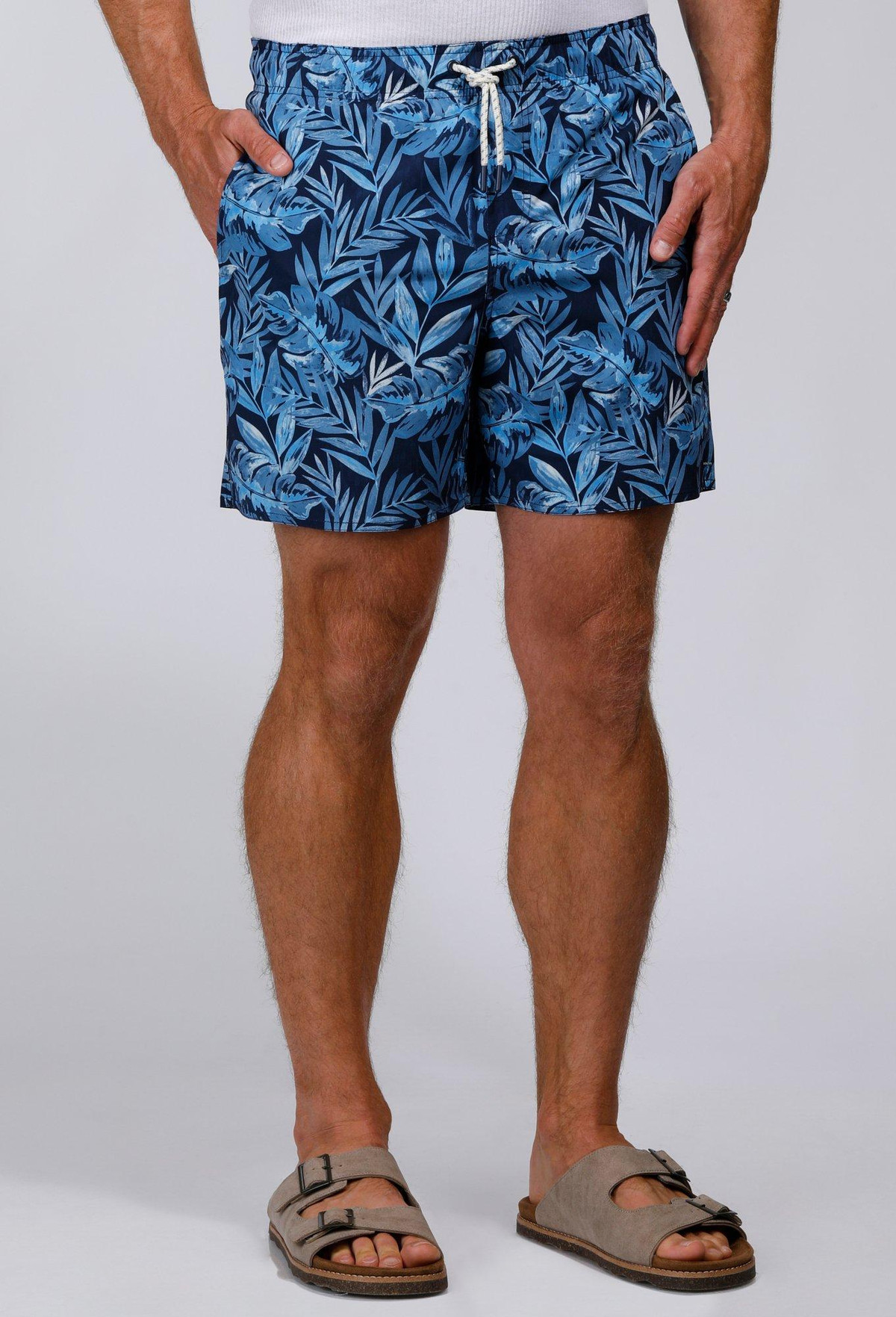 The Tailored Fern Print Swim Shorts are designed for both style and comfort. Made from a blend of 90% polyester and 10% spandex, these shorts offer a flexible, water-friendly fit. Featuring a drawstring waistband, side slip pockets, and one back pocket, theyre perfect for your next beach day or poolside relaxation.. 6 Inches inseam sits at the thigh. UPF 50+ 4-way stretch.