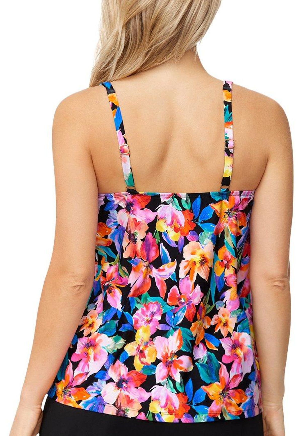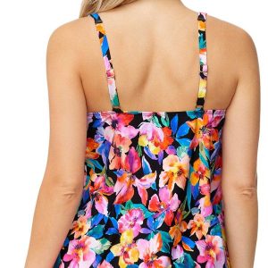 Inspired by the beaches of Hawaii, this tankini top features a tropical print that’s perfect for those who want to make a splash in and out of the water. Additional features include removeable cups and underwire. Fabrication is 88% nylon and 12% spandex.
