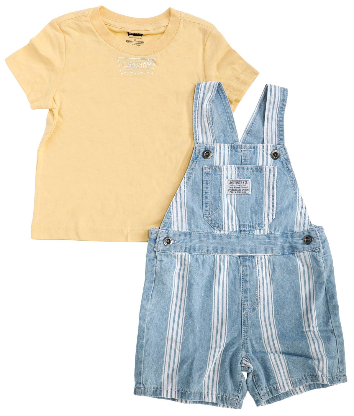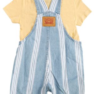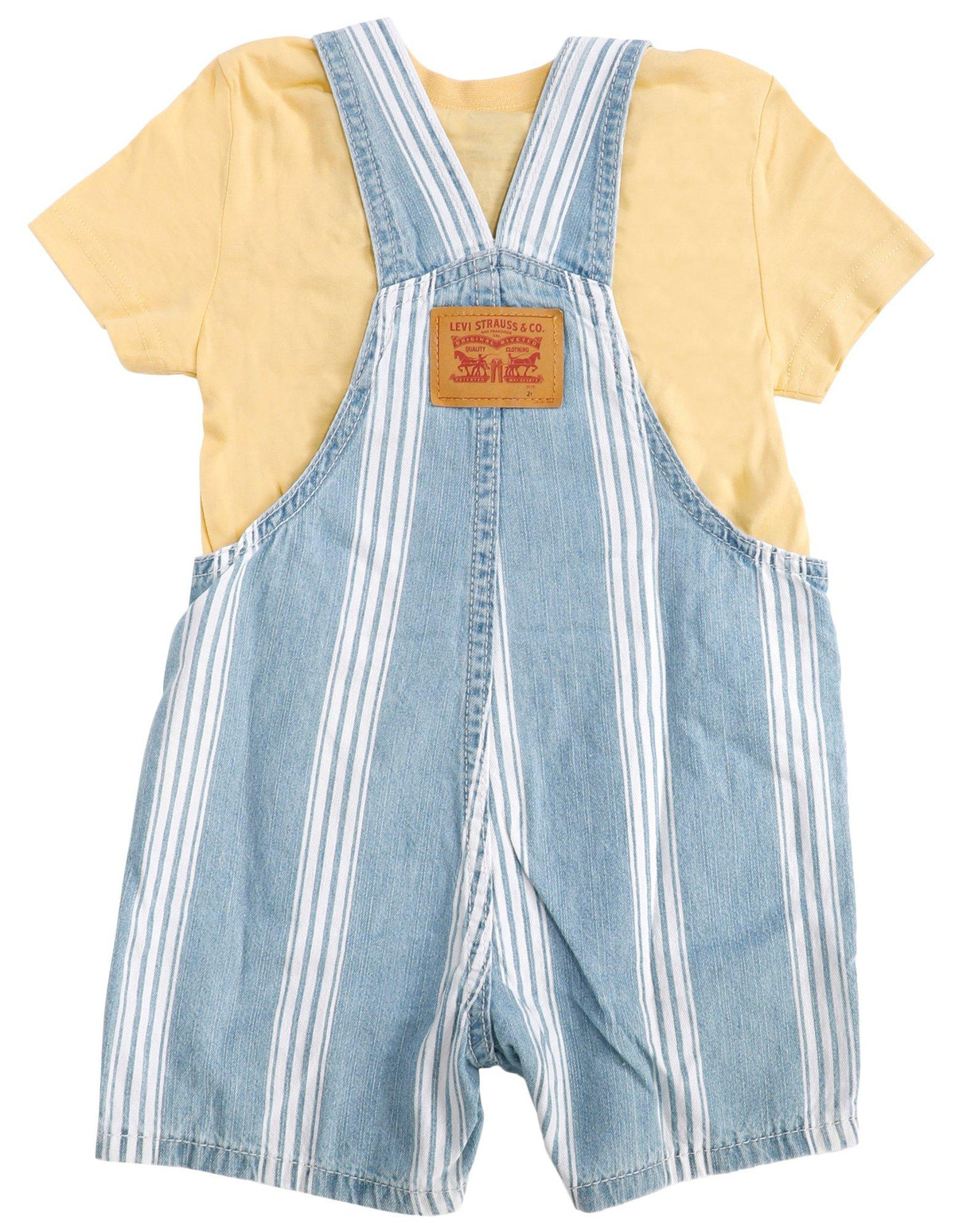 This toddler boys two piece striped indigo shortall set includes classic striped shortalls paired with a soft t shirt for all day comfort. The coordinated look is perfect for playdates or outings offering easy style and charm in one simple outfit. Fabrication 60% cotton and 40% polyester
