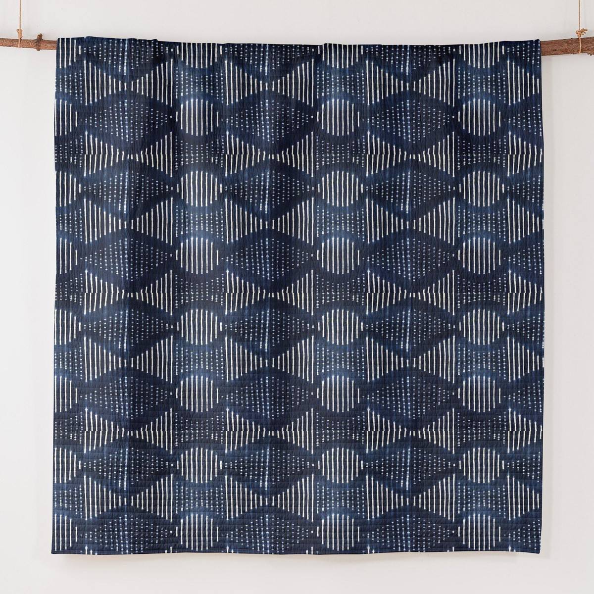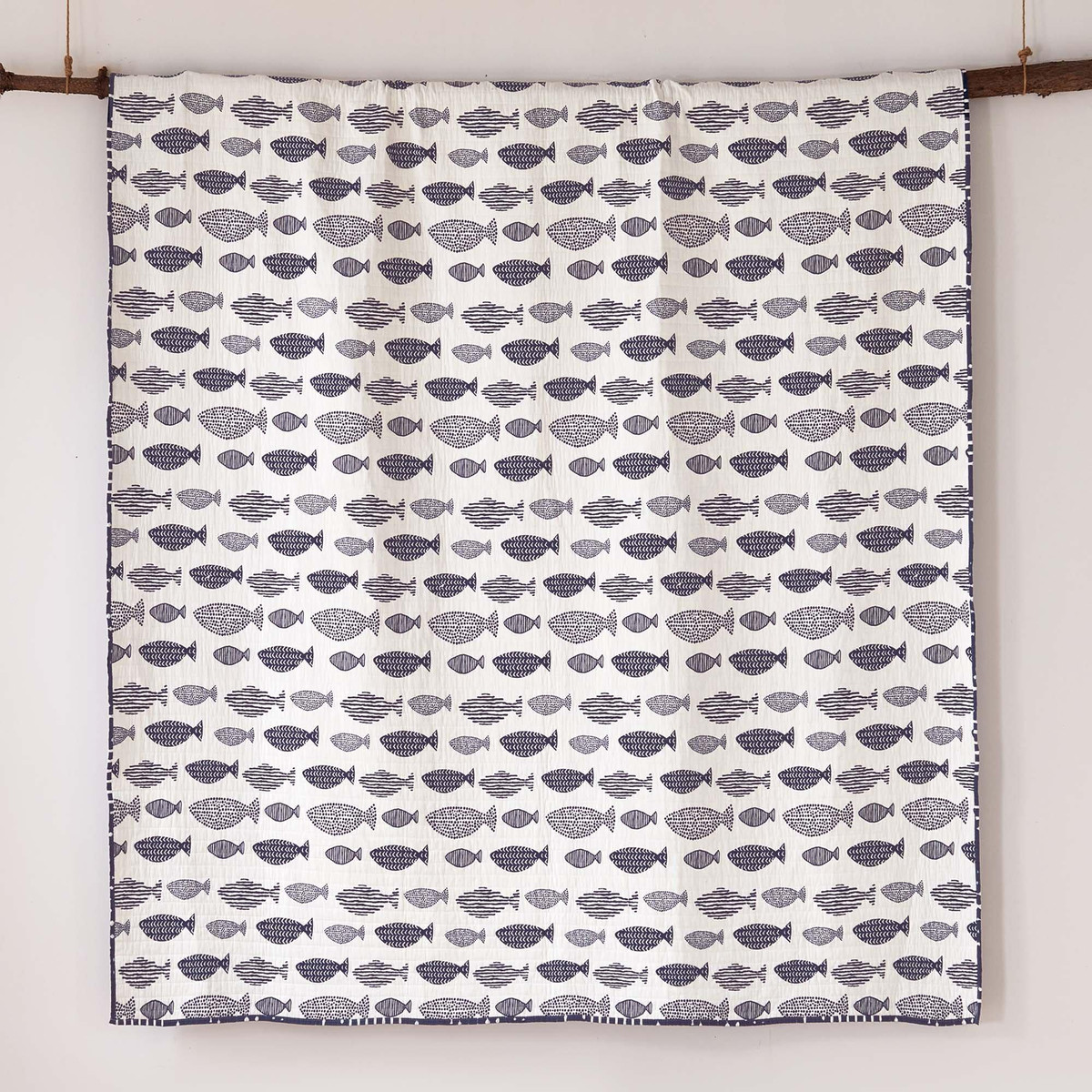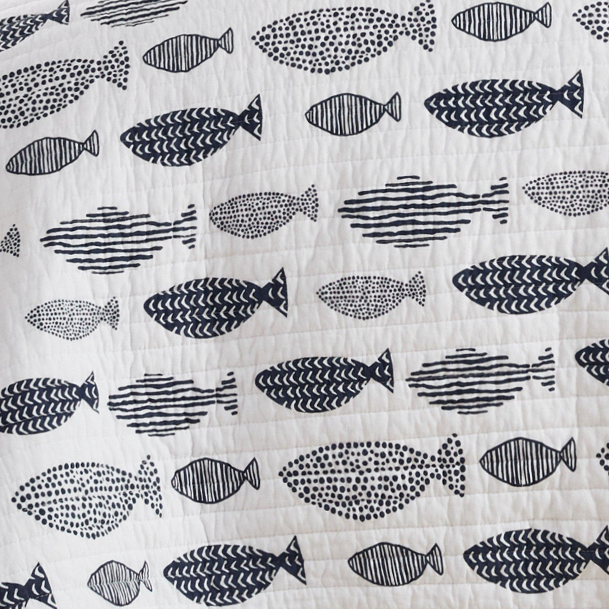 The Bakio Reversible Quilt Set by Levtex Home is inspired by a laid-back coastal escape. Offered in shades of navy and white, this design will immediately transform your bedroom. Made with the softest lightweight cotton, this reversible quilt features a woodblock pattern of fish in navy geometric design on the front, reversing to a navy and white mud cloth geometric on the other. Enjoy this for years to come!