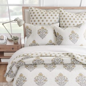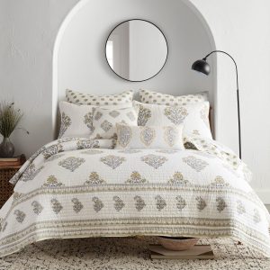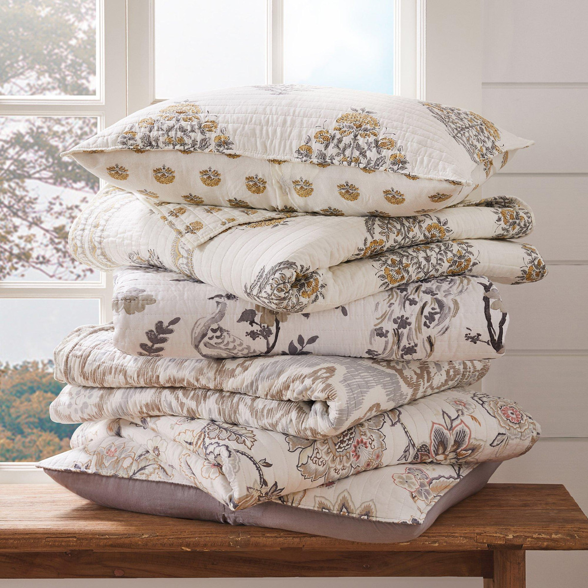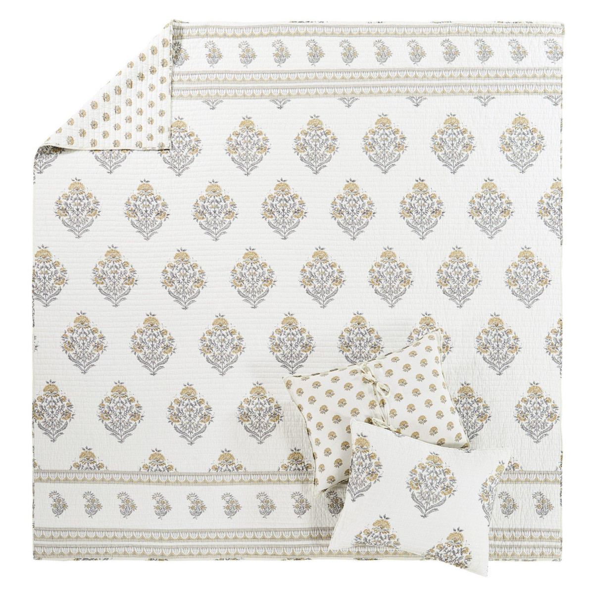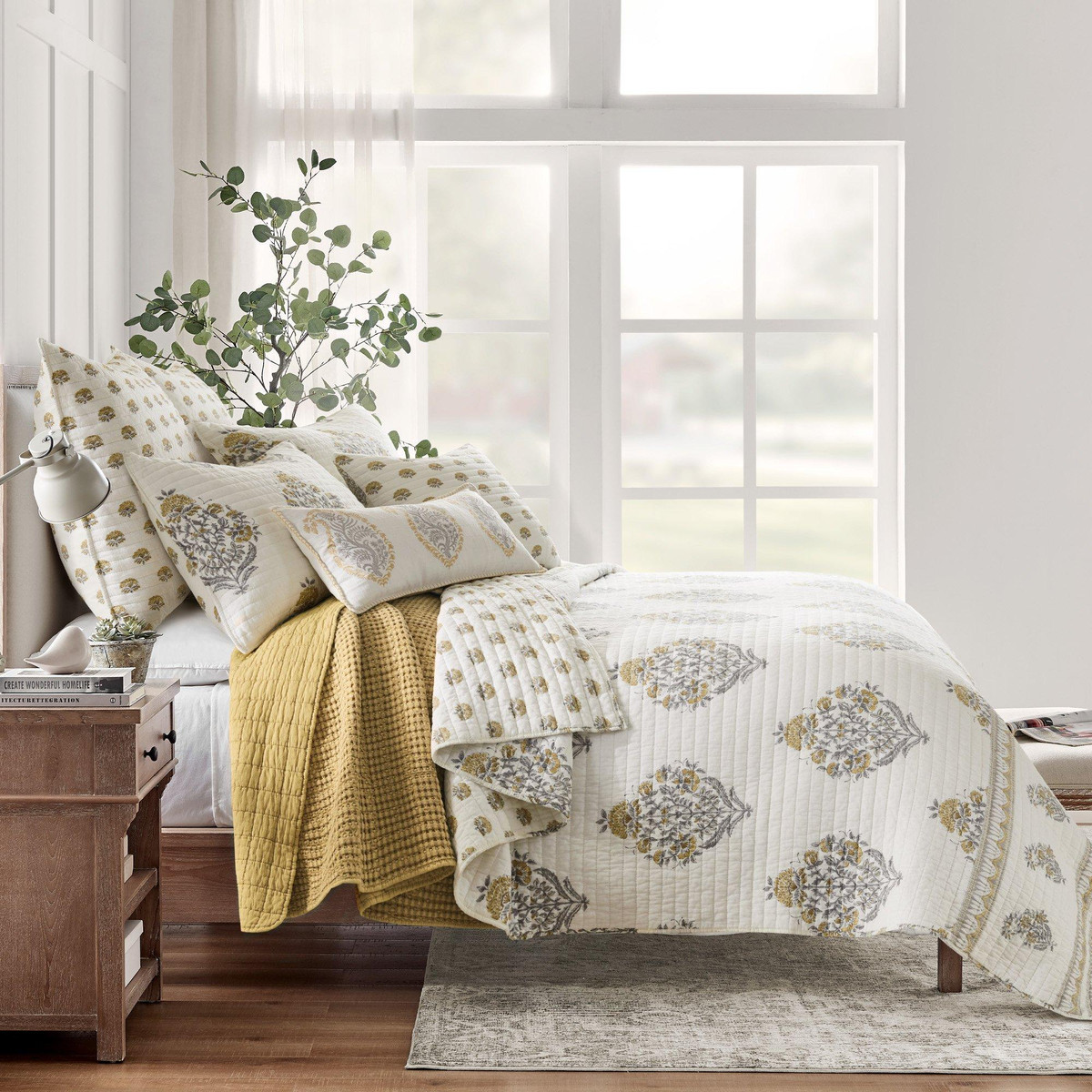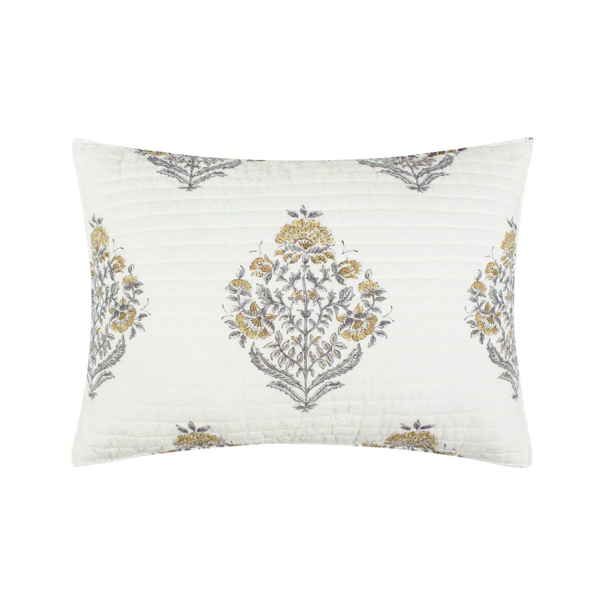 Refresh your bedroom with the Kamira Ochre Reversible King Quilt Set by Levtex Home. Inspired by summer country gardens, it features a bold floral bush with a unique border in ochre, cream, and grey. The reverse displays a delicate mini floral pattern on a cream background. Made from soft cotton with a cotton-rich fill, this lightweight, machine-washable set blends comfort and charm for a timeless look.
