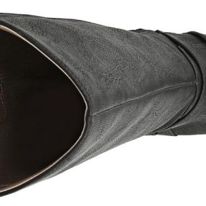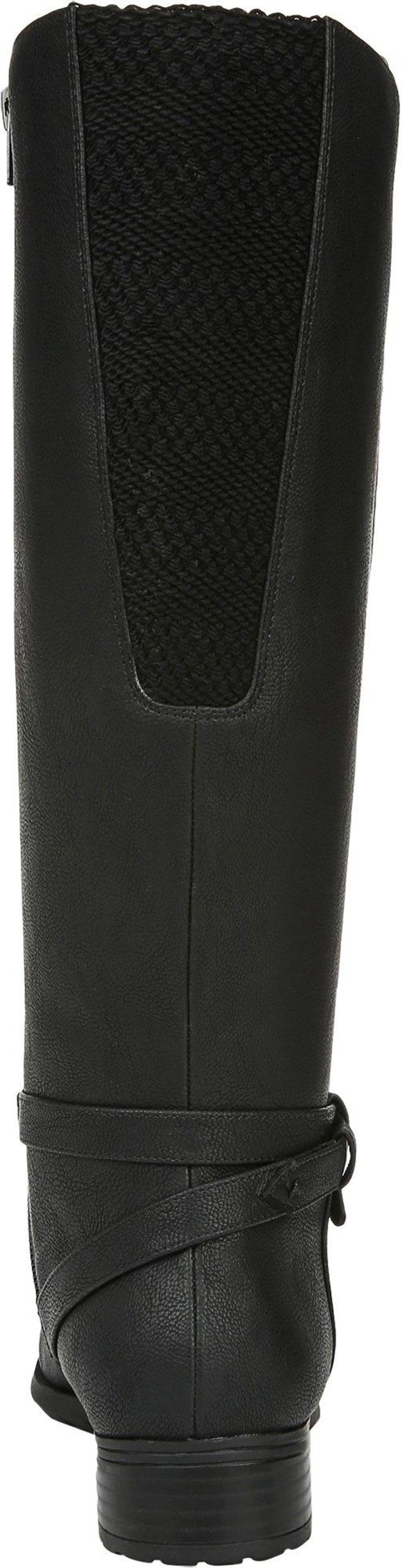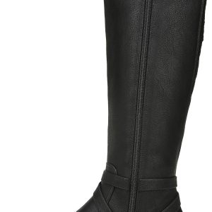 Classic & comfortable, this water-resistant riding boot will keep you looking & feeling great all season. Water-resistant faux leather upper with a round toe, crisscrossing strap detail, metallic stud, & stretch back panel. Boot shaft is 15.25” & calf circumference is 18”.