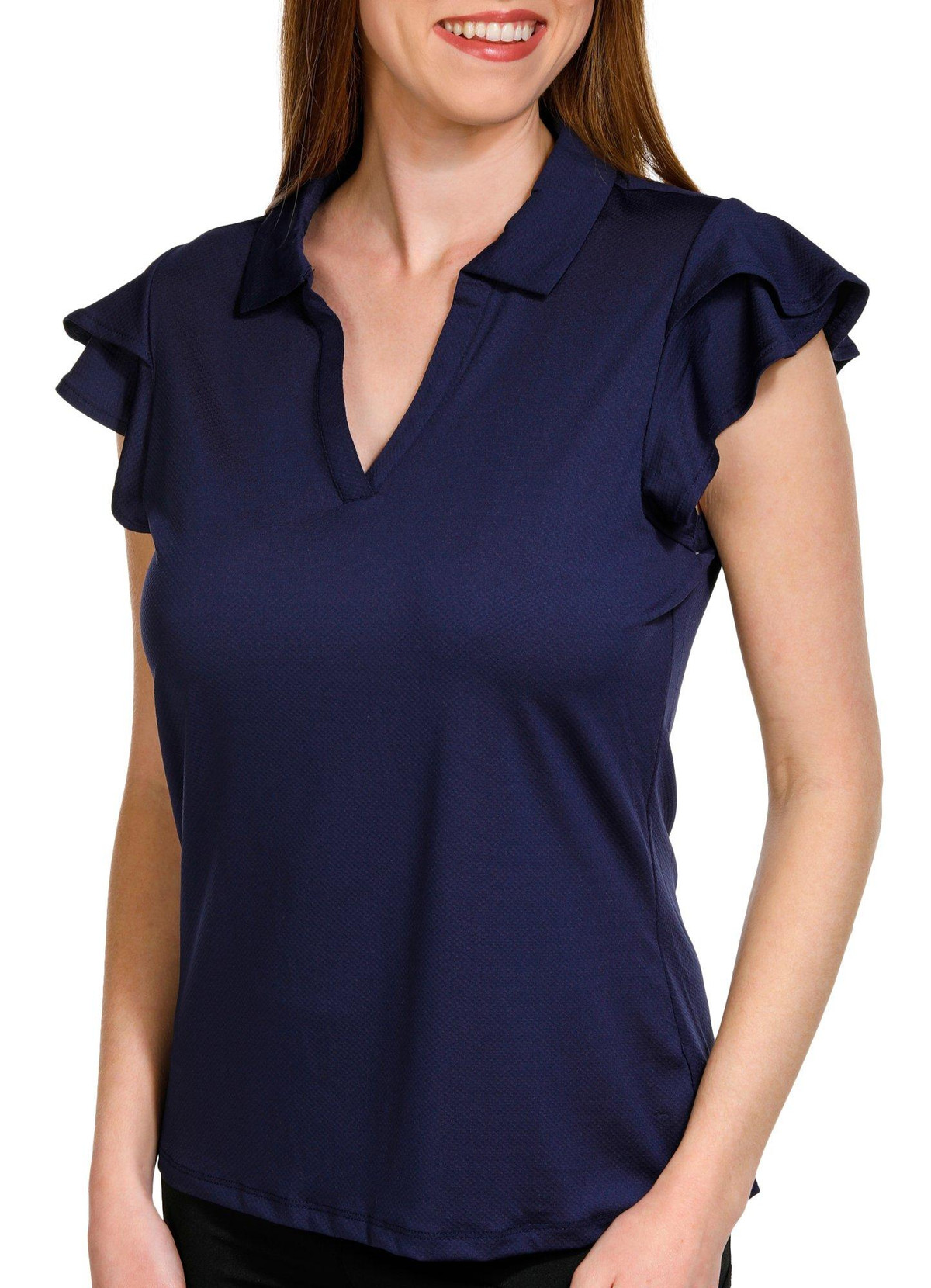 Lillie Green offers vibrant practical designs to help you stand out on the course! This short sleeve top features a solid color design on soft lightweight stretch fabric, V- neckline with spread collar, double layered flutter short sleeves, quick-drying properties, and UPF 50 sun protection. Top length is approximately 25 inches. The fabrication is 92% polyester and 8% spandex.