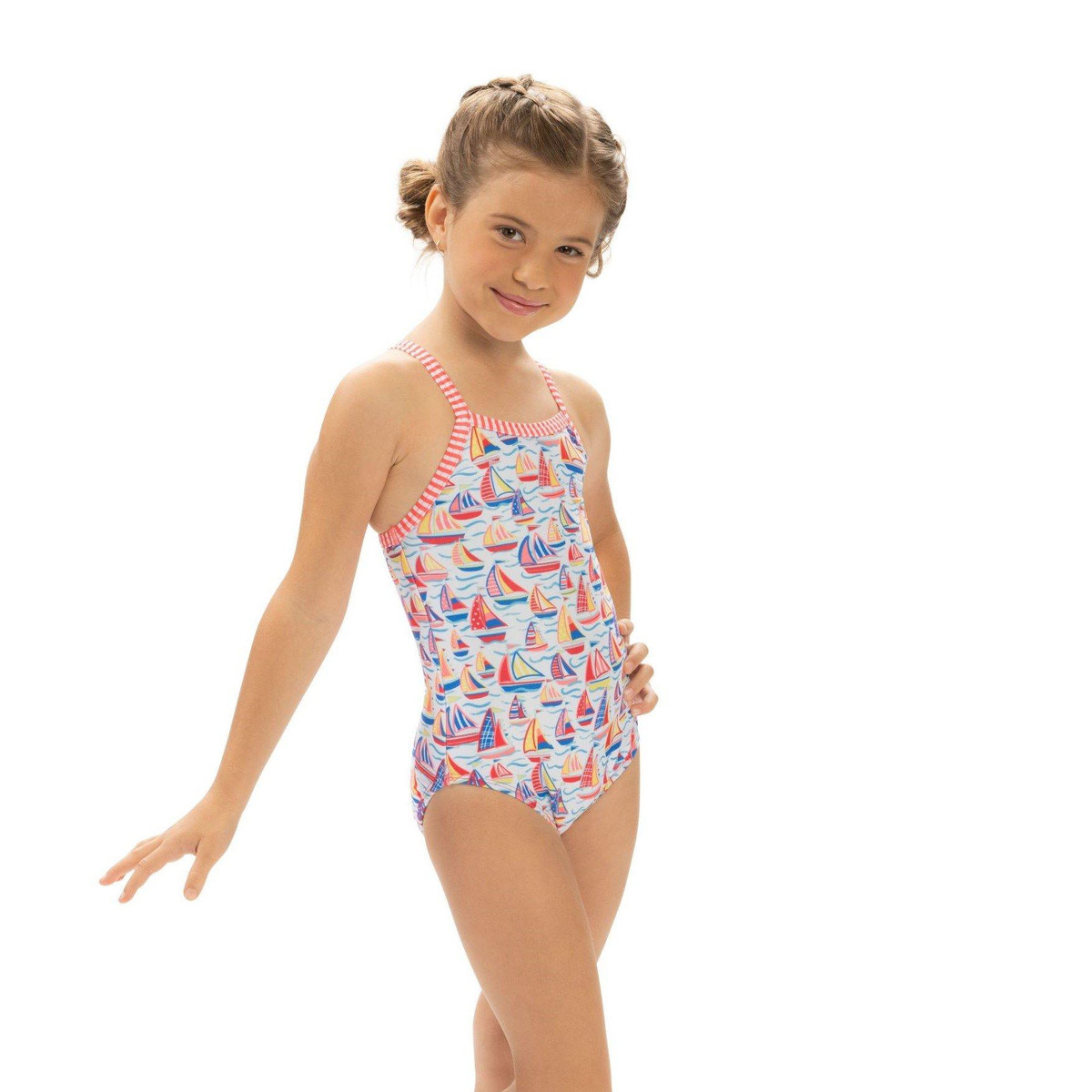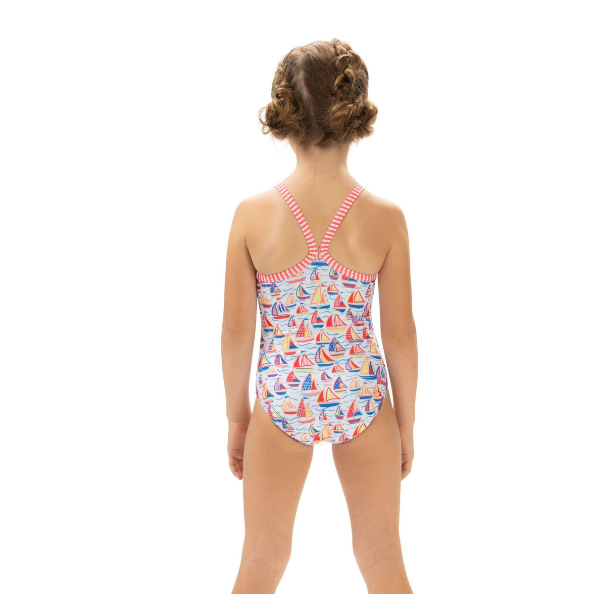 Set sail on summer adventures with our fun and colorful girls’ swimsuit, featuring a playful sailboat design in vibrant peacock colors. Offering UPF 50+ sun protection and chlorine resistance, this swimsuit is perfect for swimming pool and beach days. The no-fuss pull-on styling ensures a comfortable fit, making it ideal for active outdoor fun. Your little one will love the freedom and style this swimsuit provides. Fabrication 91% polyester, 9% spandex.