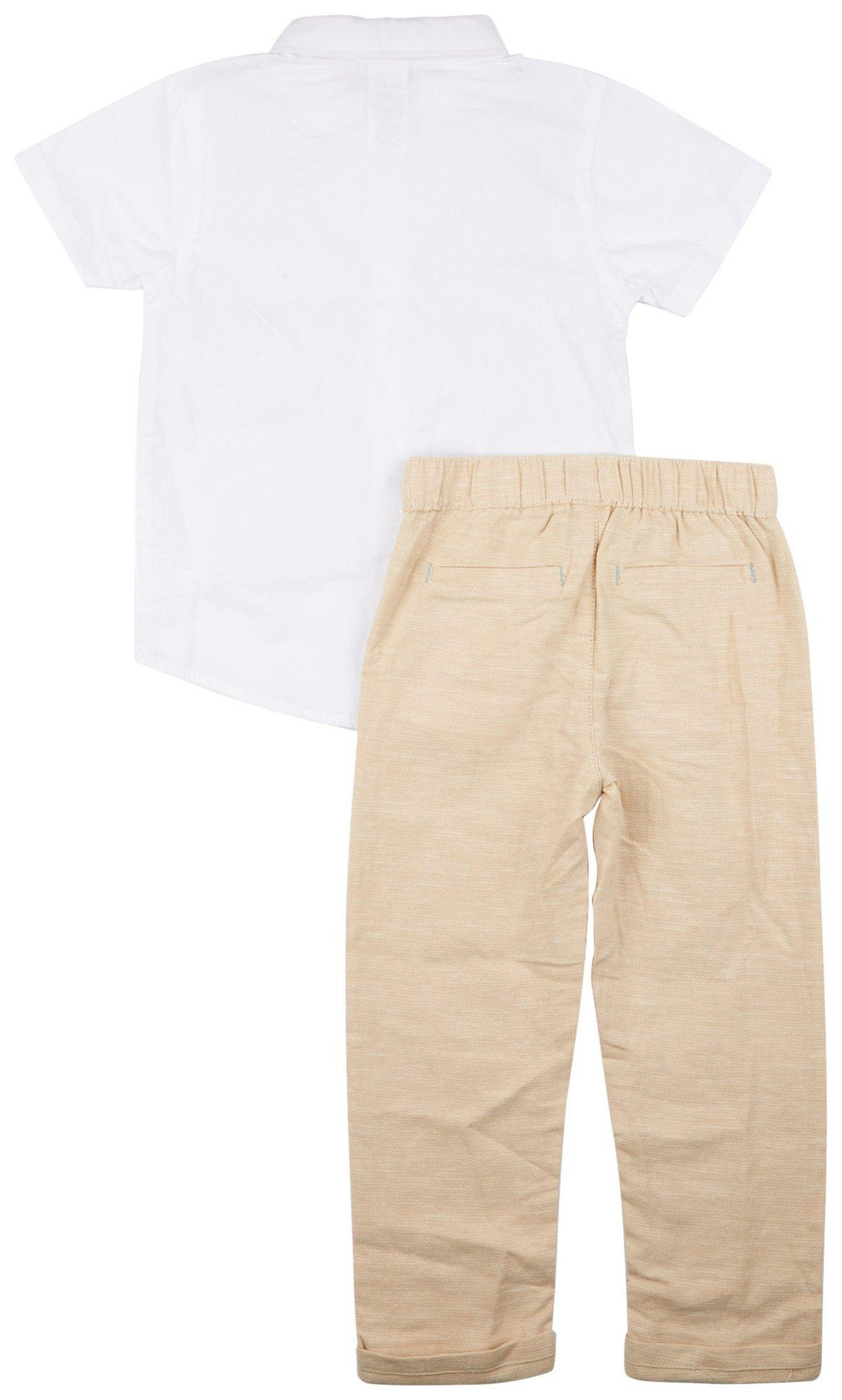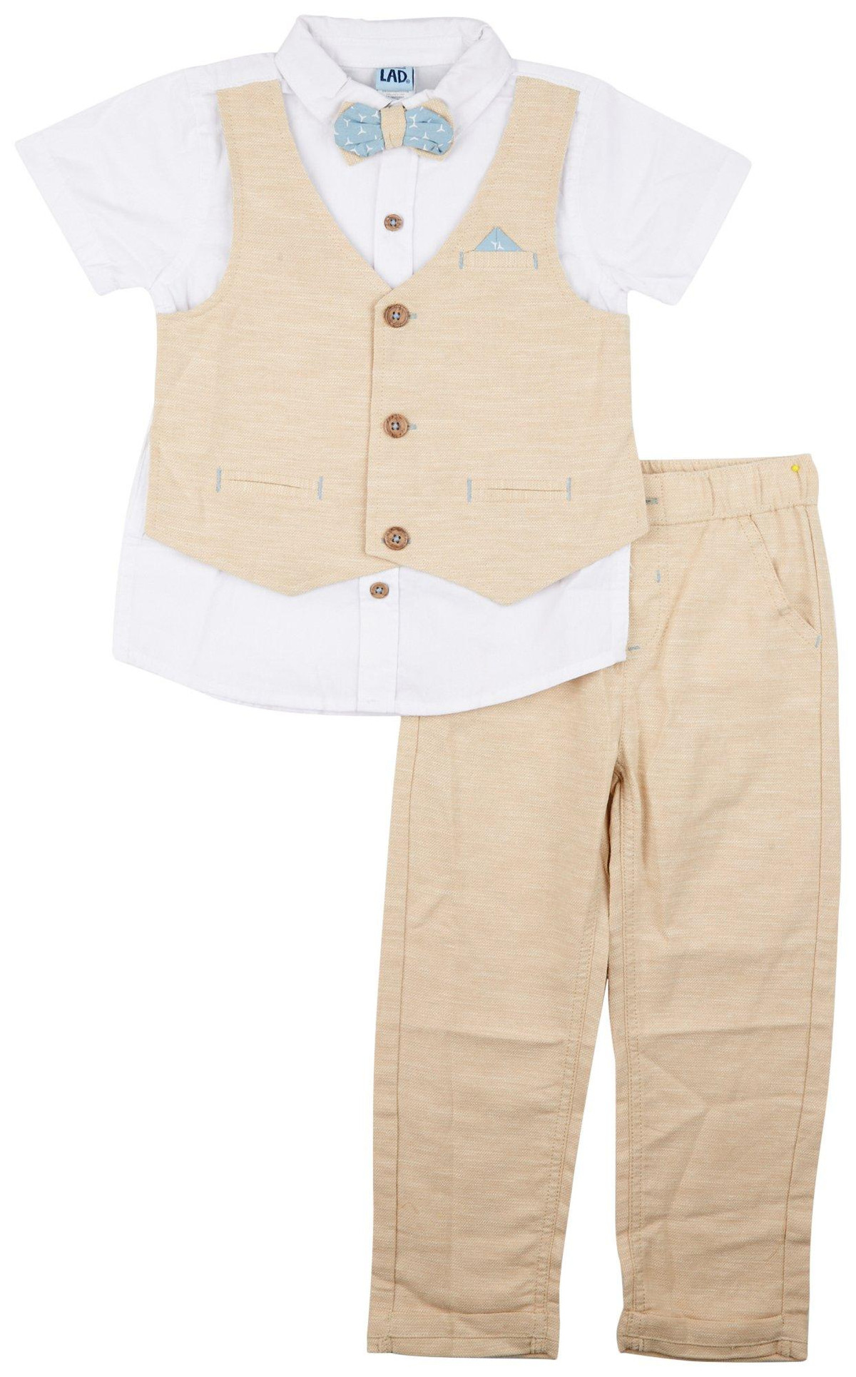 Little Lad offers handsome fashion for stylish little boys and girls. This 3-piece set includes a button closure with attached vest top, matching bow tie, and a matching cuffed two pockets twill pant with a button ply, zipper closure, and faux back pocket.