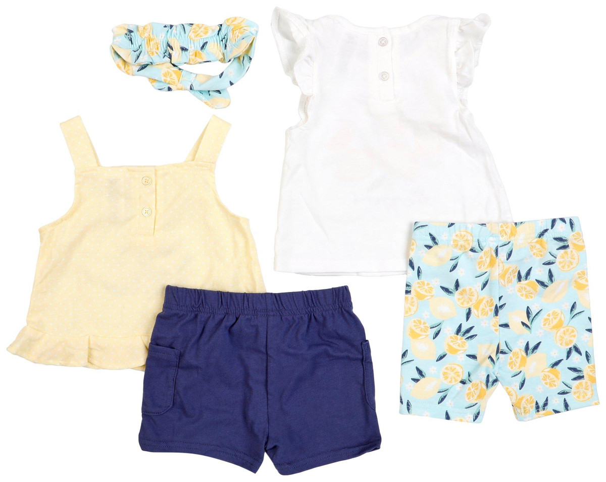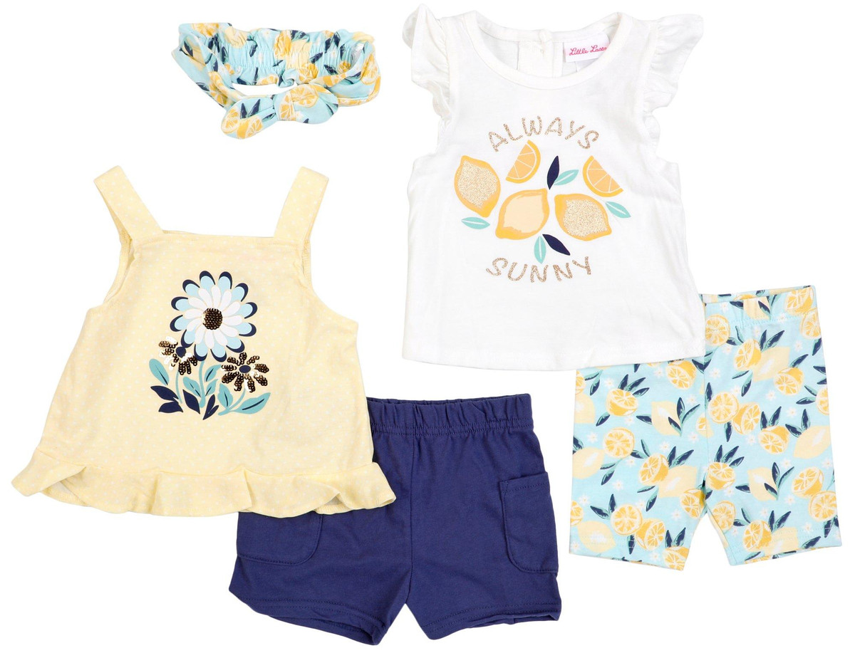Sweet meets stylish in this warm-weather set. Featuring two floral screen print, ruffled tops with embellishments, two pairs of pull-on shorts and a cute matching head band. This set blends playful charm with everyday comfort, perfect for sunny day adventures.