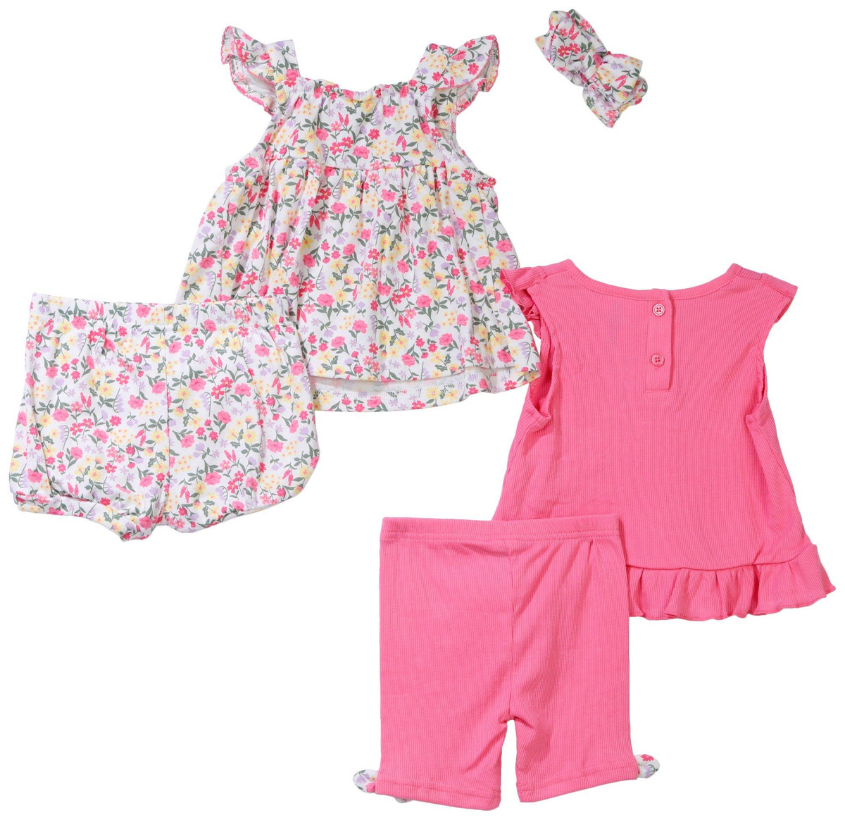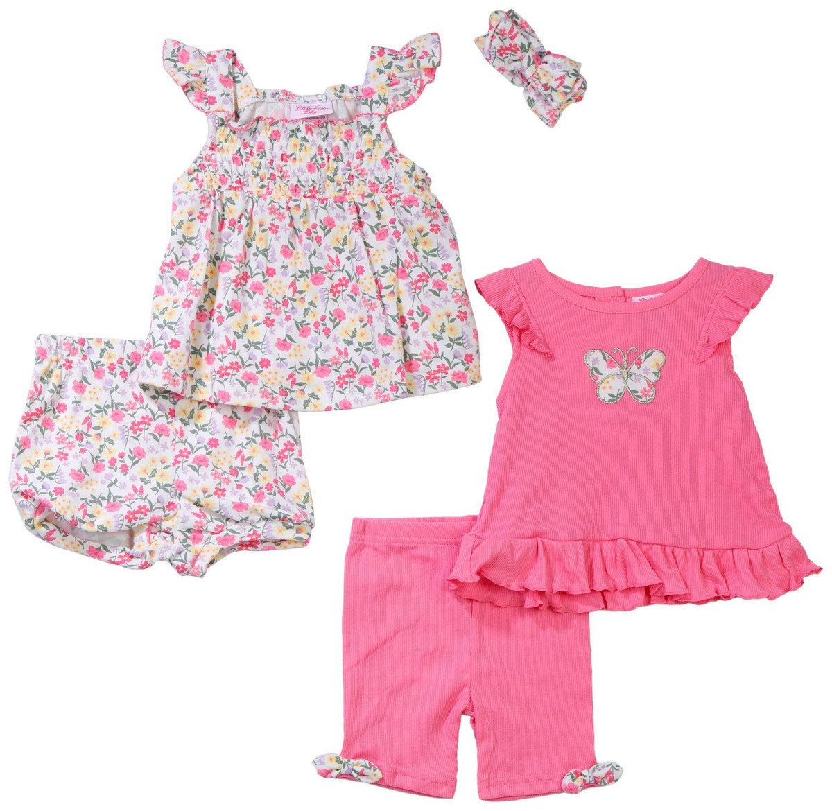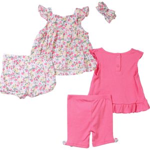 Mix and match with this five piece baby girl set from Little Lass. It includes a pink sleeveless top with biker shorts and a floral outfit with a diaper cover. A coordinating headband ties both looks together for a sweet finish. Soft fabrics and cheerful prints make this set perfect for playdates or photo moments.