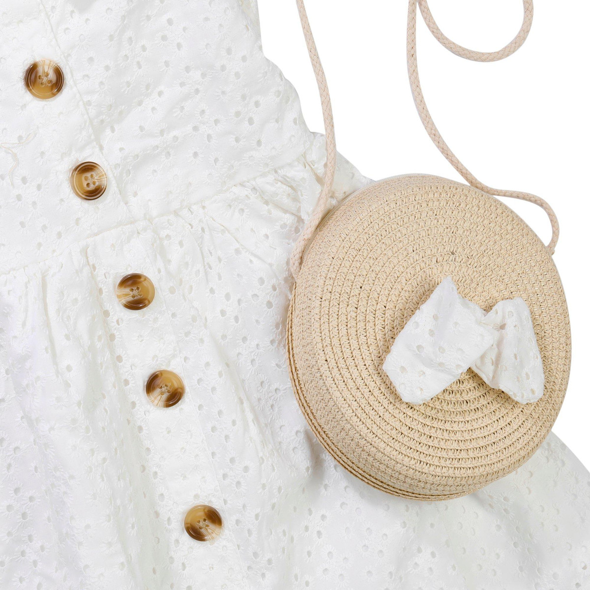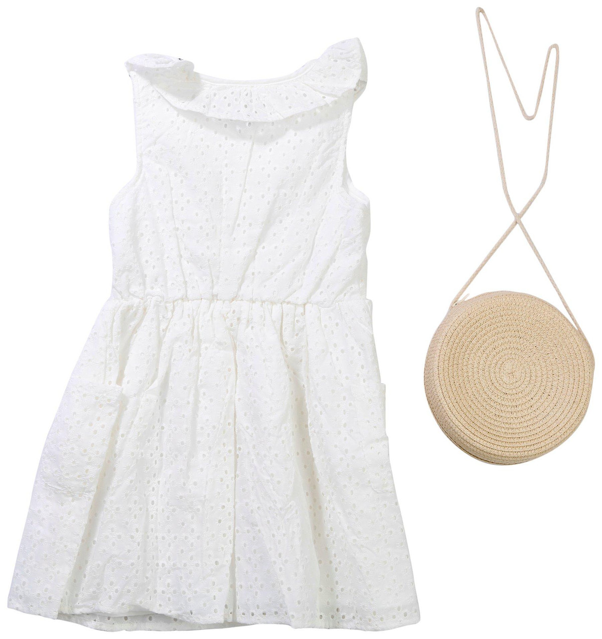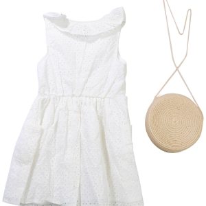 The Little Girls 2 Pc Dress Set is a sweet and stylish duo featuring a sleeveless eyelet dress with a charming button down front. It comes with a straw purse adorned with a matching eyelet bow, perfect for sunny days and special outings.