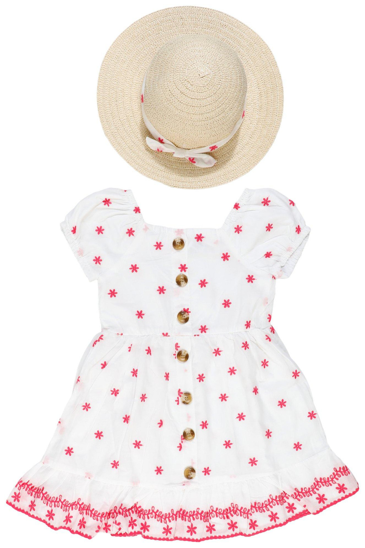 Dress your little one in charming elegance with the Girls 2-Piece Poplin Dress and Hat Set. This delightful ensemble features a beautifully embroidered dress with a faux button front, adding a touch of sophistication. The matching hat completes the look, providing both style and sun protection.