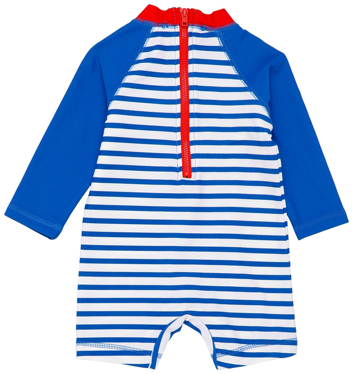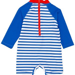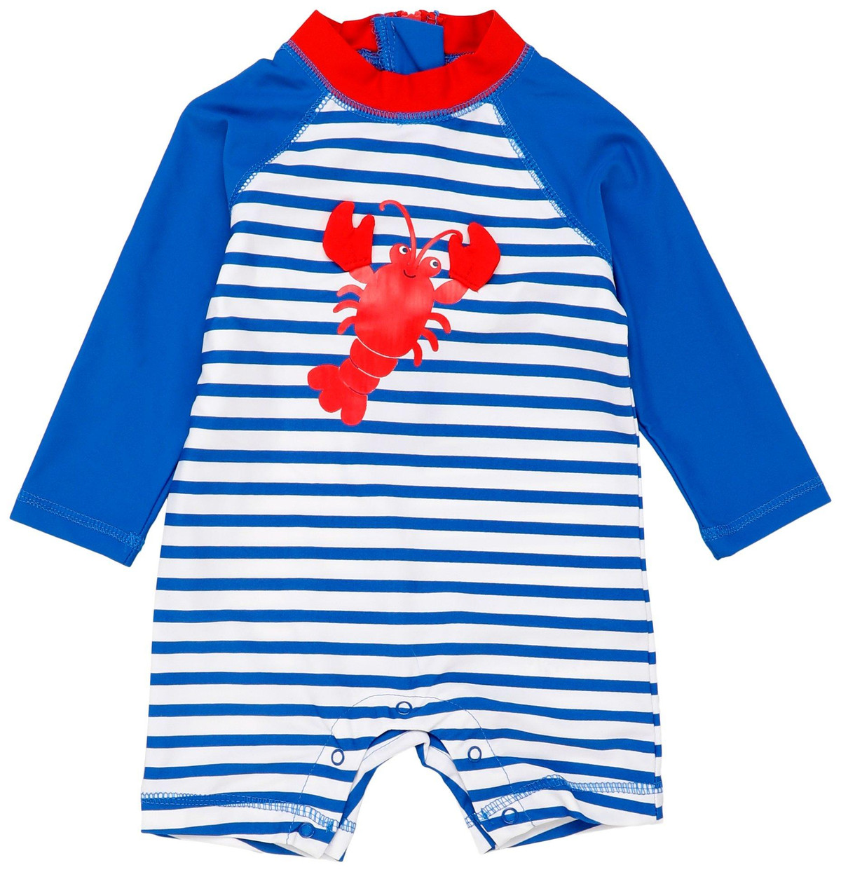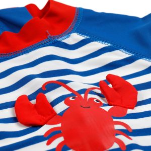 Make a splash in this Raglan Lobster Rash Guard Swimsuit! Featuring UPF 50+ sun protection with long sleeves, a 3/4-zip in back, and a bold striped print design with raglan sleeves in solid blue, with a cute 3D lobster on the chest. Perfect for active days in the sun, this suit combines comfort, protection, and style. Fabrication is: 82% mylon, 18% spandex.
