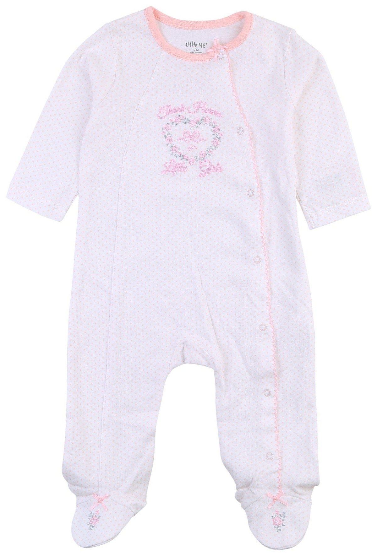 This footed sleeper from Little Me is a cute and cozy piece for your baby girl! It features a stylish polka dot print, a full front snap button closure and an embroidered Thank Heaven For Little Girls quote. Fabrication is 100% cotton.