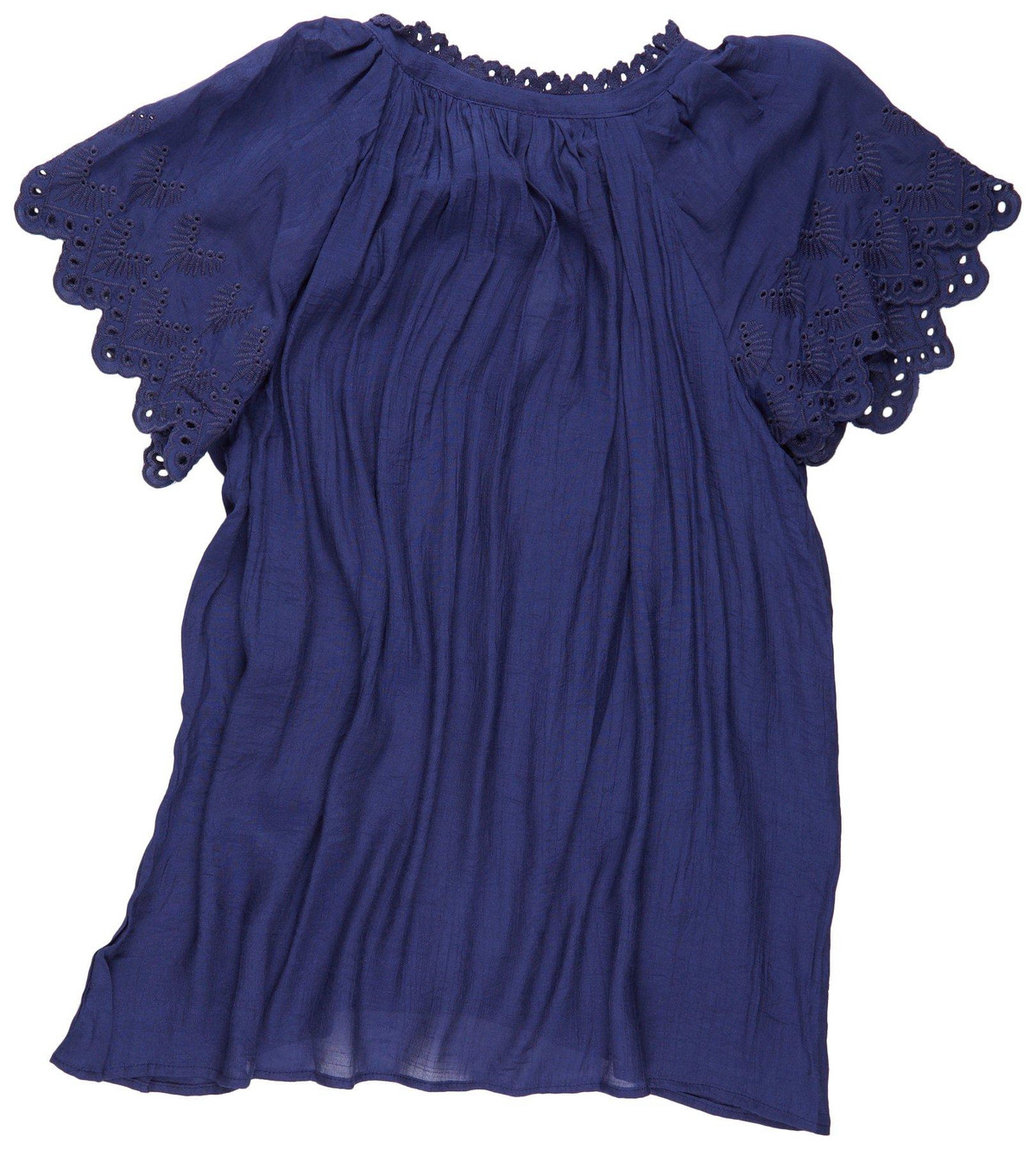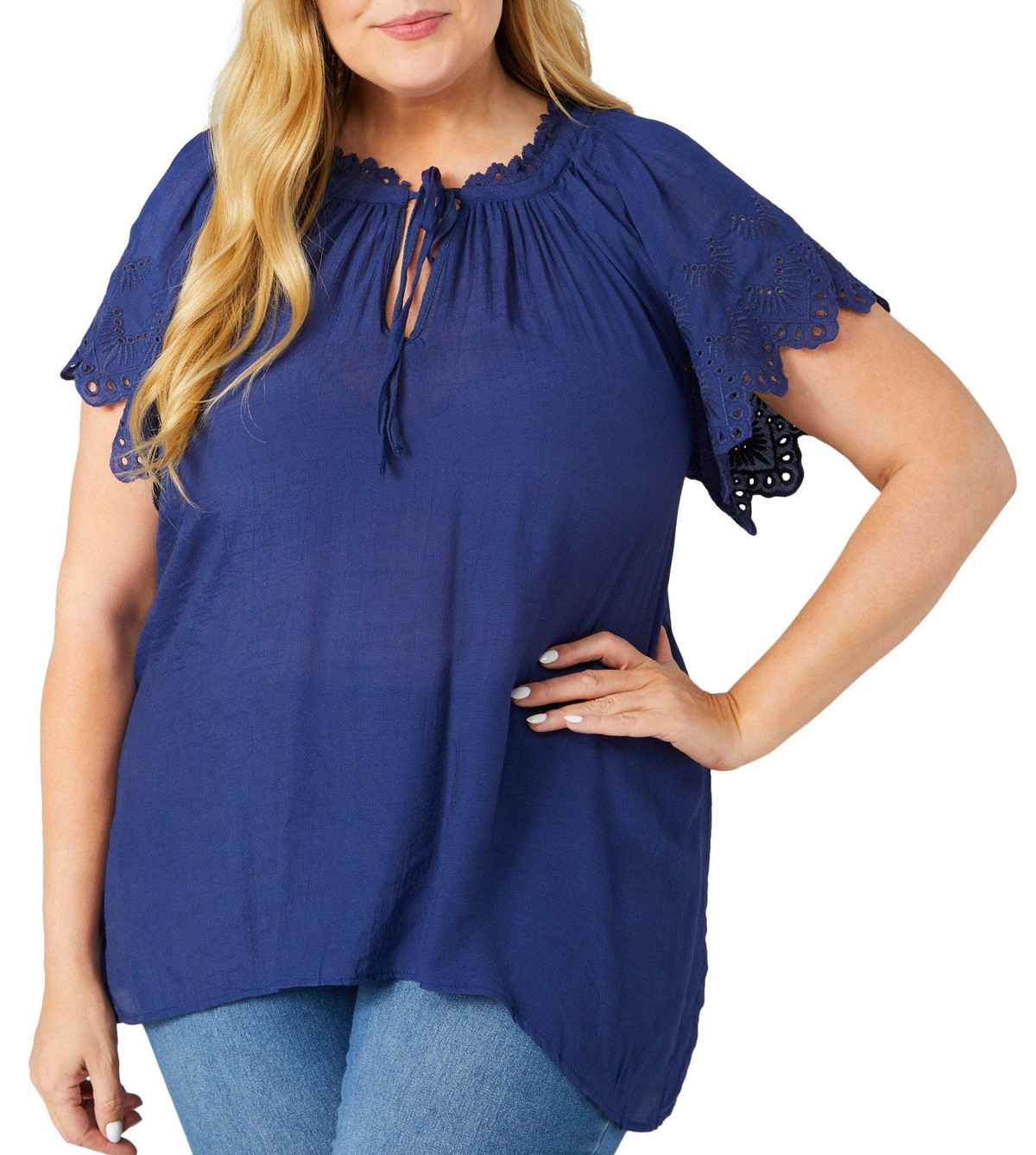 Elevate your style with the Plus Short Sleeve Flounce Top, crafted from a blend of polyester and rayon for a comfortable fit. This top features a stylish solid color and a keyhole neckline with a front tie, adding a touch of sophistication. The short flounce sleeves with scalloped hem and eyelet detail create a charming look, while the 29-inch length ensures a flattering silhouette. Perfect for any occasion, this top pairs beautifully with jeans or skirts for a versatile and chic outfit.