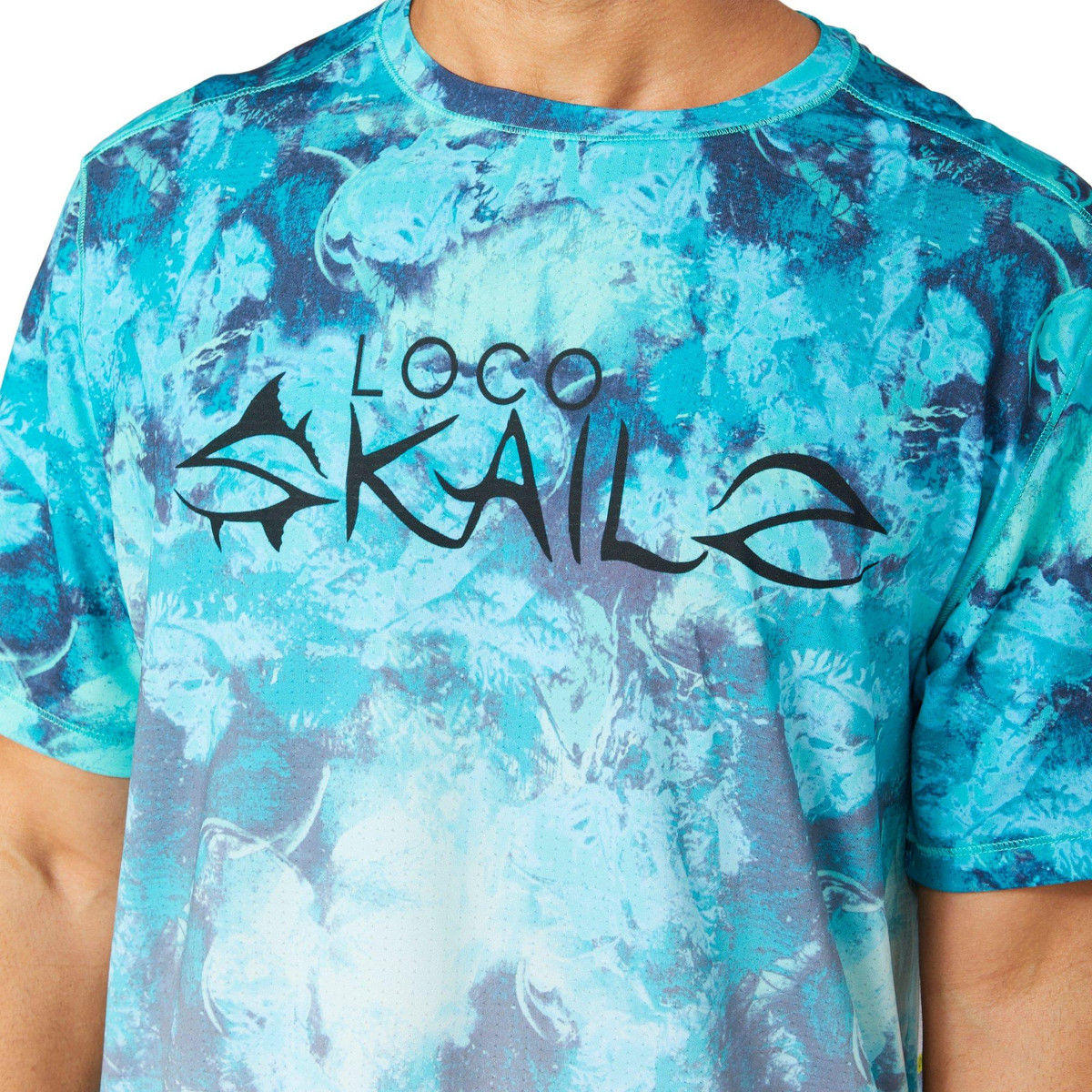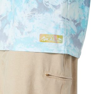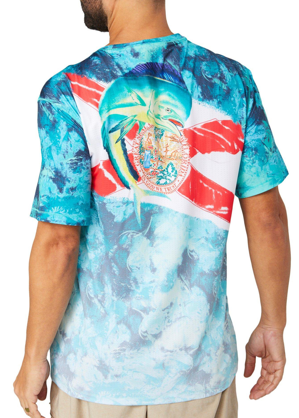 This short sleeve shirt features a fishing print design on lightweight fabric, a crew neckline, moisture-wicking technology, UPF 50 sun protection, and a comfortable fit. Perfect for any land or sea adventure. Fabrication is 92% polyester, 8% spandex. The top length measures approximately 27 in.