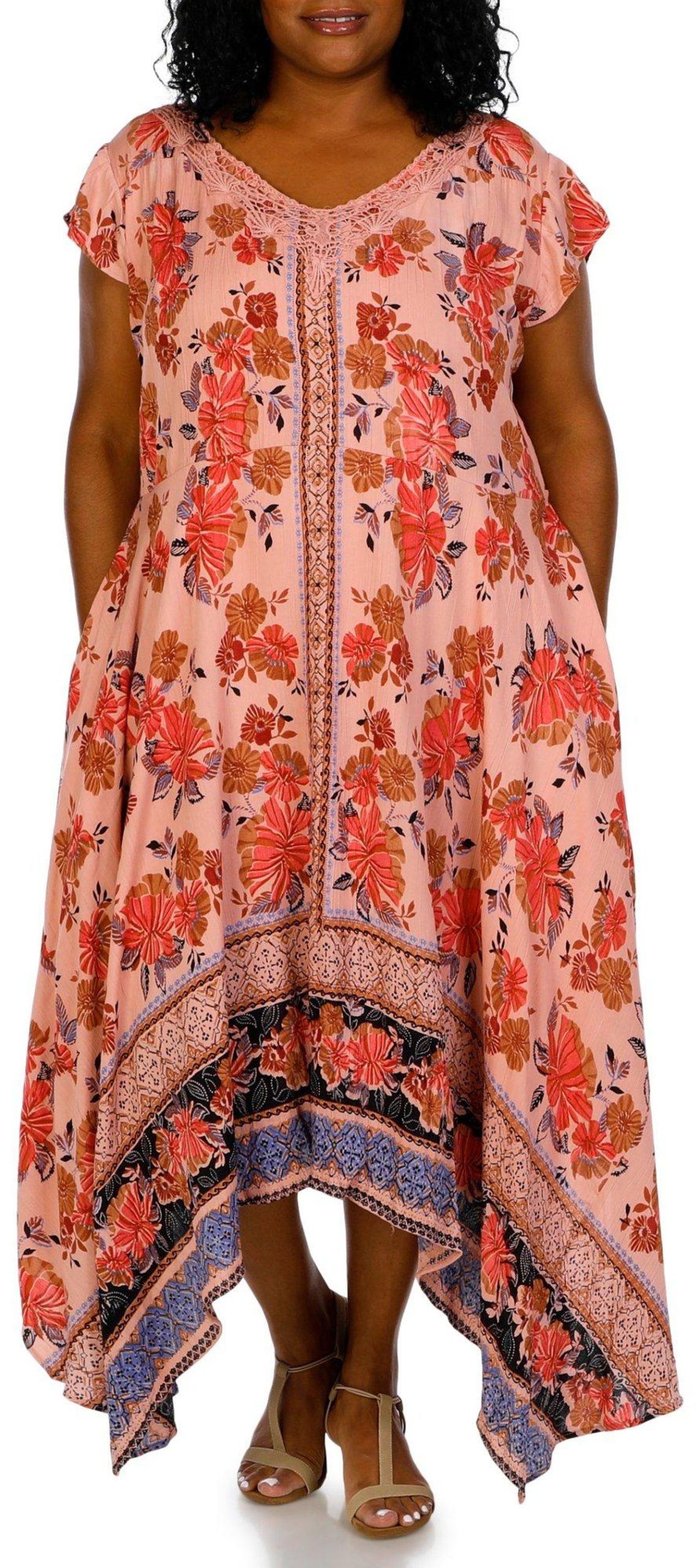 Our Plus Short Sleeve Crochet Trim Border Midi Dress offers a charming floral print with a flattering v neckline. Delicate crochet trim adds a touch of elegance, while the midi length provides a graceful silhouette. Perfect for casual days or dressed up occasions. Fabrication 100% rayon.