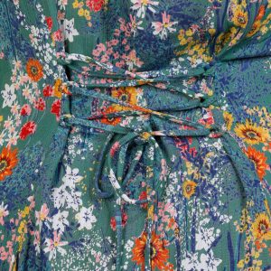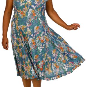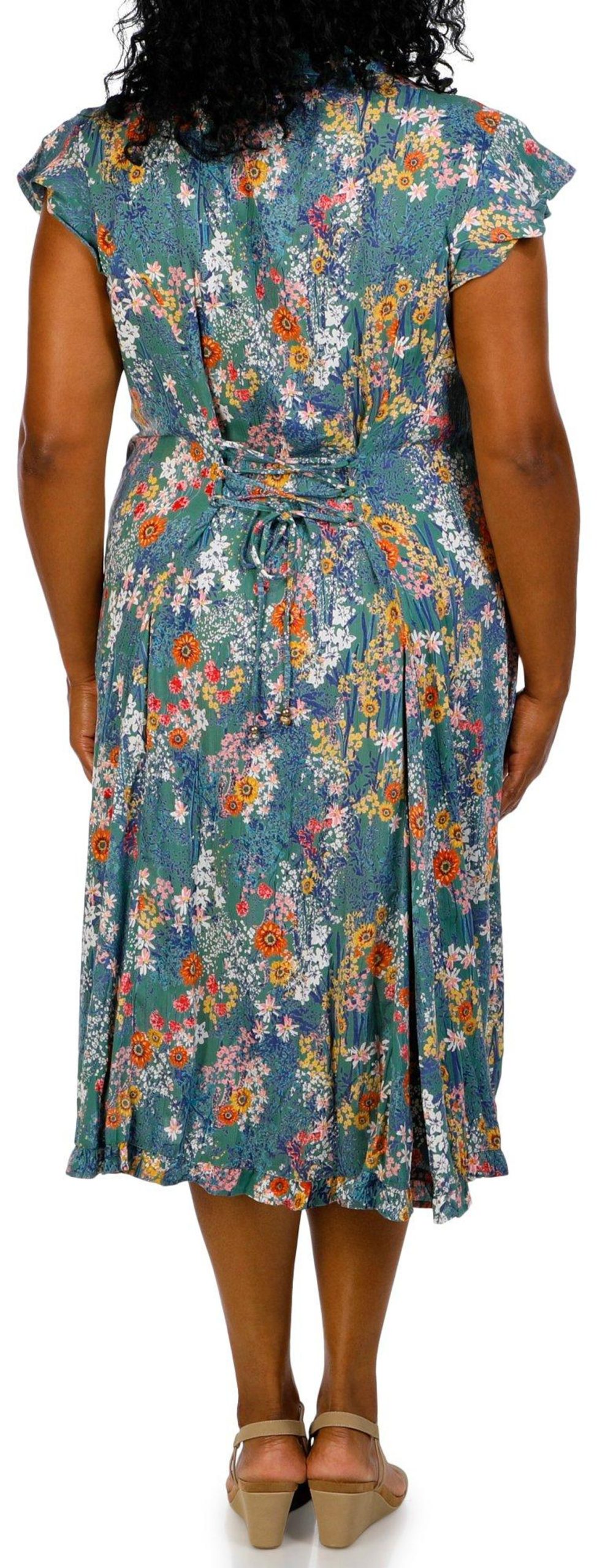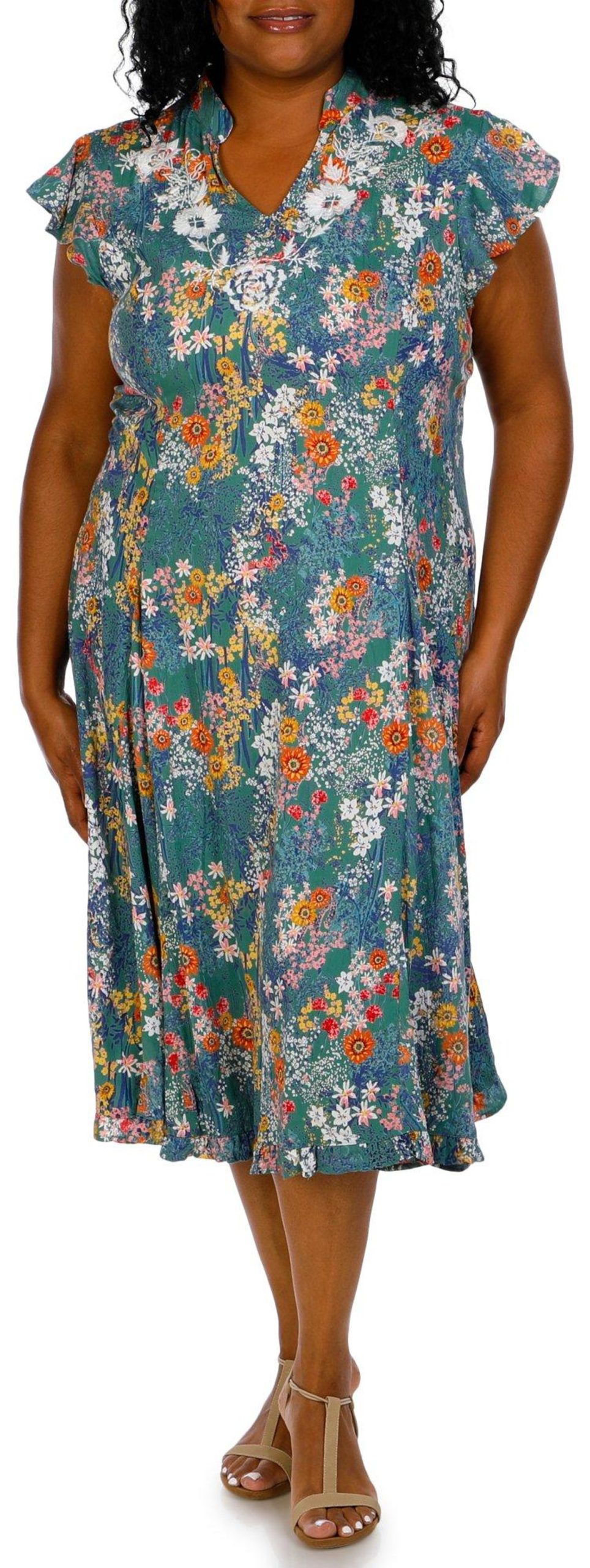 This plus size short sleeve dress features a beautiful floral print with a flattering v neckline and elegant flutter sleeves. The tie back detail adds charm while the 44 inch length offers graceful coverage. Perfect for warm days or casual outings. Fabrication 100% rayon.