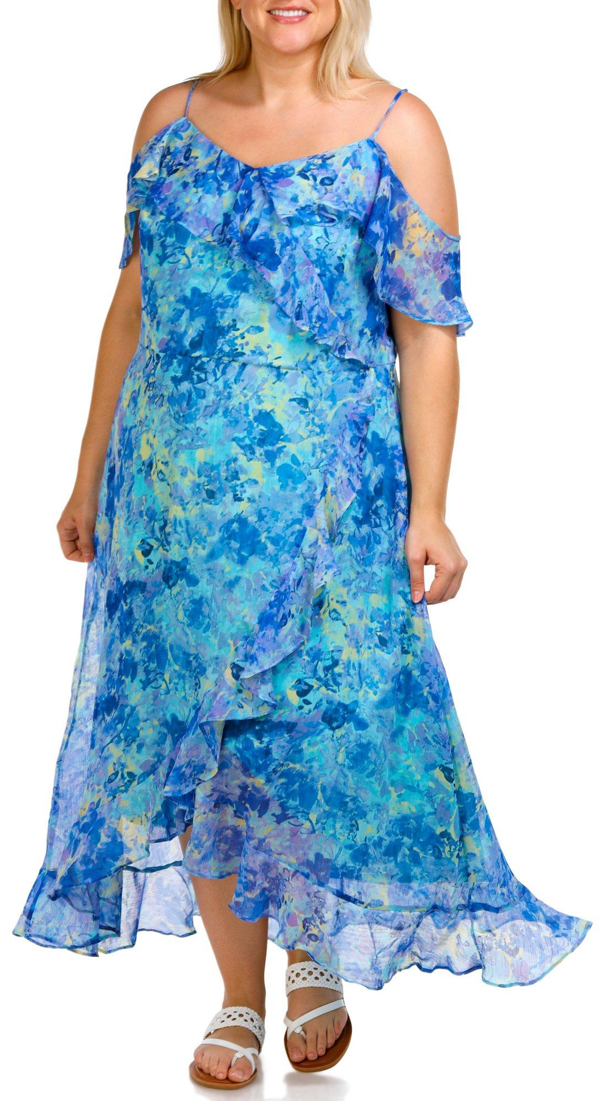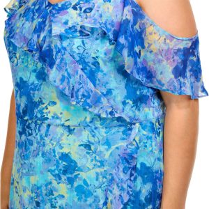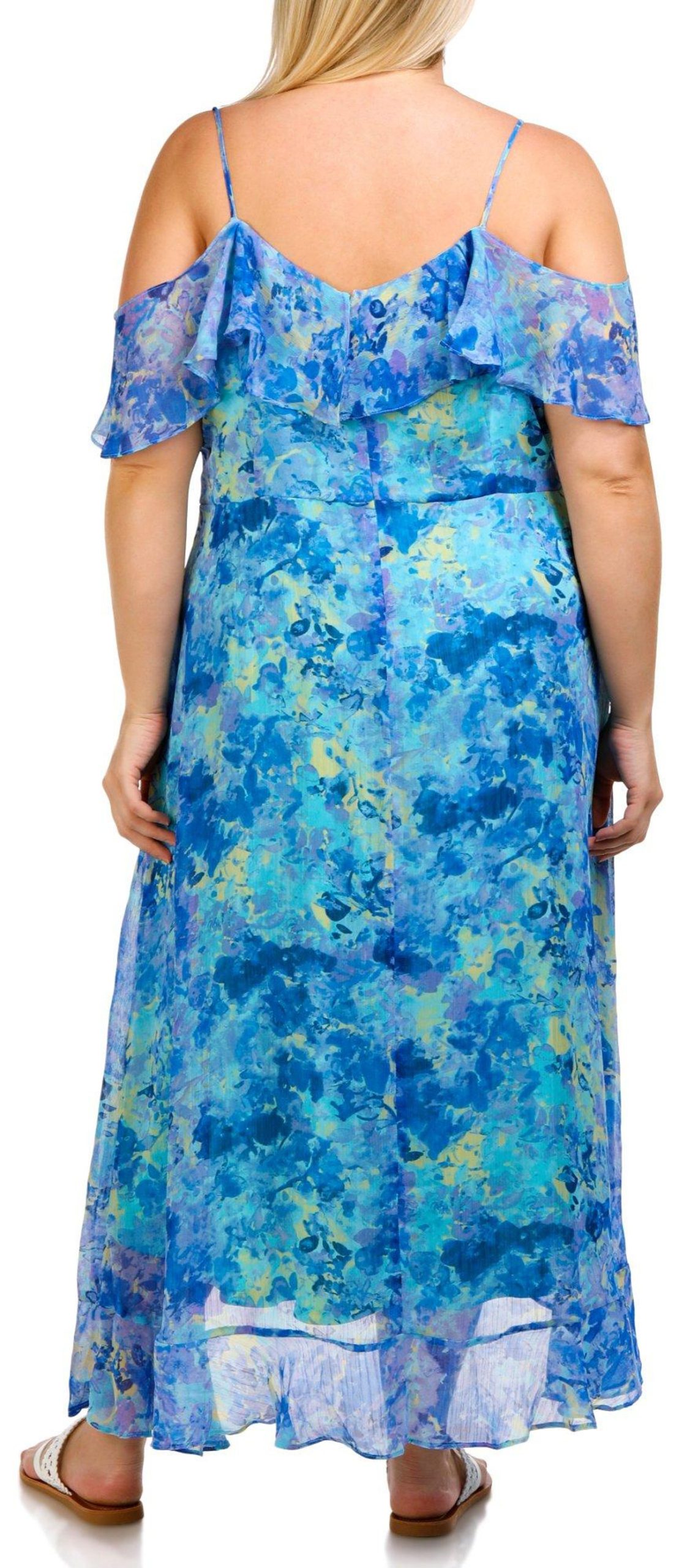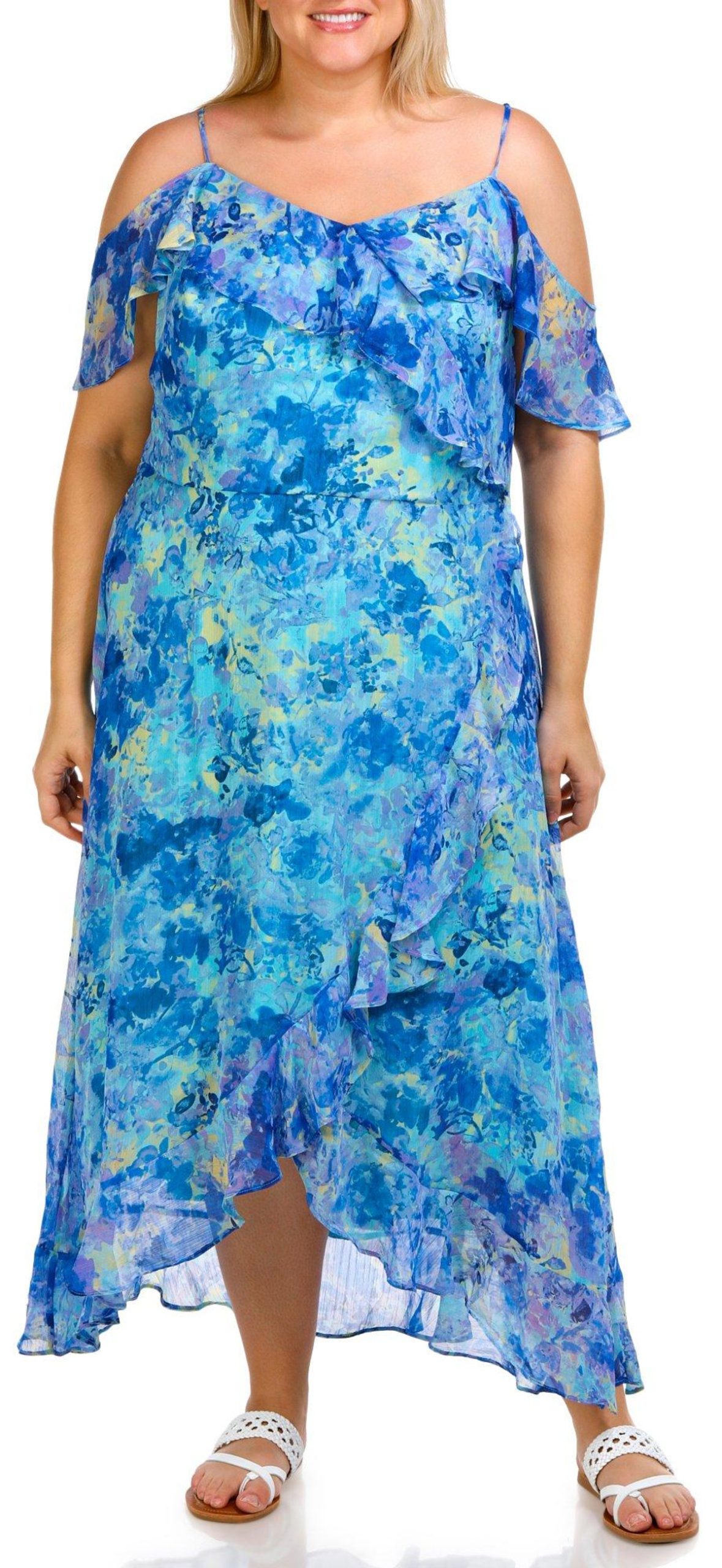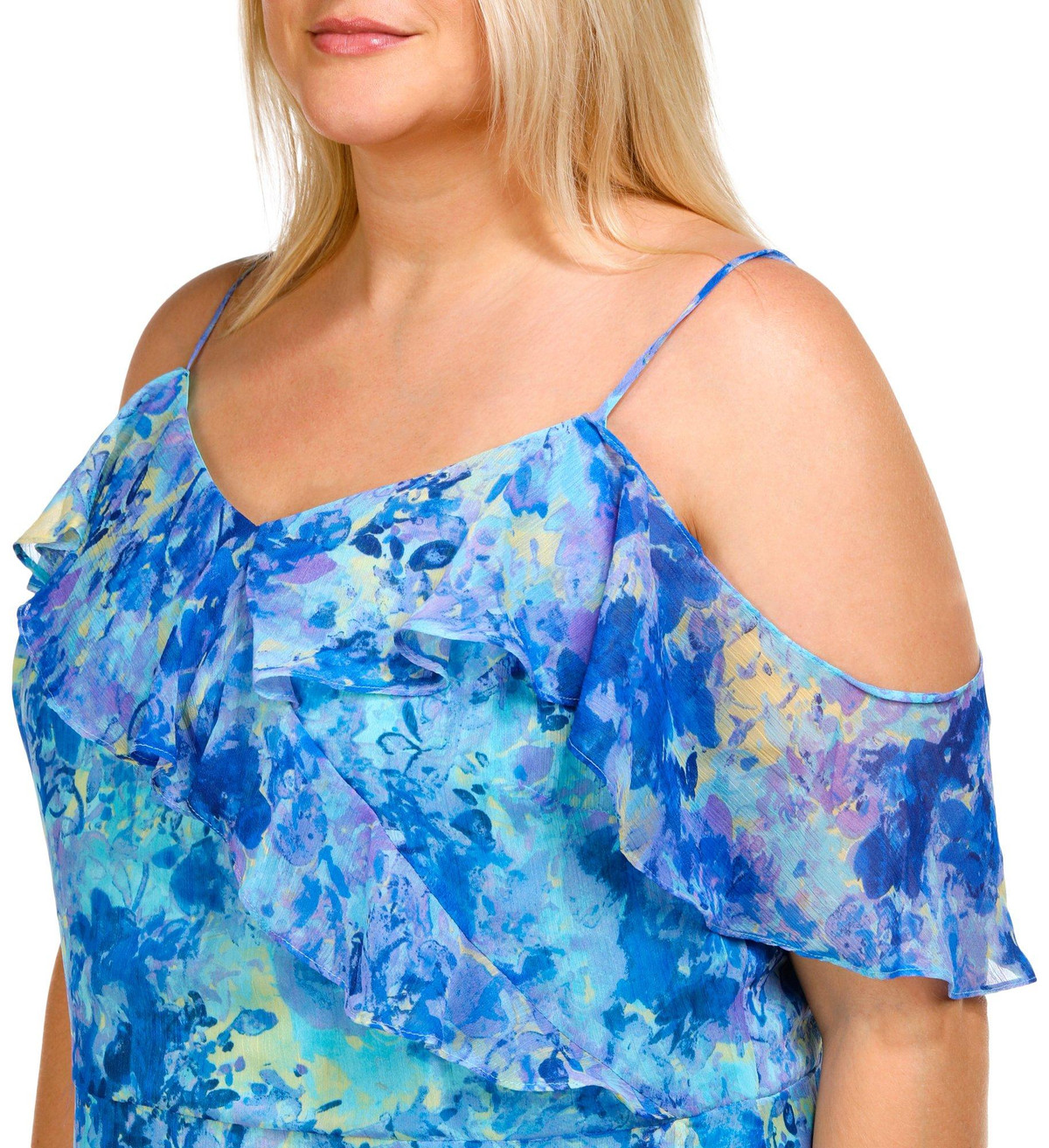 Introducing the Plus Cold Shoulder Midi Dress, crafted from 100% polyester for a comfortable and elegant fit. This stylish dress features a chic print, a cold shoulder design, and a ruffle tier skirt that adds a touch of sophistication. The back zip ensures easy wear, while the 48-inch midi length makes it perfect for various occasions, from casual outings to special events.