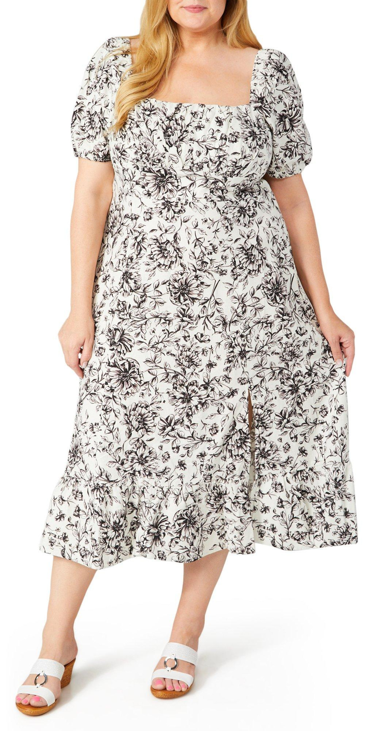 Embrace effortless charm with this Short Sleeve Midi Dress. Featuring an elastic square neckline and a beautiful floral print, this dress is designed to flatter. The leg split adds a touch of allure, making it perfect for any occasion. Crafted for comfort and style, this dress ensures you look and feel your best whether you’re attending a garden party or a casual outing. Fabrication is 55% linen, 45% rayon. Lining is 100% polyester.