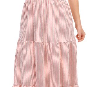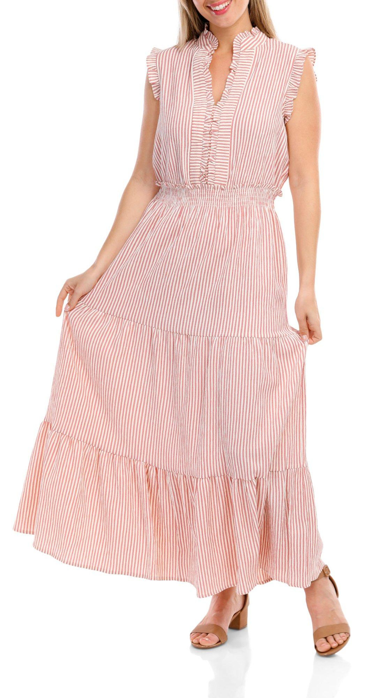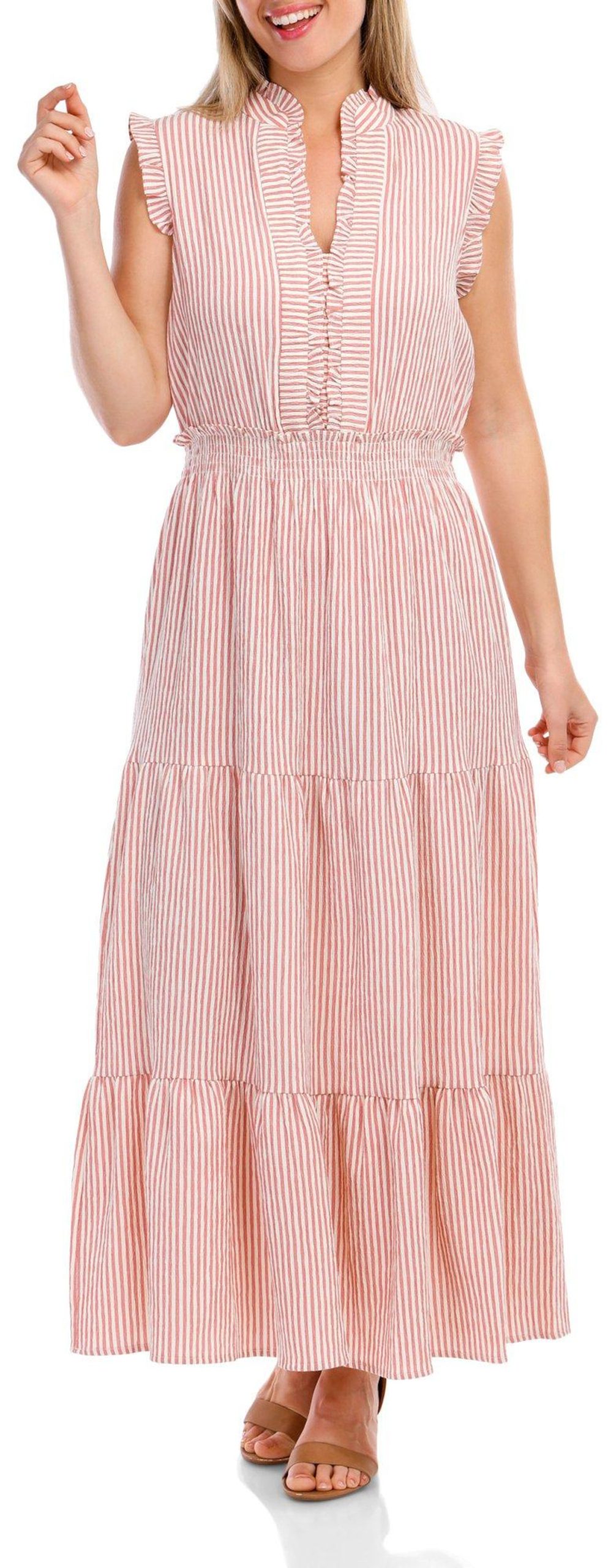 Introducing the Sleeveless Maxi Dress, a perfect blend of elegance and comfort. This dress features a stylish striped pattern that adds a touch of sophistication. The ruffled and smocked details provide a unique texture and flattering fit, making it ideal for any occasion. Fabrication is 80% polyester, 18% rayon, 2% spandex.
