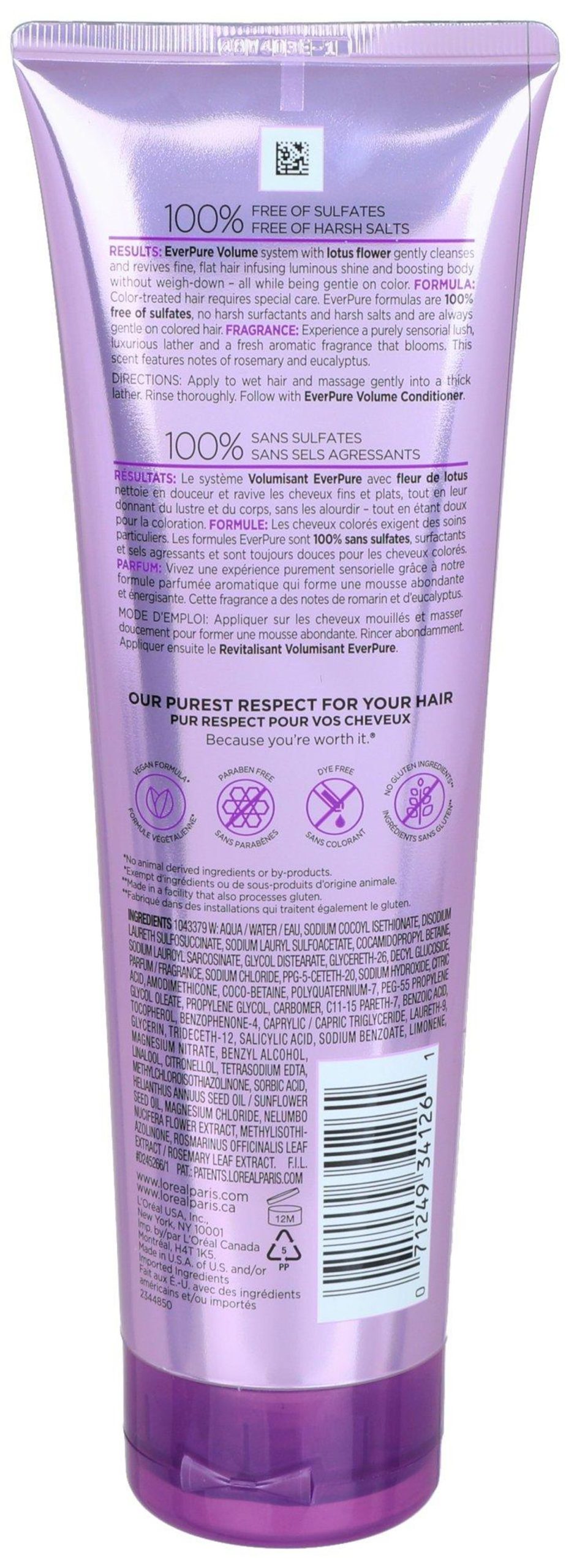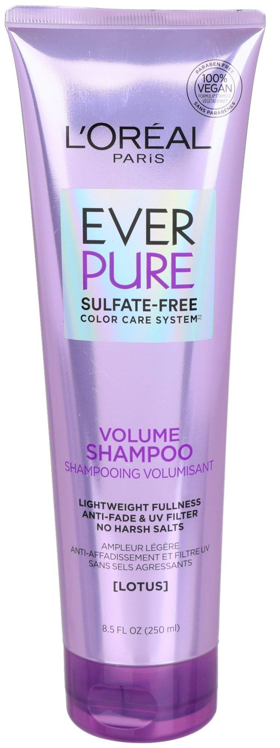 L’Oreal Ever Pure Lotus Volume Shampoo gives lightweight fullness, anti-fade and UV filter protection against color fading, and contains no harsh salts. It gently cleanses and revives fine, flat hair infusing luminous shine and boosting body without weigh-down – all while being gentle on color. Contains 8.5 fl. oz.