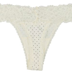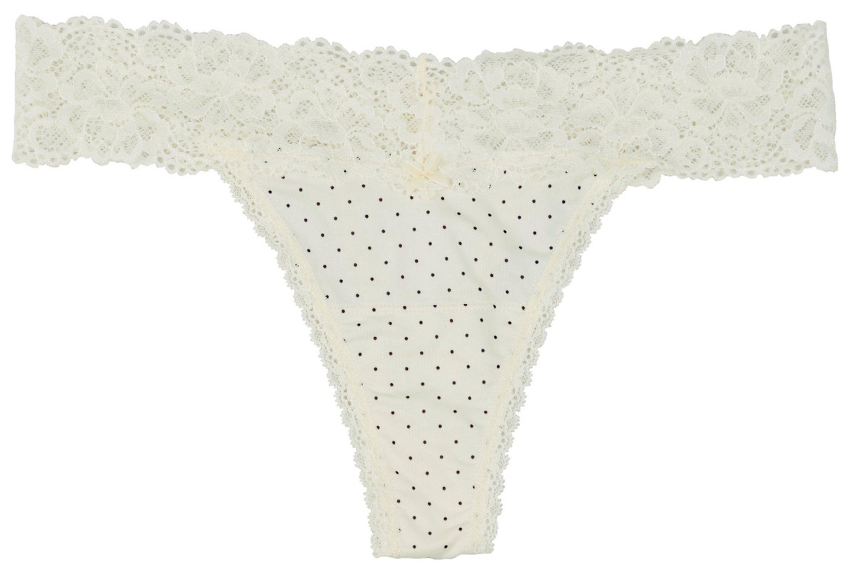 These Maidenform Luxurious Lace Thong Panties feature an elastic waistband and front fabric panel for a smooth, no panty-lines look. Fabrication 86% nylon, 14% spandex, and a 100% cotton lining. DMESLT