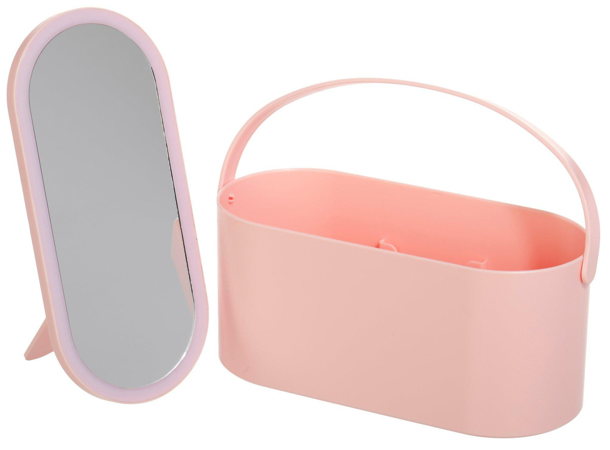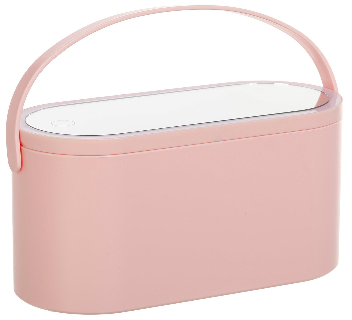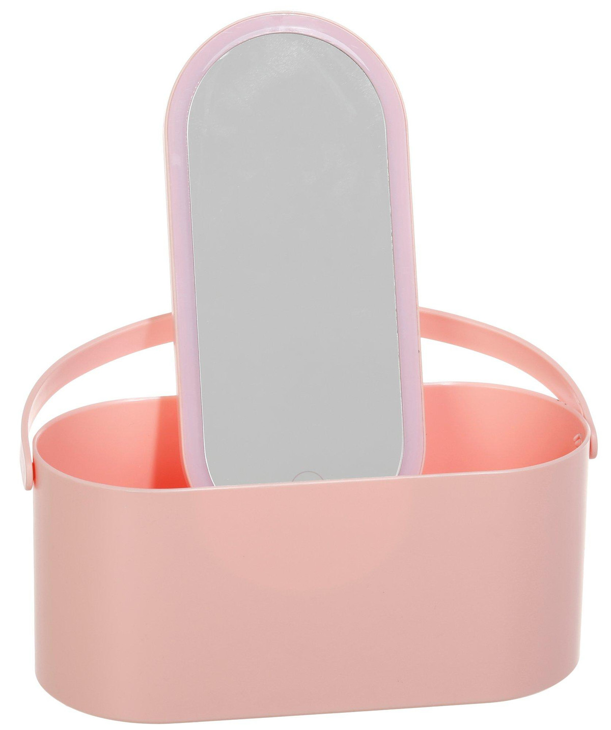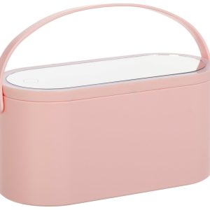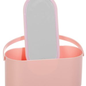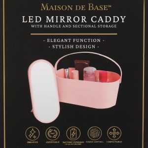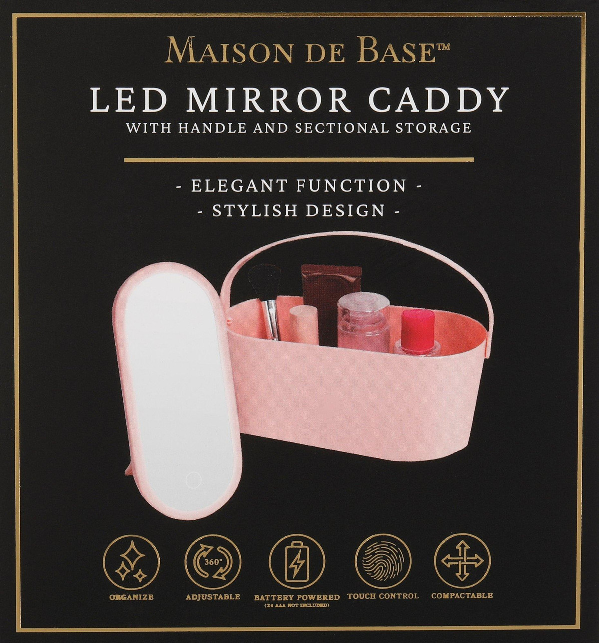 Upgrade your organization with the LED Mirror Caddy, featuring a convenient handle and sectional storage. This innovative caddy combines functionality with modern design, offering touch control for easy lighting adjustments. The built-in LED mirror provides optimal illumination, perfect for makeup application or grooming. Requires 4 AAA Batteries (not included). Measures approximately 4 in x 4.5 in x 9 in.