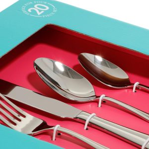 Upgrade your dining experience with this 20 Piece Stainless Steel Flatware Set. Crafted from high-quality stainless steel, this set offers both durability and a sleek, modern design. Each piece is meticulously polished to a mirror finish, adding a touch of elegance to your table. Includes 4 of each: Salad Fork, Dinner Fork, Dinner Knife, Dinner Spoon, and Teaspoon.