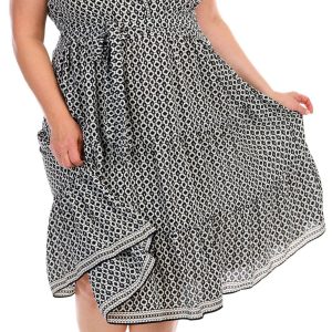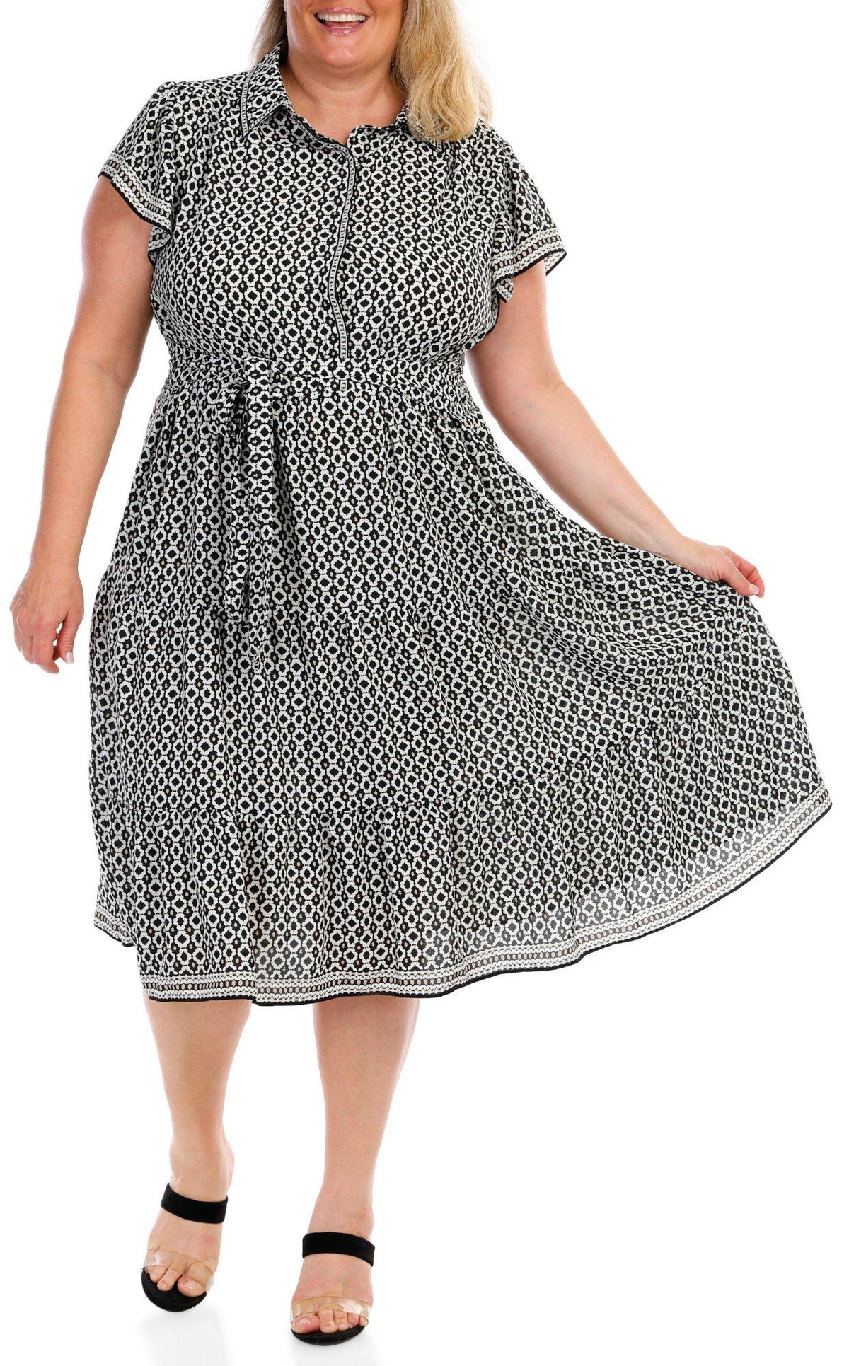 Step out in style with the Plus Geo Print Midi Dress. Made from 100% polyester, this dress features a chic geometric print. It boasts a button-down neckline with a collar and a waist tie, enhancing your silhouette. With a length of 44 inches, it’s perfect for any occasion, combining comfort and elegance effortlessly.